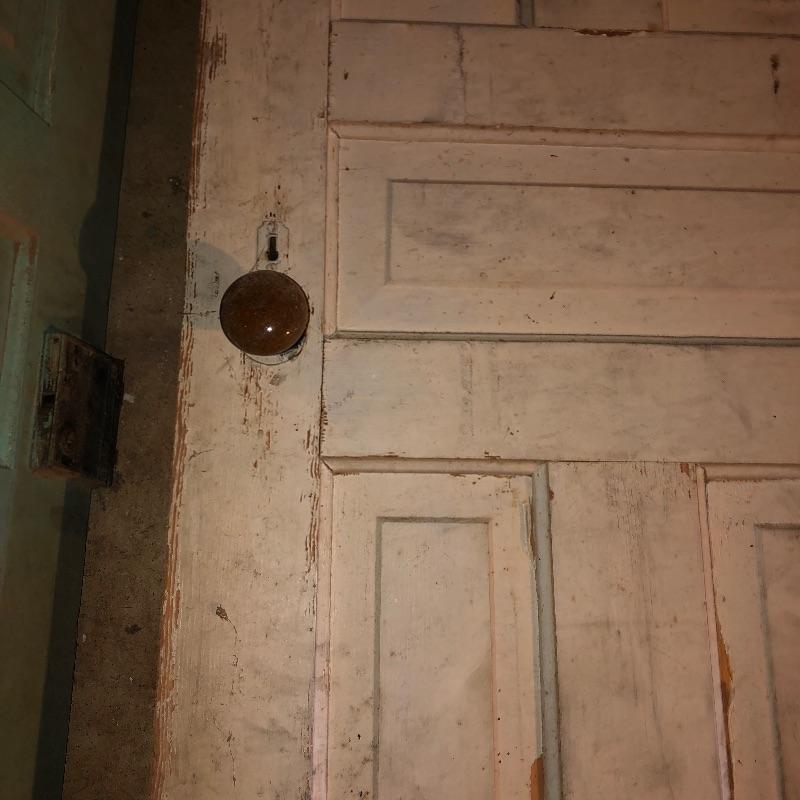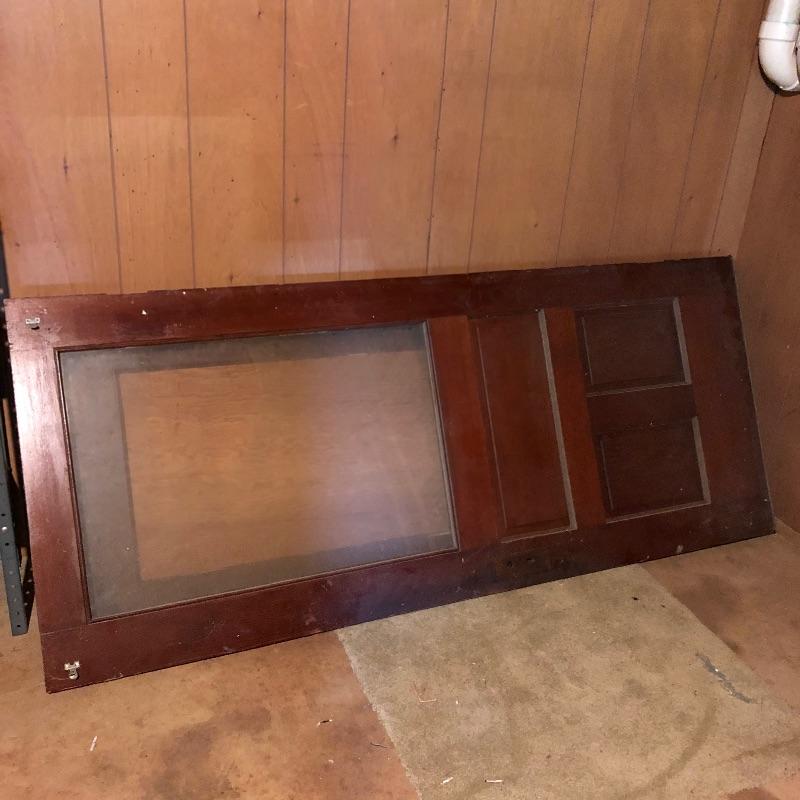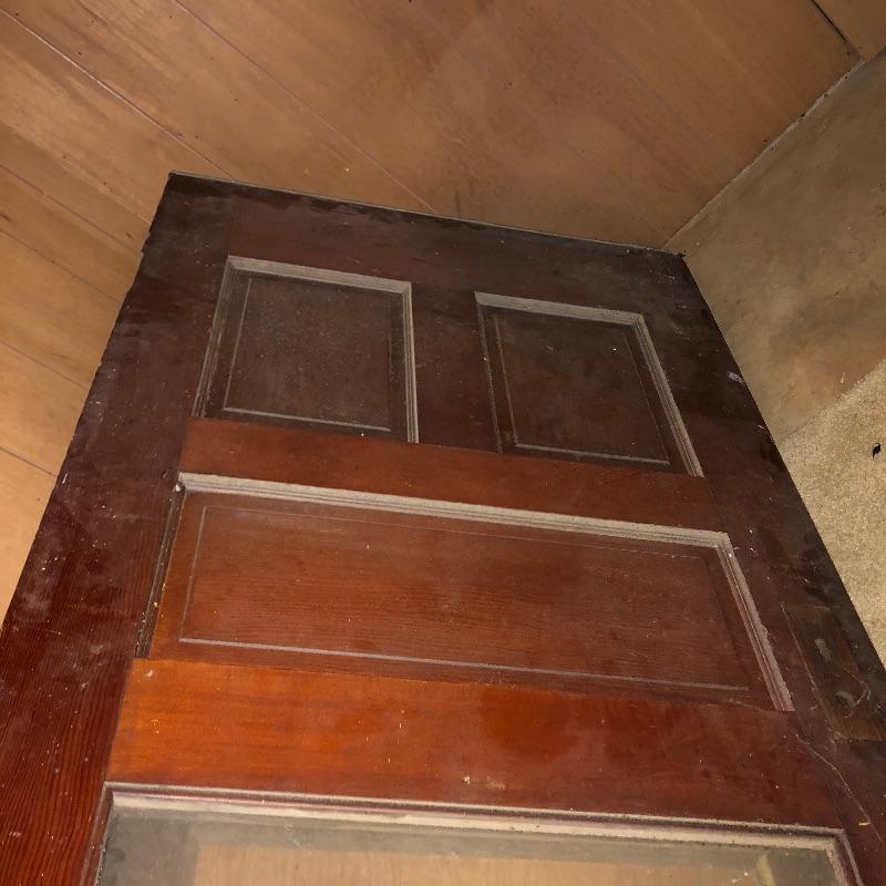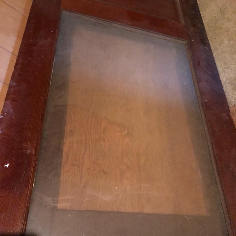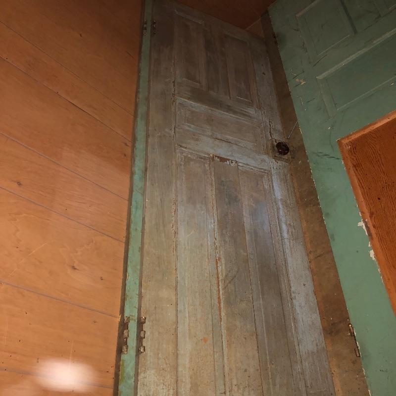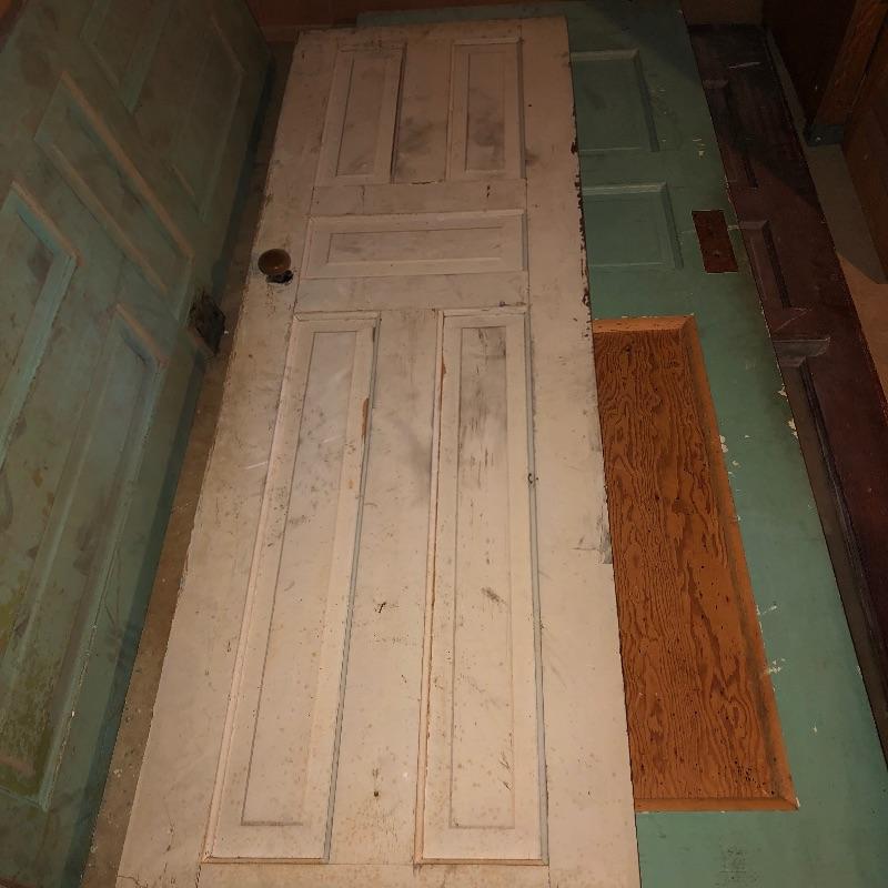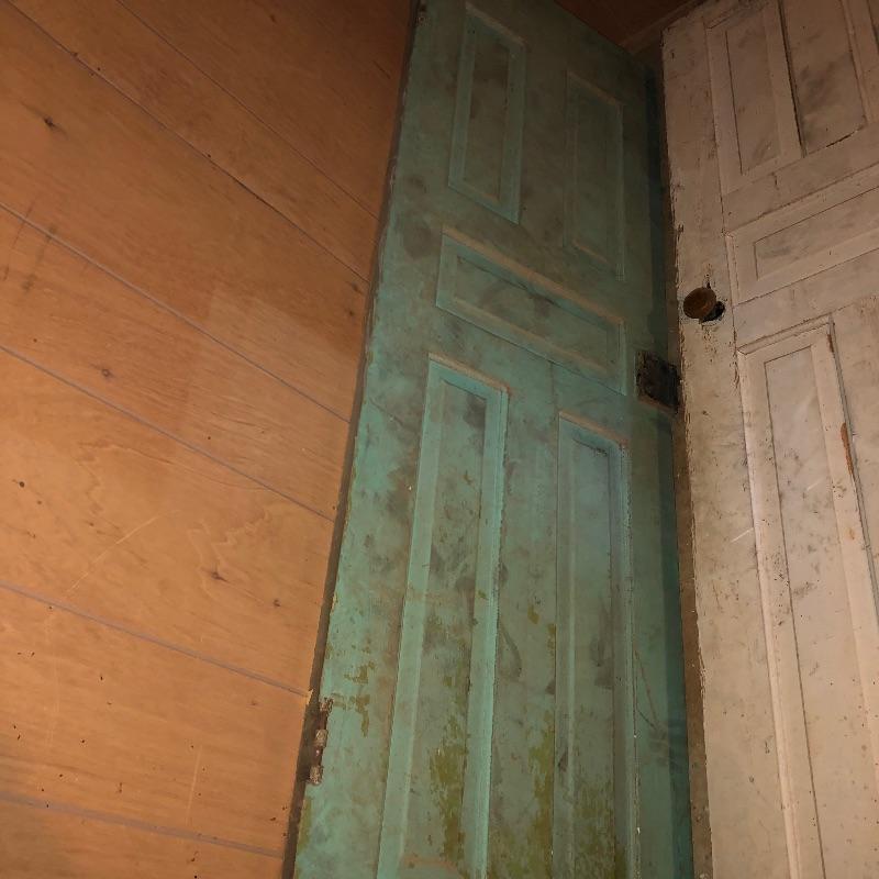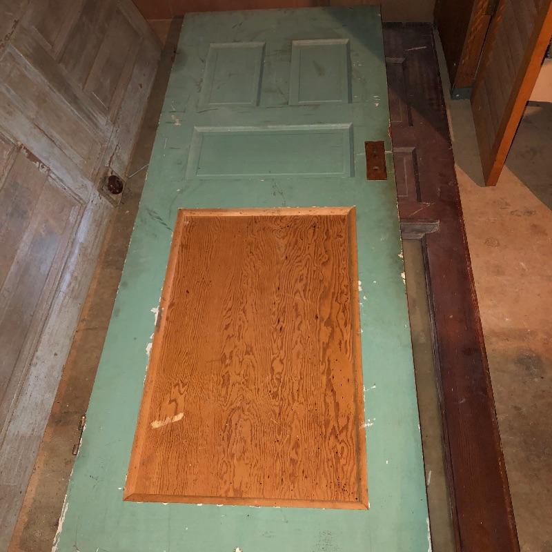 This lot includes four different size antique wooden doors. The largest door is about 80.5in x 33.5in has glass and is in good shape. Medium door measures about 77in x 30in and has green paint on one side and is not in the best condition but can be cleaned up. The two smallest doors are painted green and grey but wood is still in decent condition and can be easily fixed. They measure about 72in x 24in. One of the smaller doors has a nice brass like doorknob. No shipping