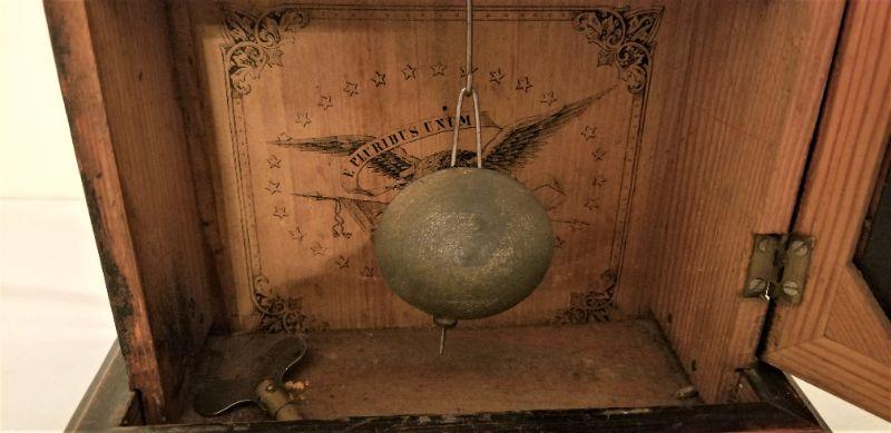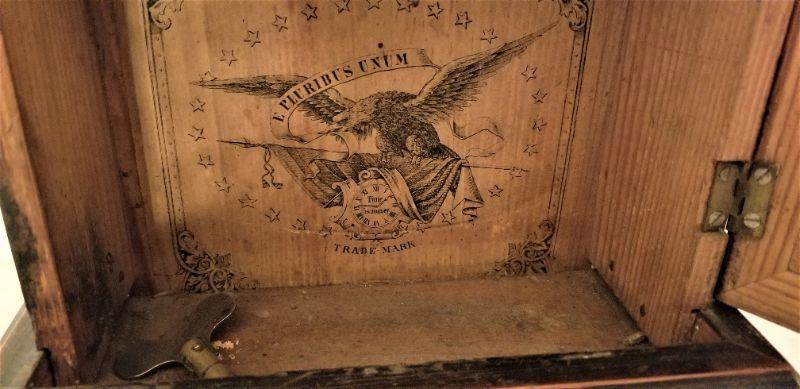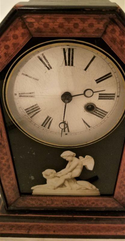 This good looking antique mantel clock with key is NOT over wound, but is a project piece. I believe the pendulum is a little "off kilter" and thus prevents the clock from continuing to "tick." This clock is strictly for telling time - it doesn't chime. Original labels inside. Nice inlay work - very attractive. 12" tall, 8.5" across.