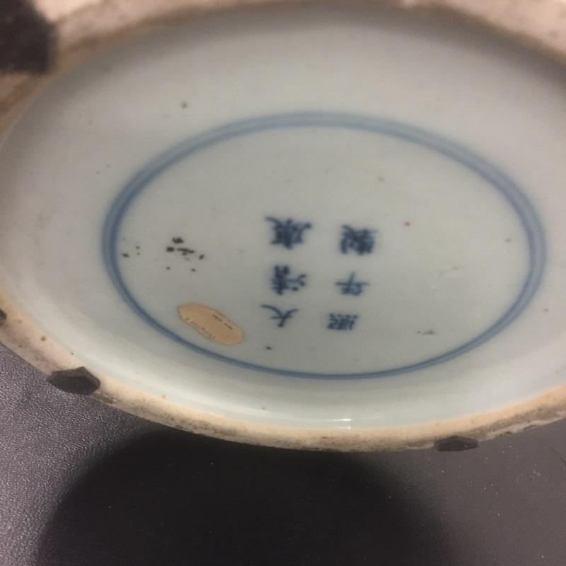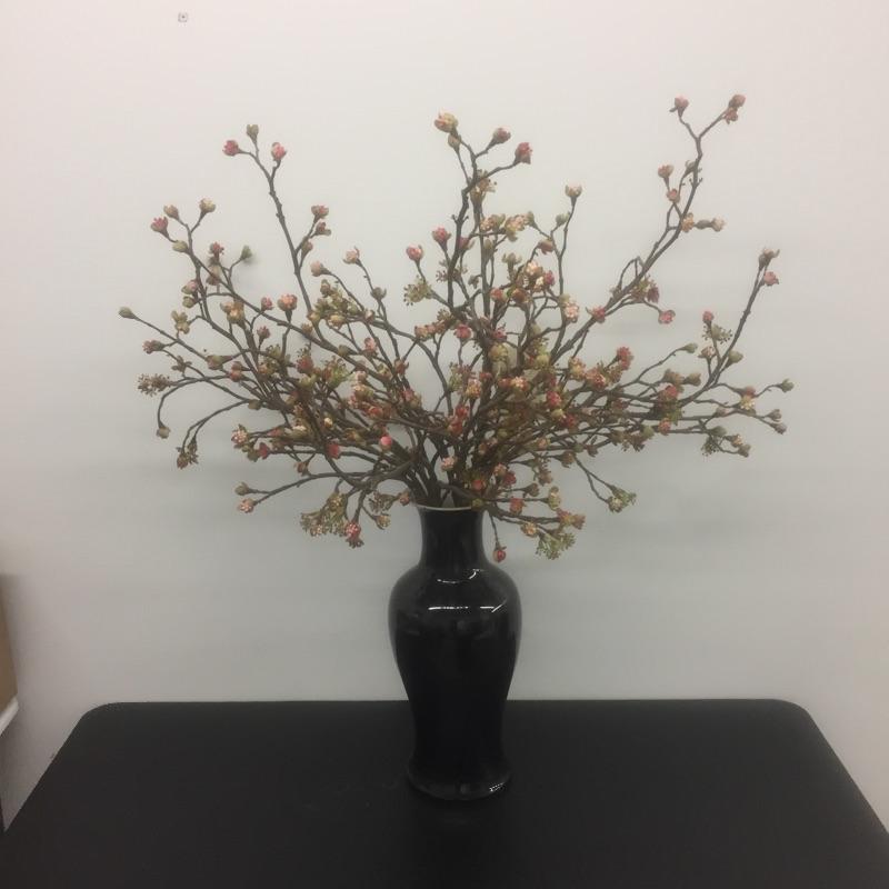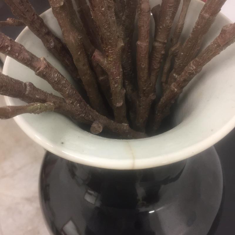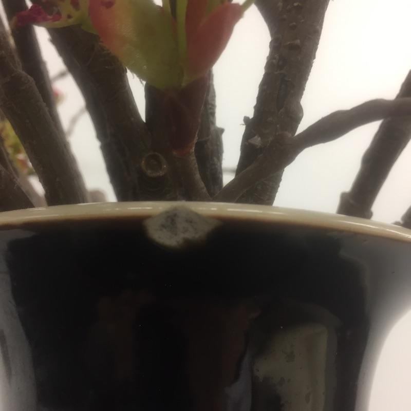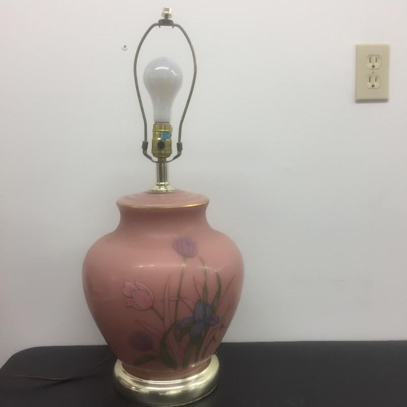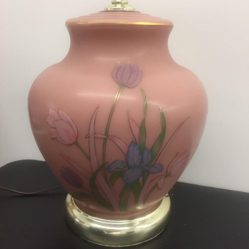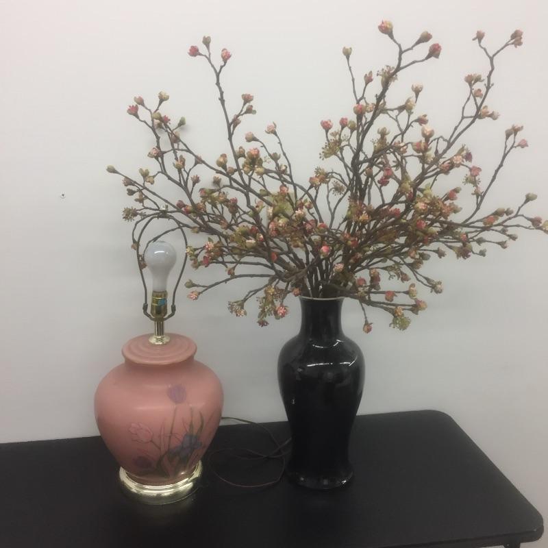 Engaging black Asian vase with lovely blooms and lamp. Vase has small chip and crack-See pictures.