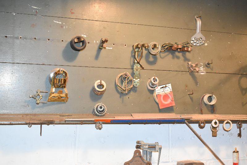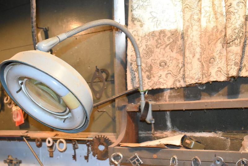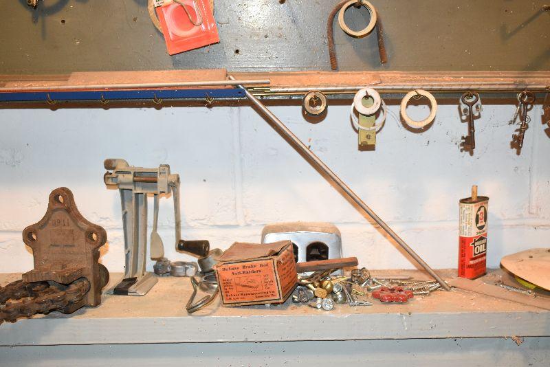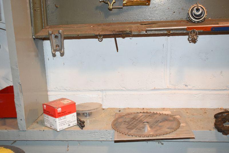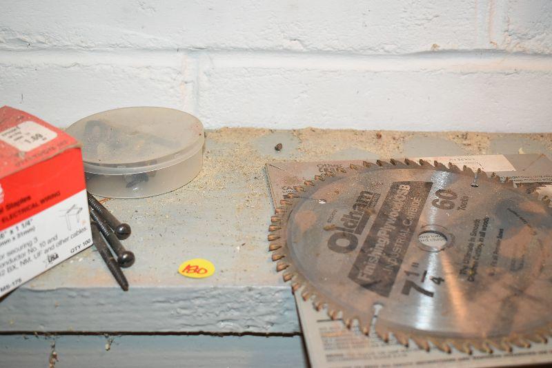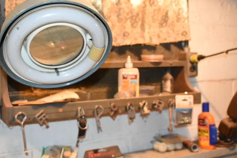 Saw blade, vintage keys, bench lite, untested, and more. Bring box to remove from basement.