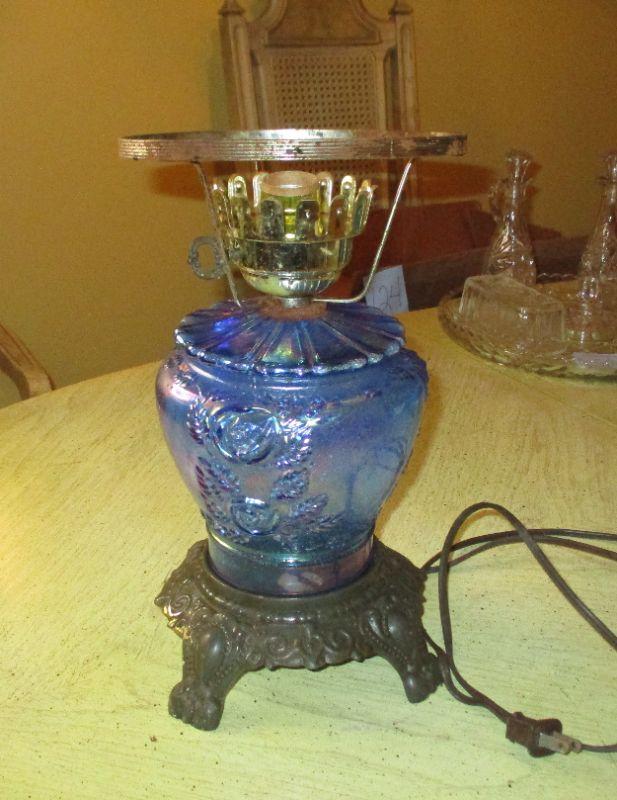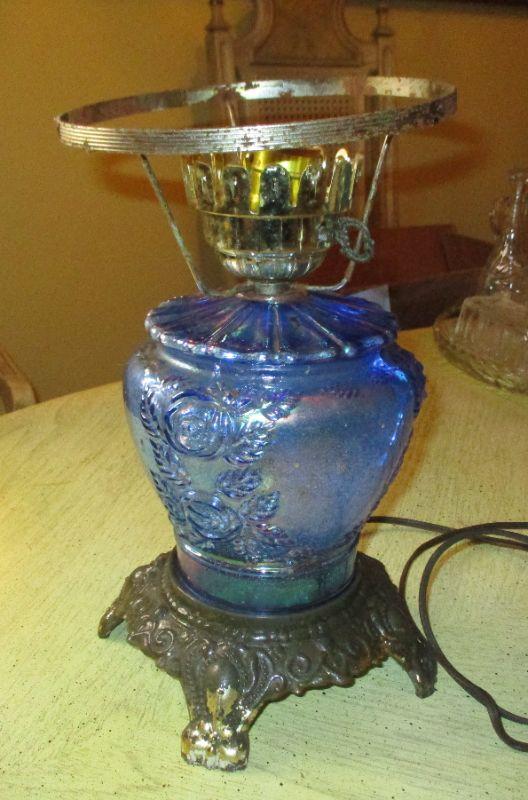 Bottom is plastic (not metal). The blue is glass and the light works. It is about 12" tall and he upper rim does have some metal discoloration.