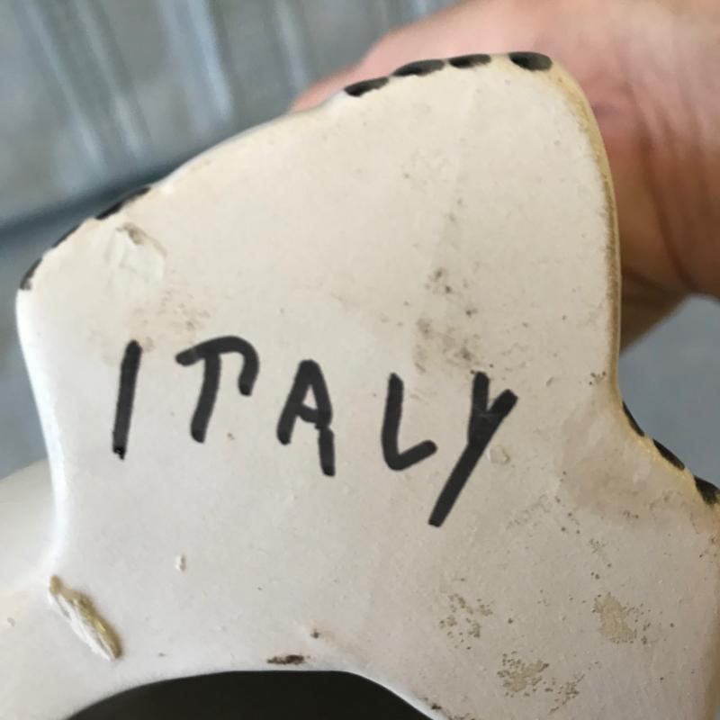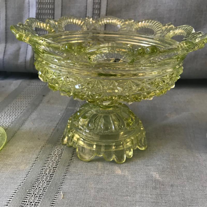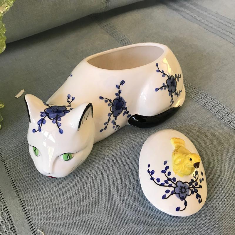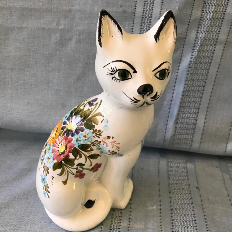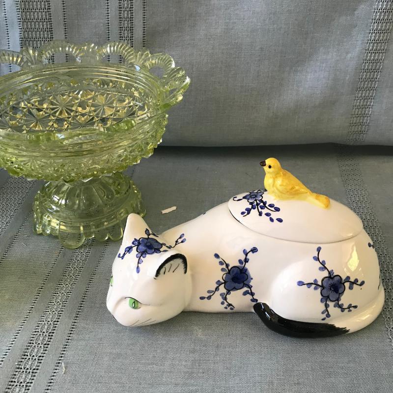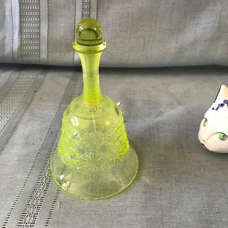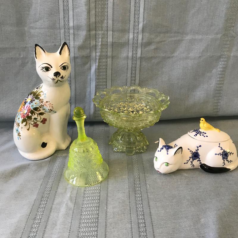 Two ceramic cats, the taller one is from Italy and approx. 11” tall. Yellow glass bowl is approx. 8” in diameter and 5.5” tall. Lot also includes yellow glass bell. Both look to be vasoline Glass. Shipping available or local pickup.