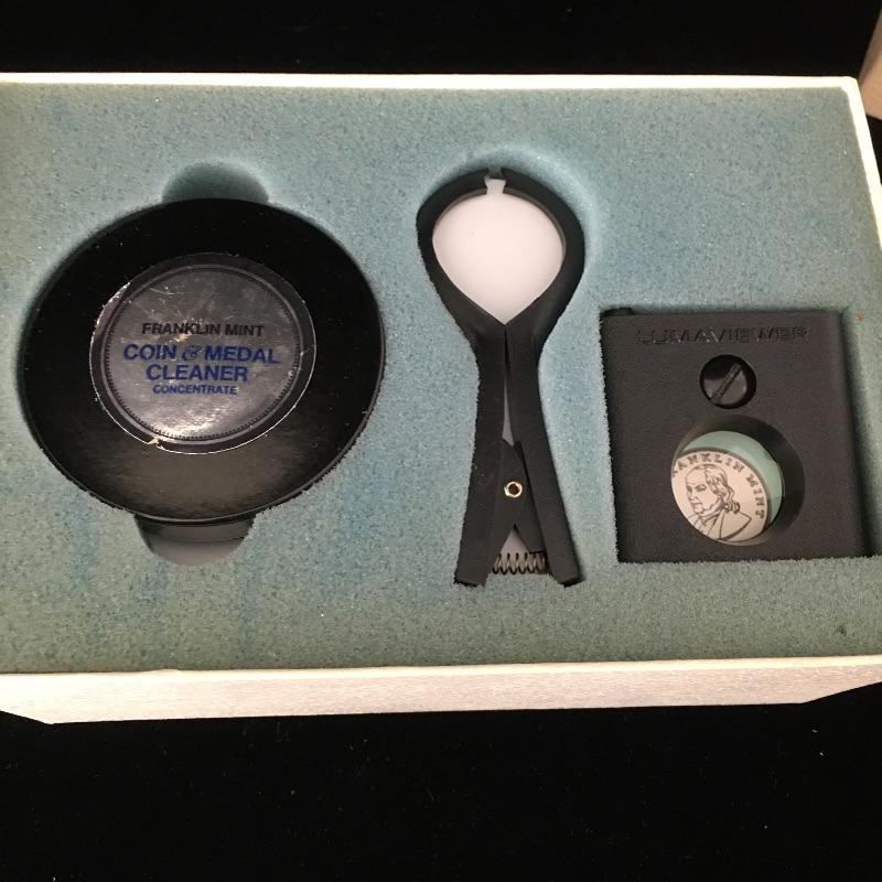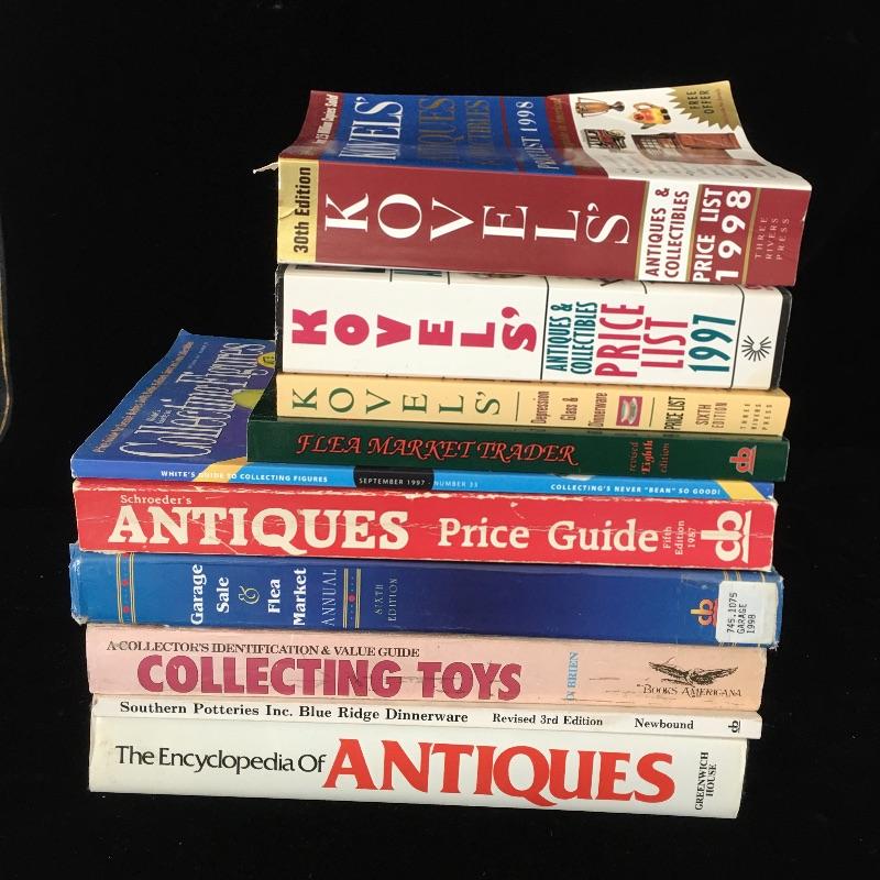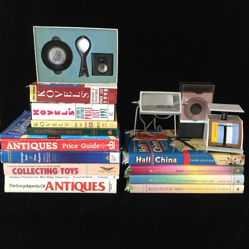 Collectors resource books and more. Lot includes scales in grams and ounces, Bausch and Lomb magnifying light, Franklin Mint collectors kit. Also includes books on McCoys pottery, Halls China, flea market trader and more.