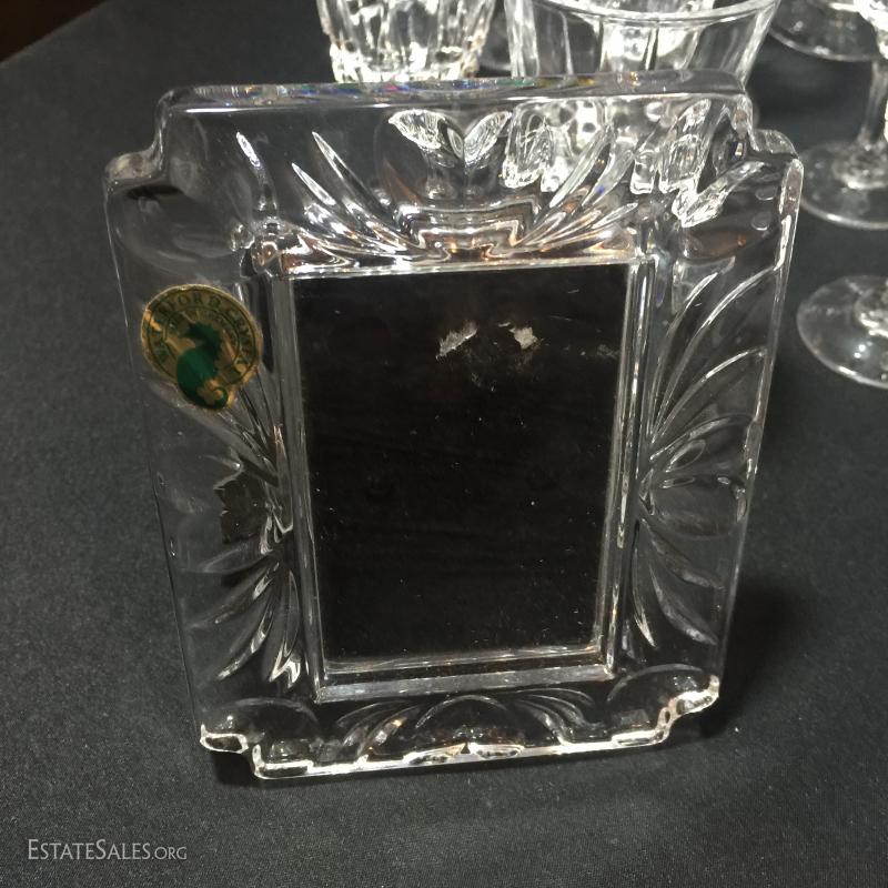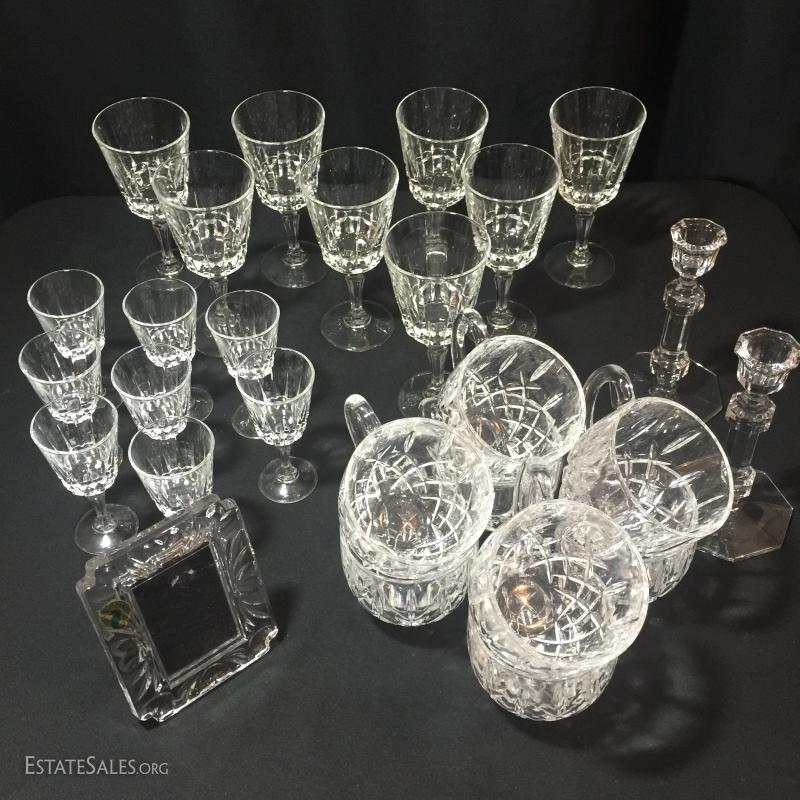 Large lot of misc crystal: 8 coffee, 2 candlesticks, 1 picture frame, 8 wine, 8 cordials.