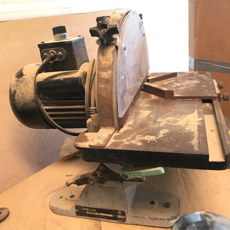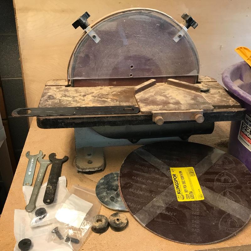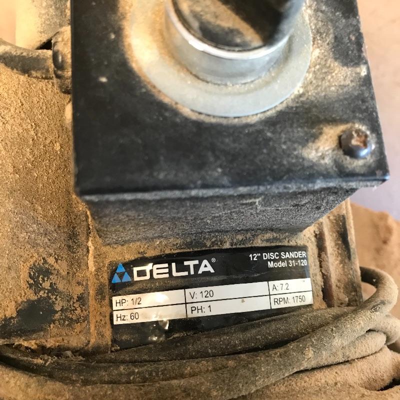 Delta 12” disc sander model 31-120. Works when turned on. Includes Klingspor 5pk sheets, tools and hardware shown in photos. No shipping.