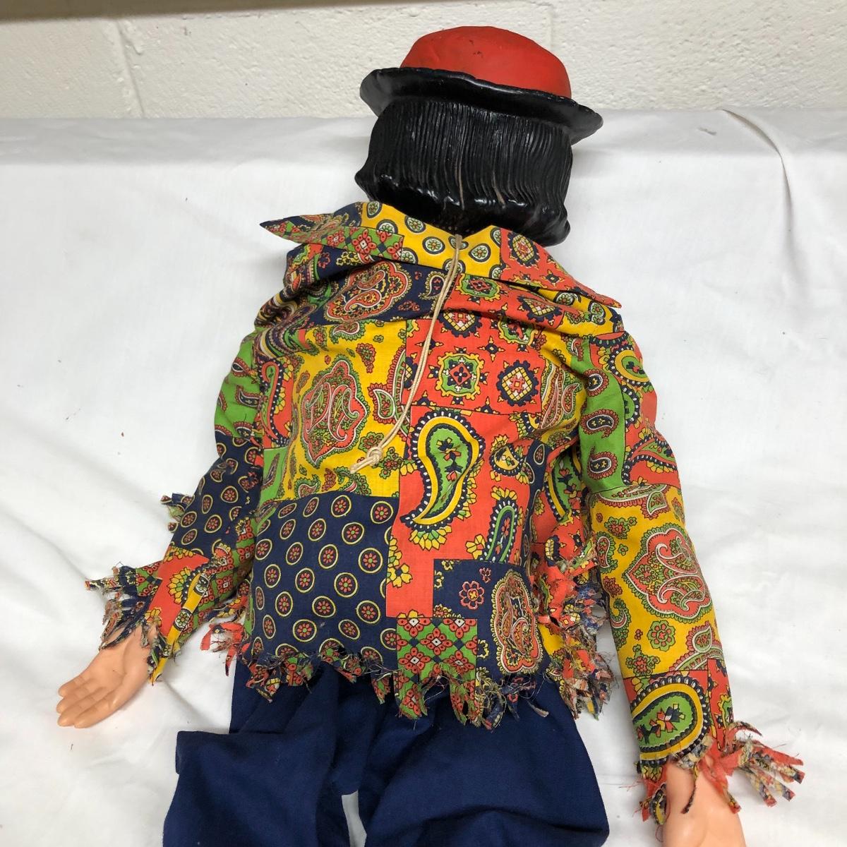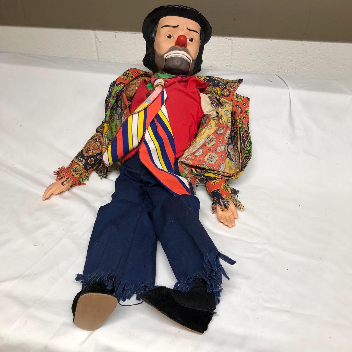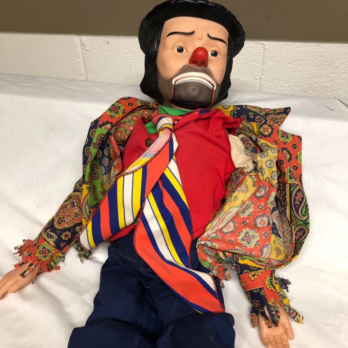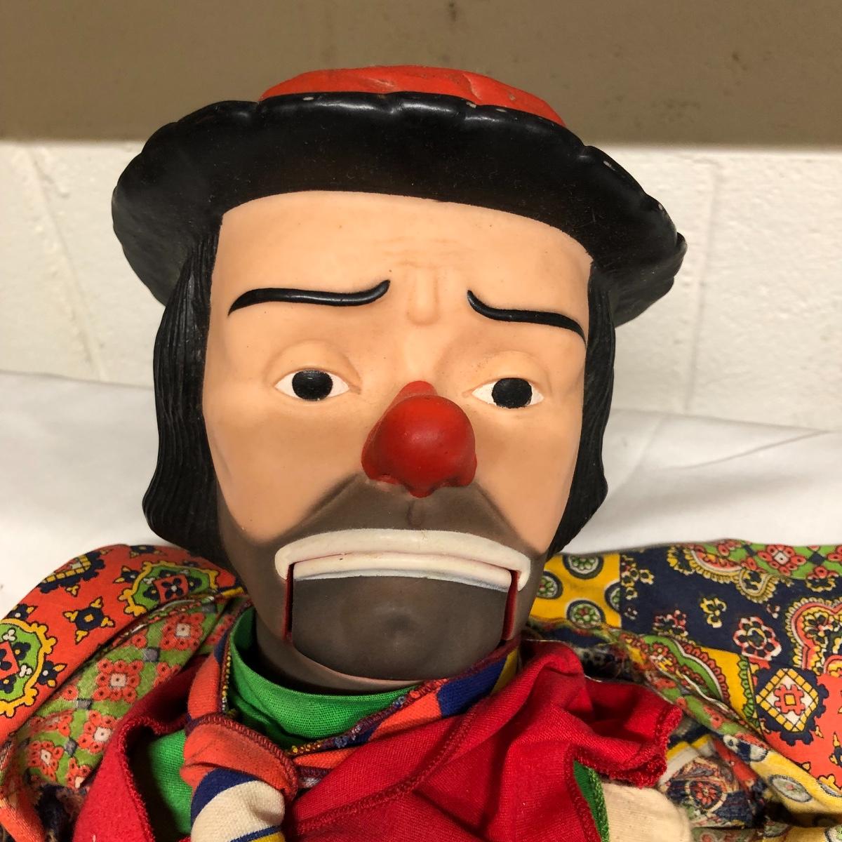 This will bring back memories of your childhood. Lot includes Emmett Kelly Ventriloquist Doll by Juro novelty co. that has string in back with moving mouth. Doll measures 6” x 9” x 28”.