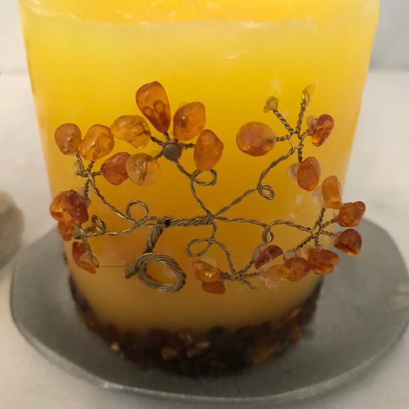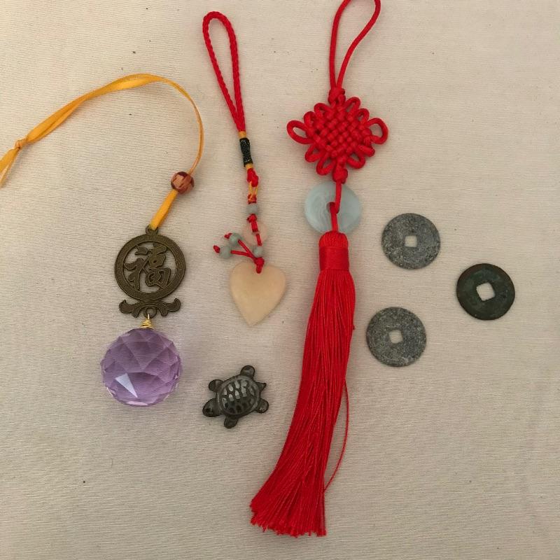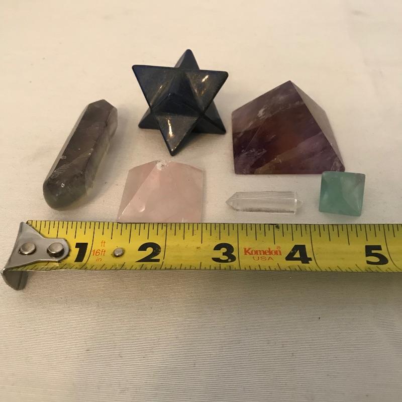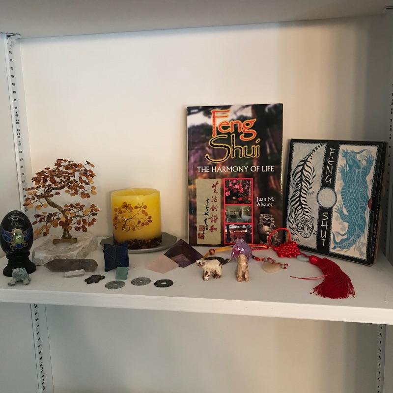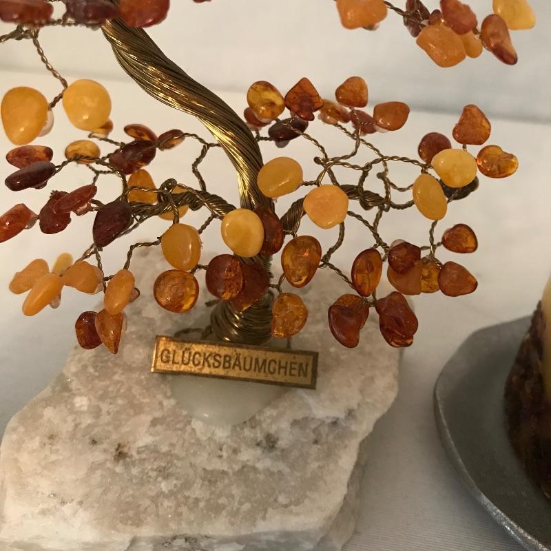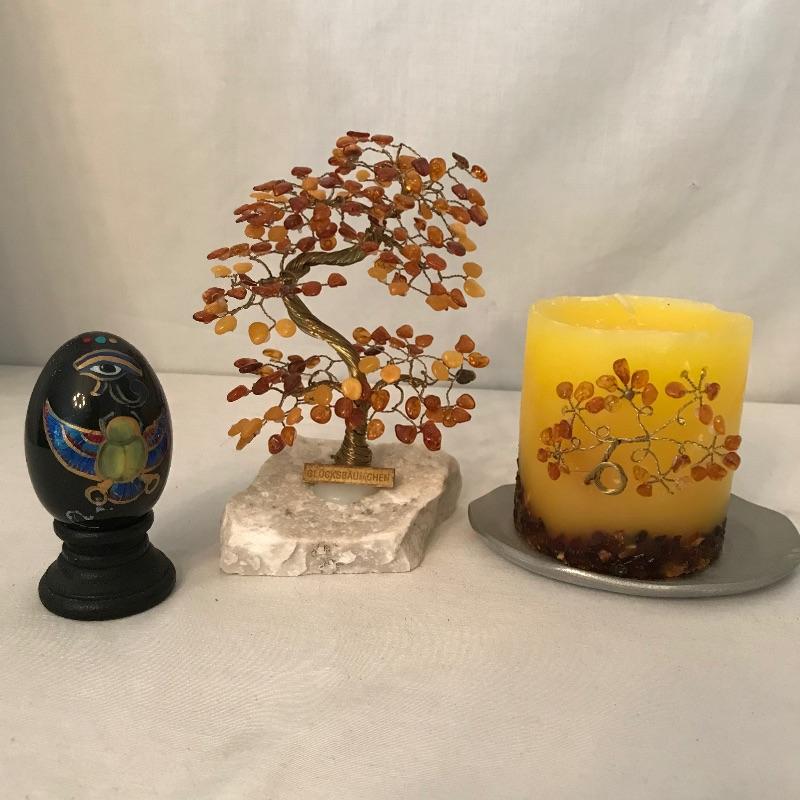 There are lots of lovely decorative pieces here. Included are some carved and shaped crystals and stones including pendants. A simply stunning small amber color beaded tree is set on a heavy base with a label that reads Glucksbaumchen. Small incense burning frog is heavy and likely metal or stone. An amber accented metal art on a candle accent. Two feng shui books with cards included to help you find the perfect spot for your new treasures. See photos. Shipping available.