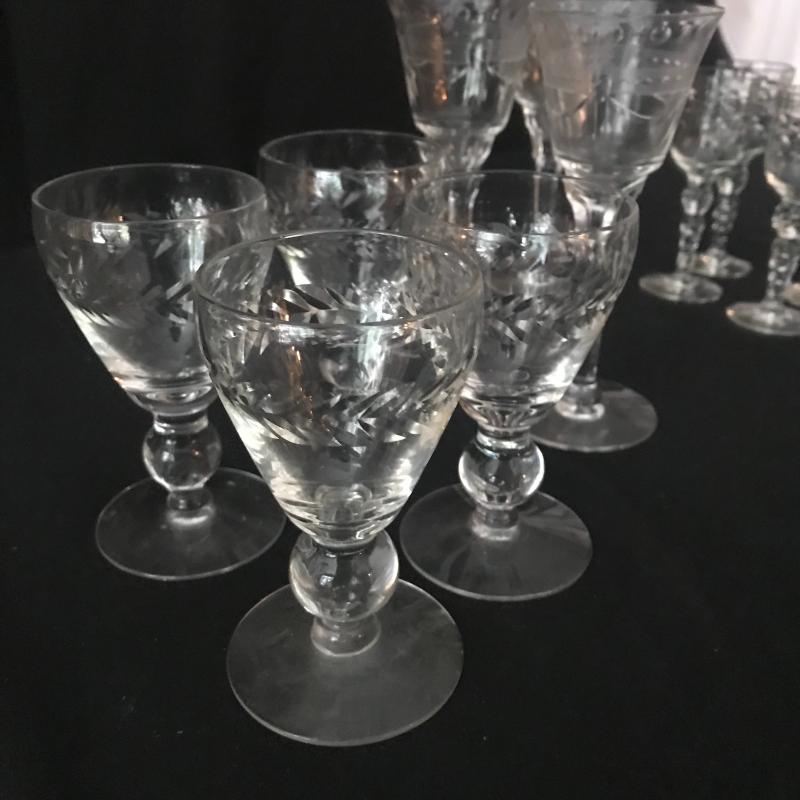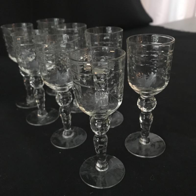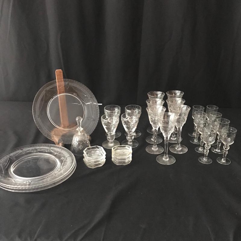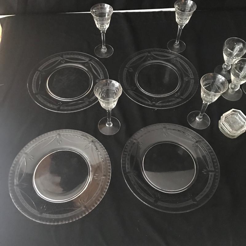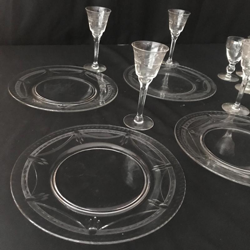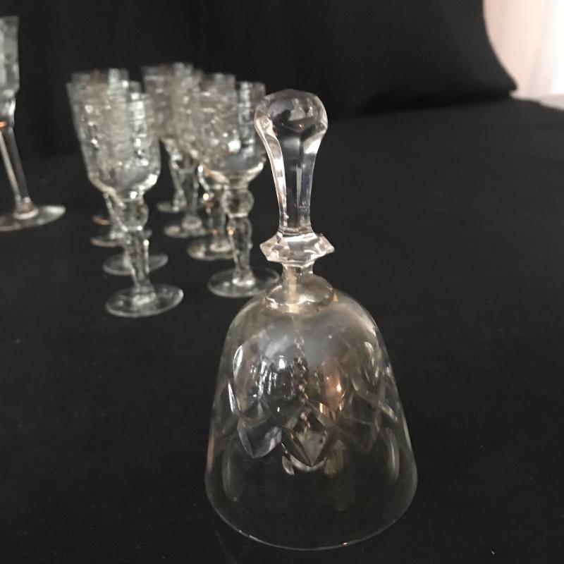 Three sets of cordial glasses with one having 4 matching plates. Also a glass bell. All in excellent condition. Shipping available.
