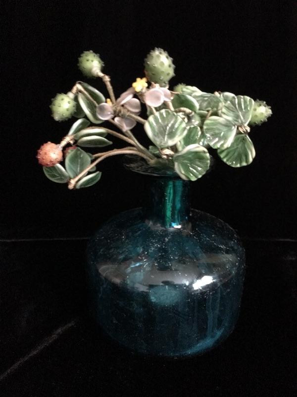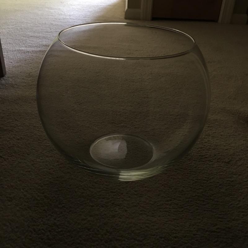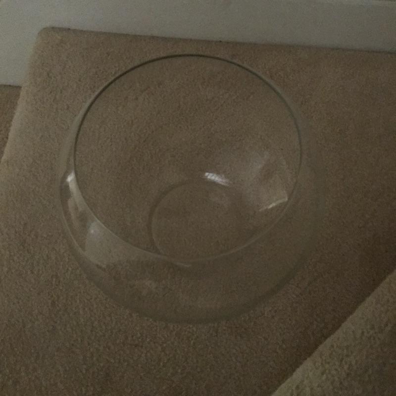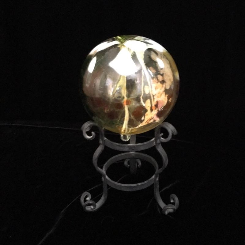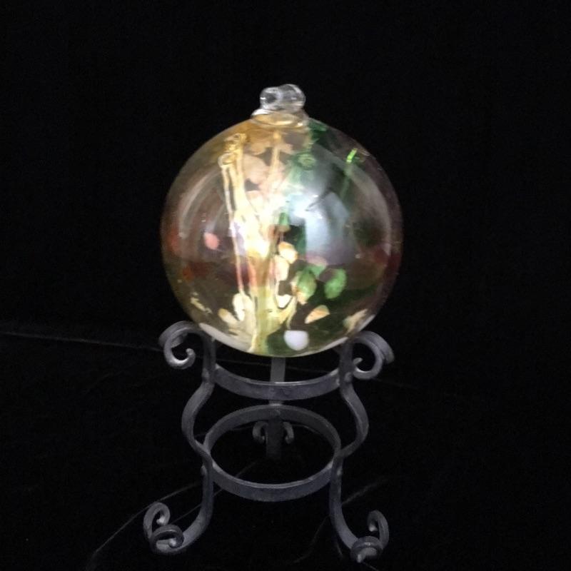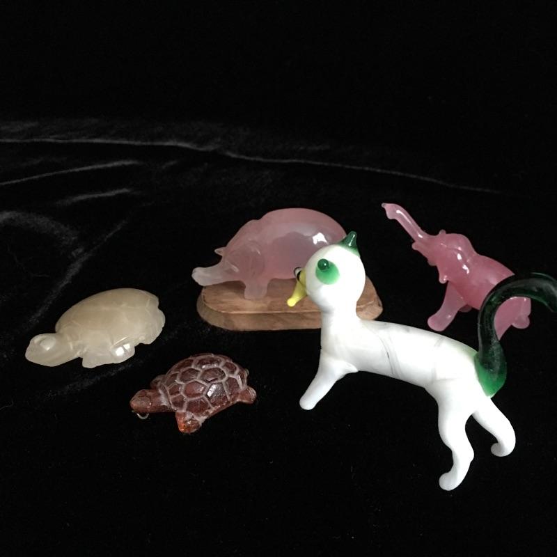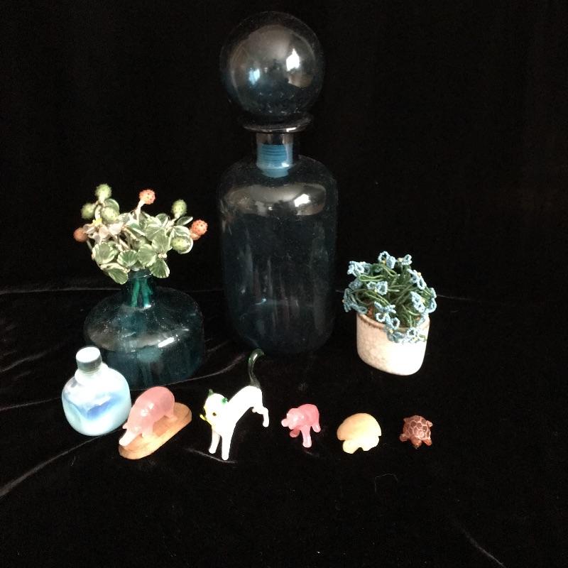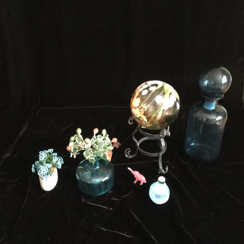 Large glass bowl, five small animals, blue decanter two with faux flowers and stunning round glass ball on a stand with decorations on the inside and outside. Blue decanter measures 11.5” tall x 3.5” D and large glass bowl measures 10” tall with a 12” D.