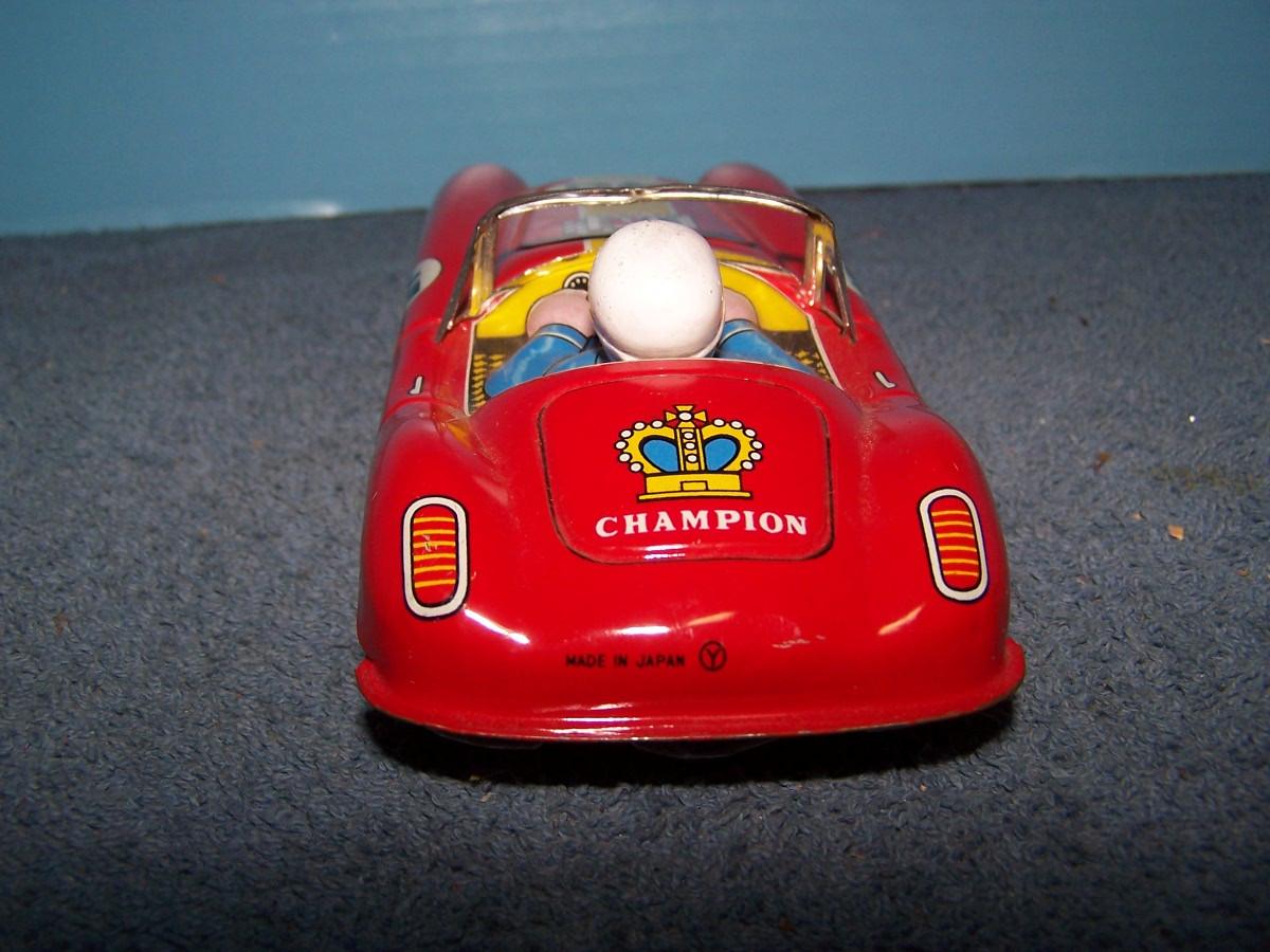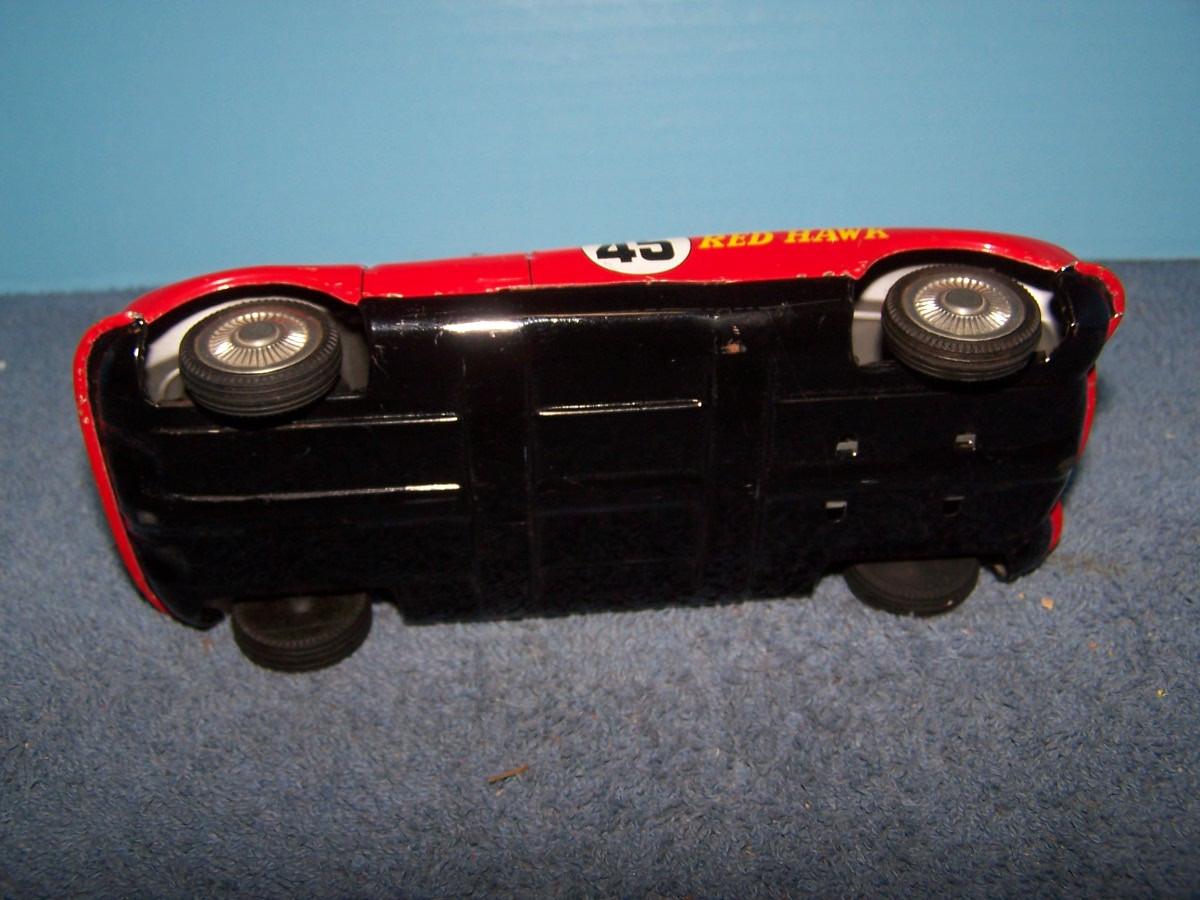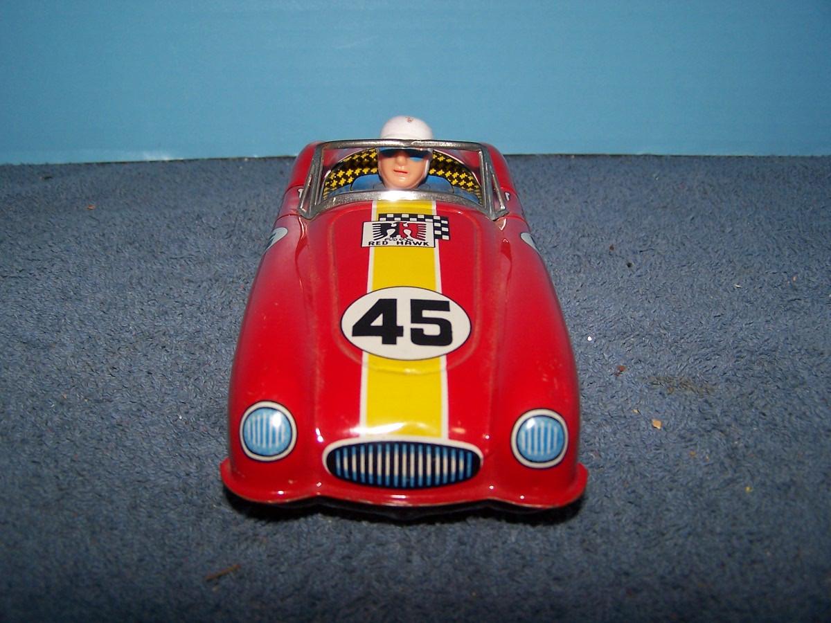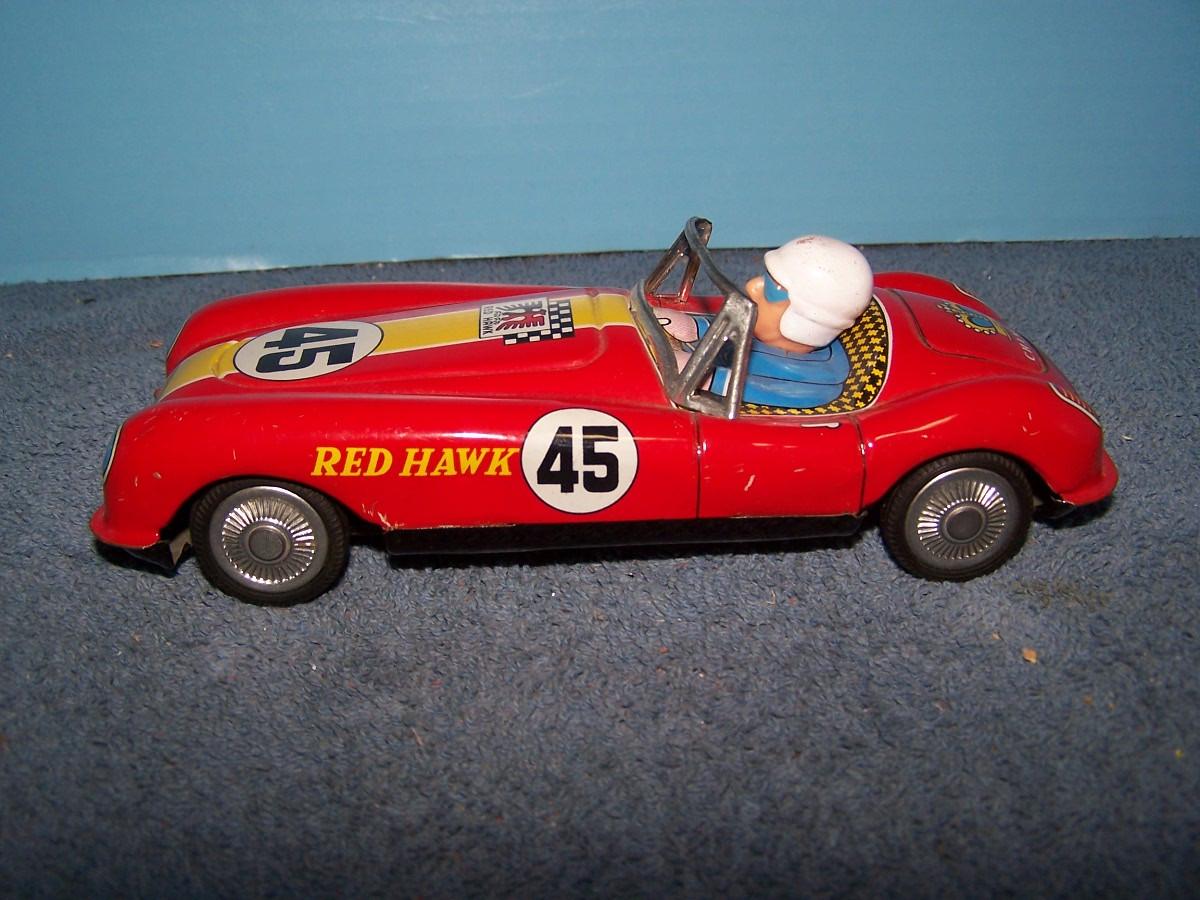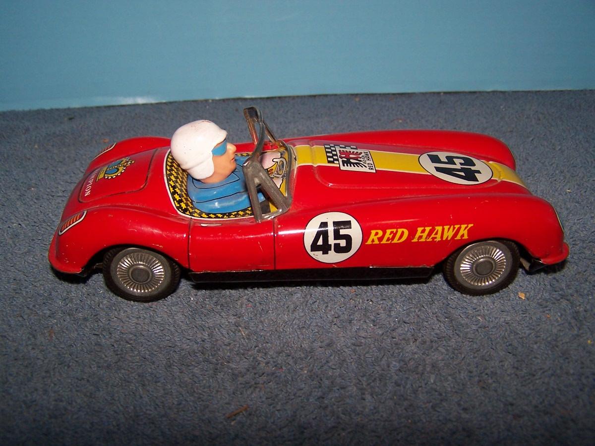THIS IS A GREAT VINTAGE TIN LITHO RED HAWK RACE CAR!!! 7 1/2''.. FRICTION.. ALL TOYS HAVE BEEN PLAYED WITH..