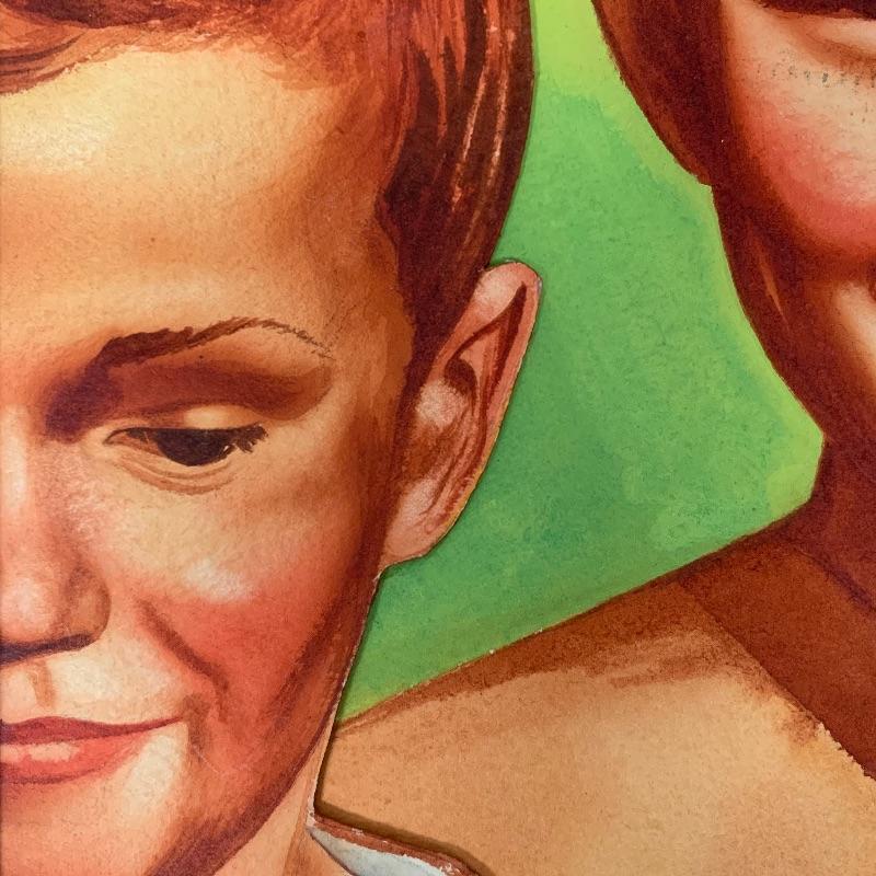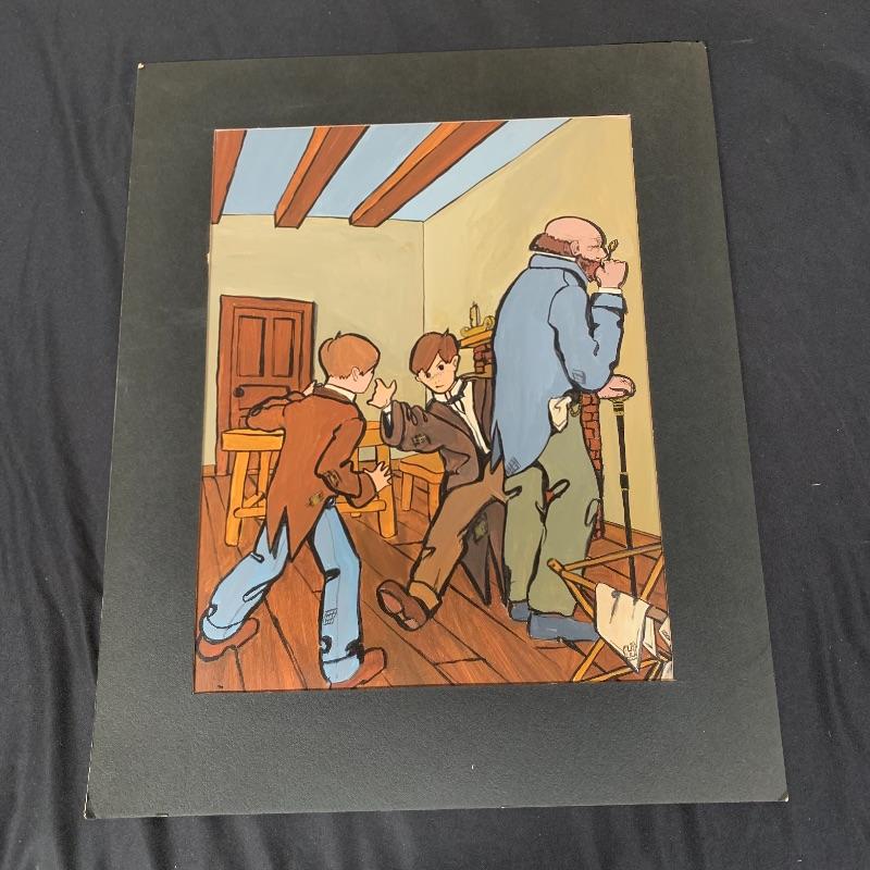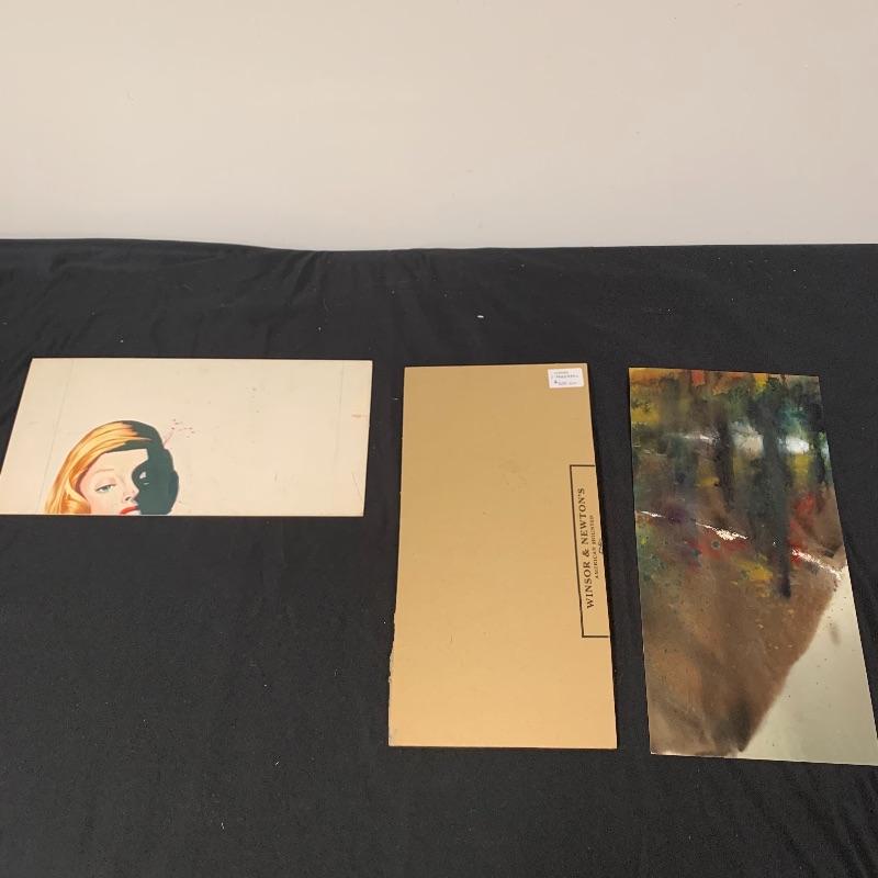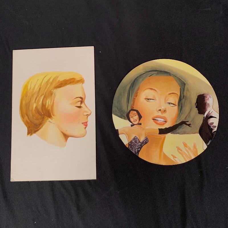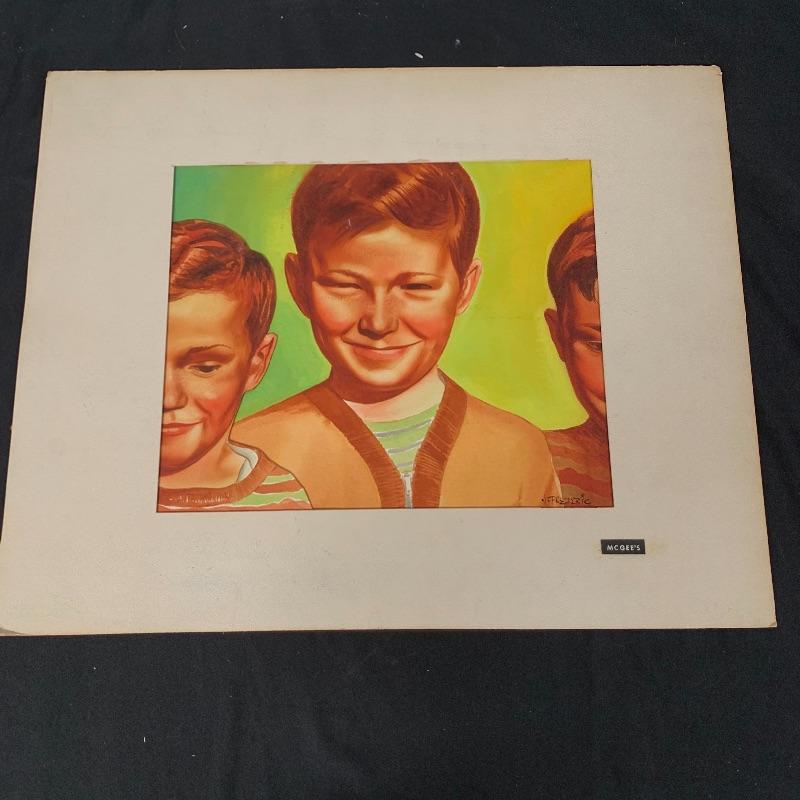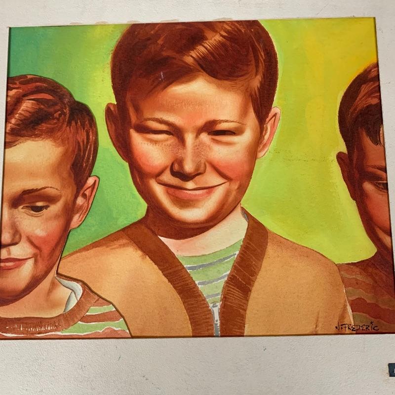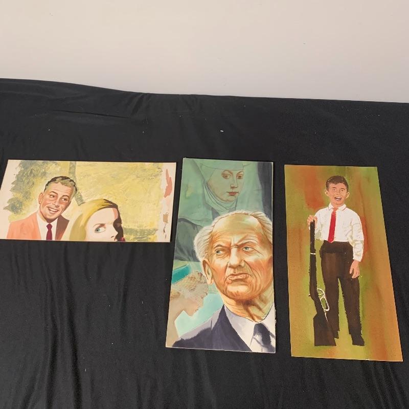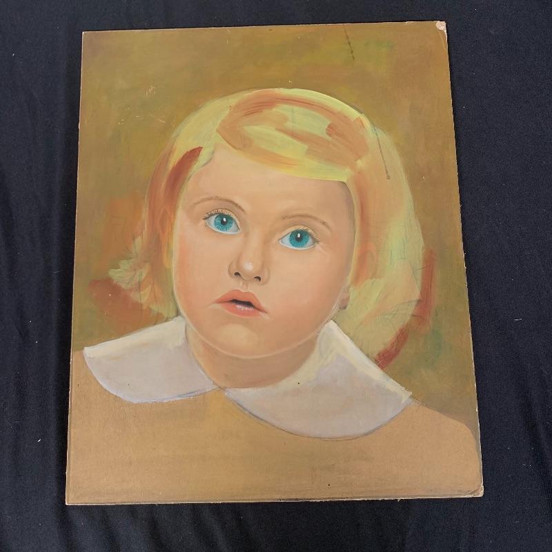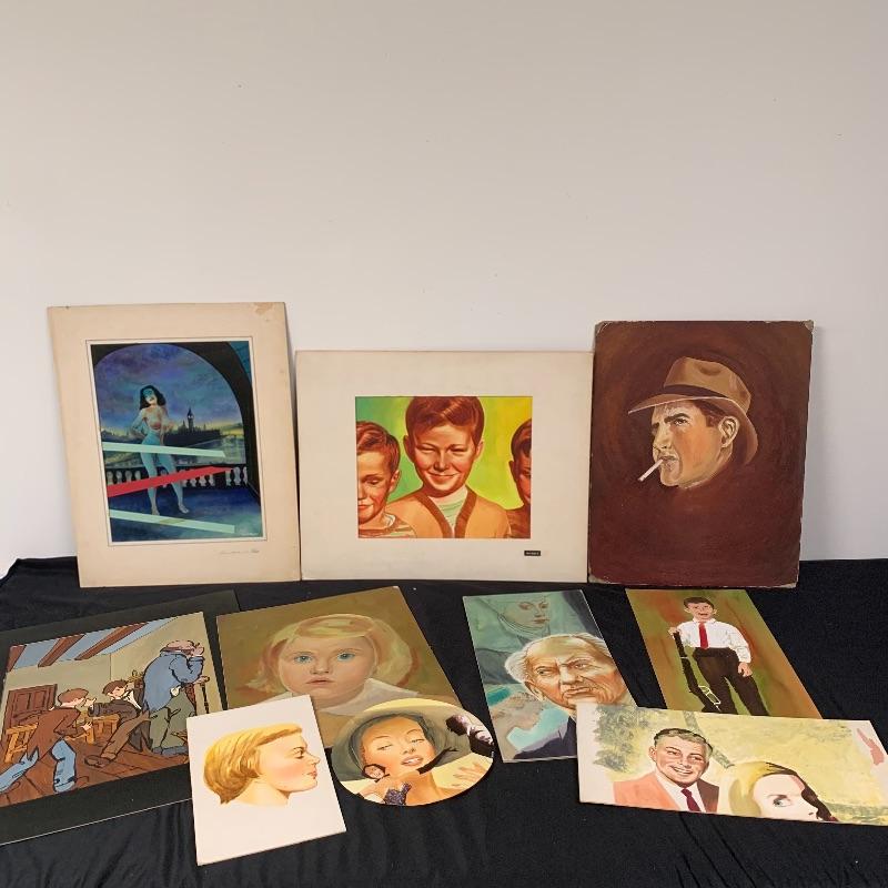 This lot includes 10 miscellaneous portrait paintings. Three of the portraits are mated and on boards, the circular one is on a paper like material, and the rest are painted on boards. Most of these pieces are signed by J. Fredrick or Mary Rosa and some don’t have a signature. The back of the portrait of three boys has a rip in the paper (see picture). The largest piece measures about 20in x 16in and the smallest one measures about 8in x 8in. Shipping available.
