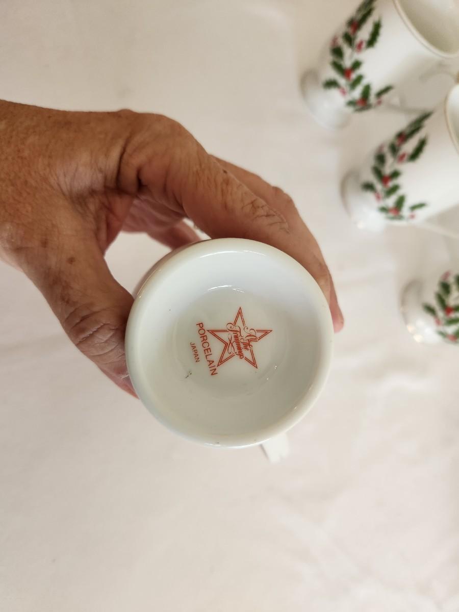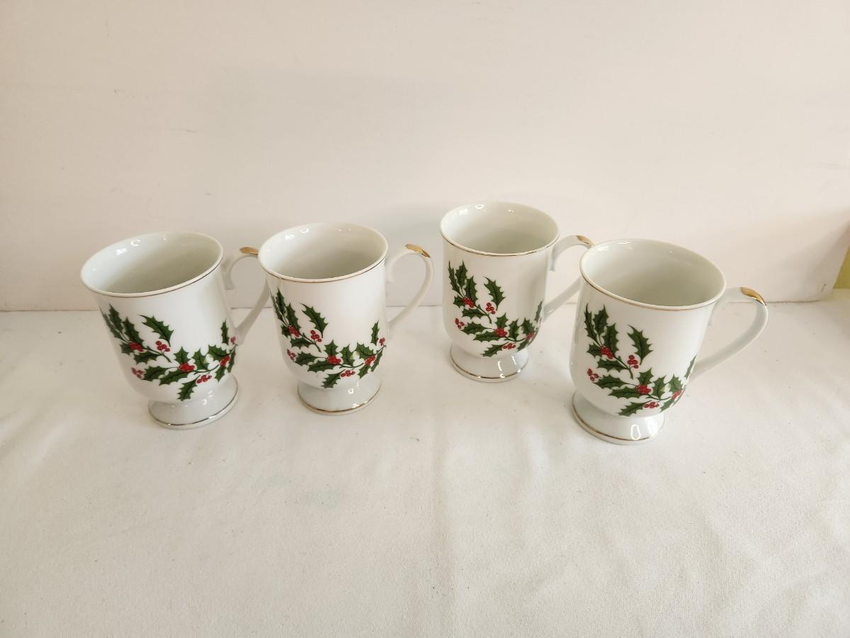 Lot of 4 "All the Trimmings" - Macy's brand - holiday Holly mugs. Each 4.5" tall - all in good condition. No box.