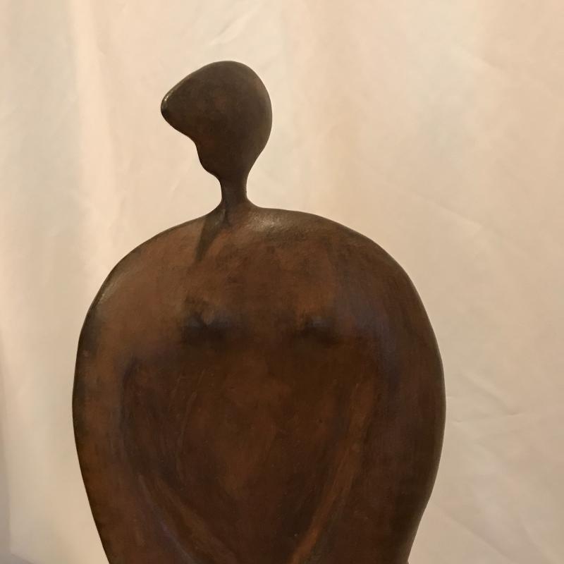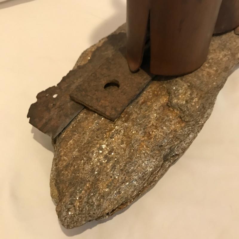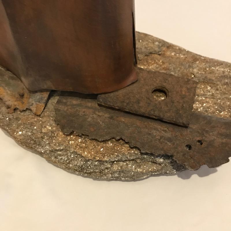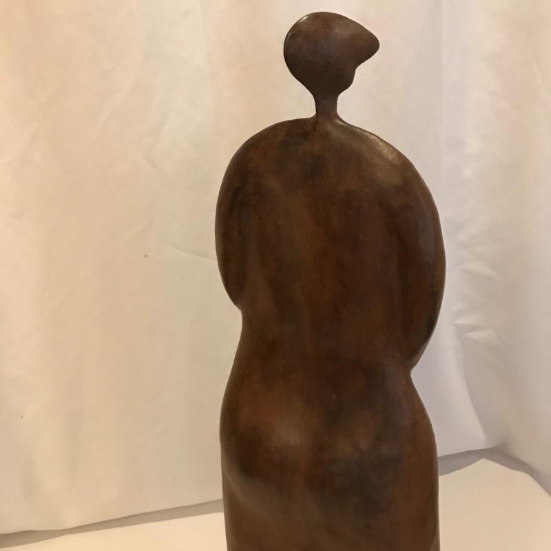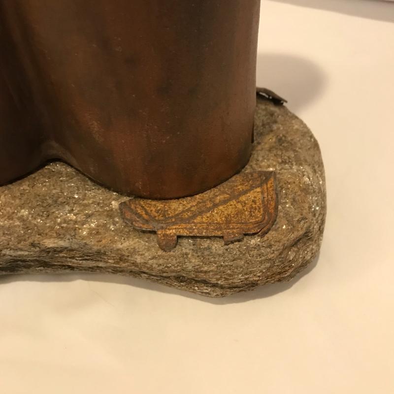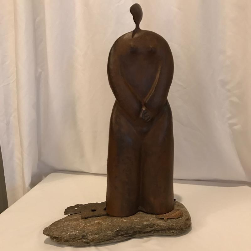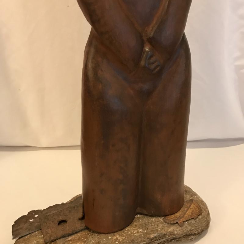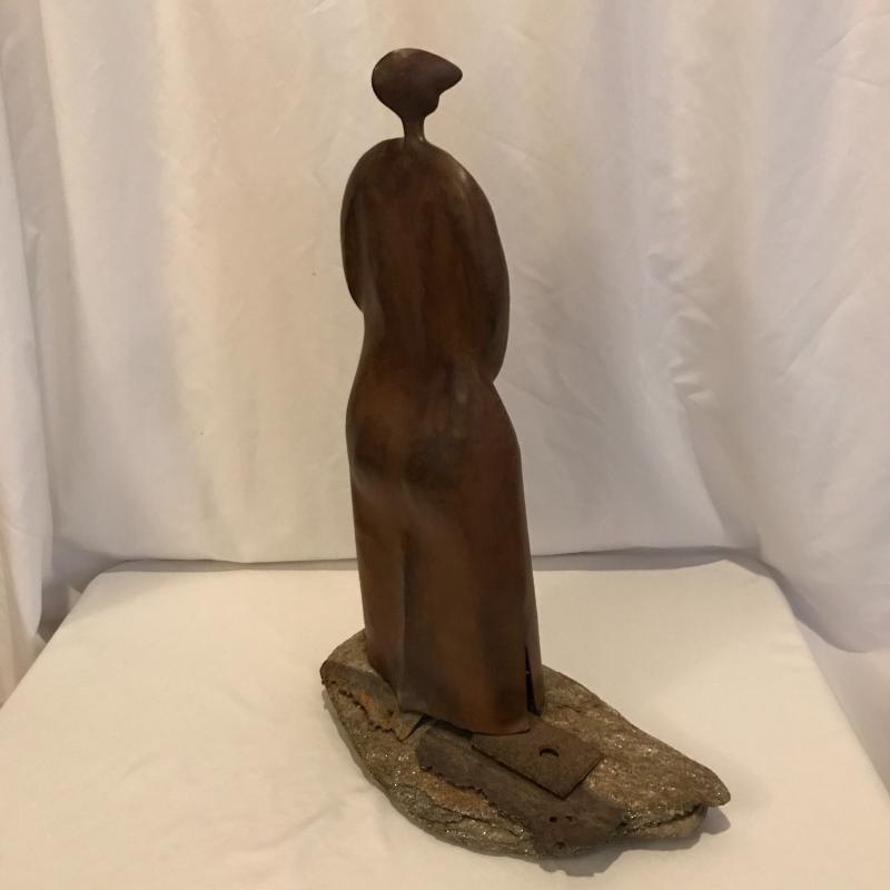Metal woman statue with bronze wash. Attached to a large rock. No signature of artist. No shipping. Local pick up only in Asheville. 16.5”l x 8.5”w x 25”h