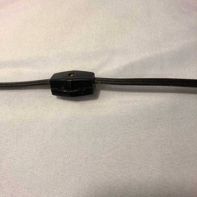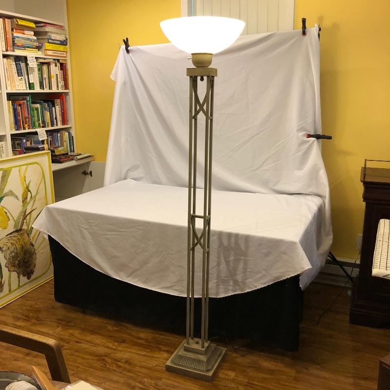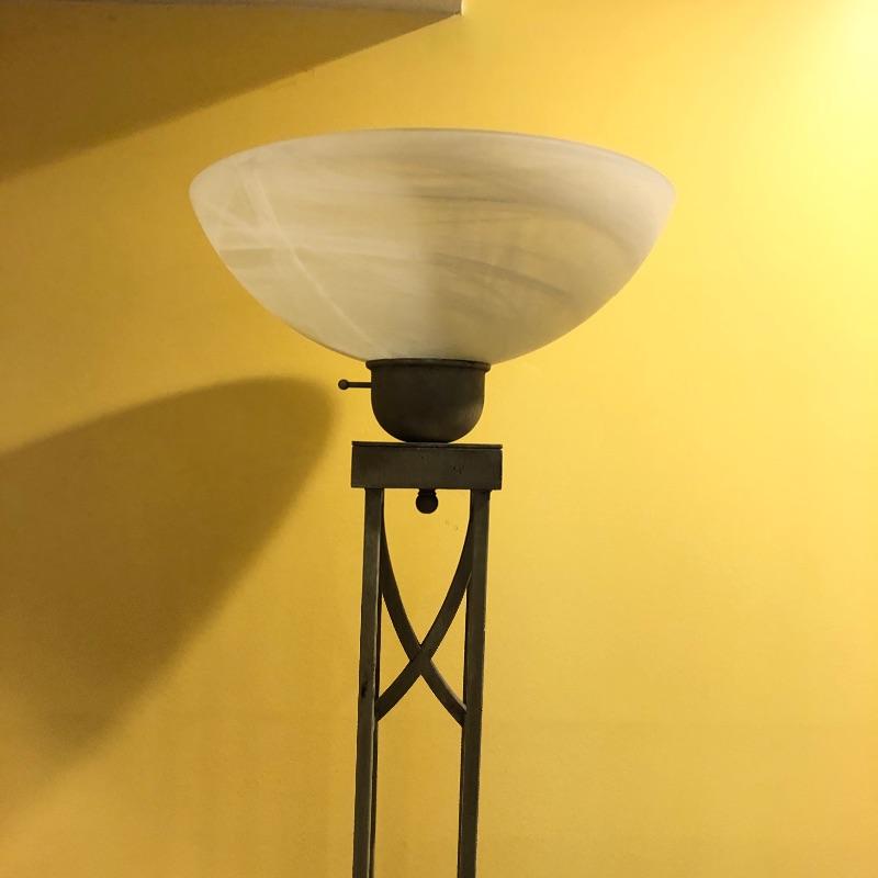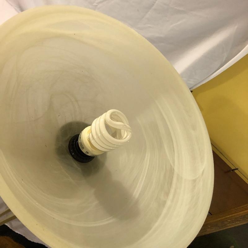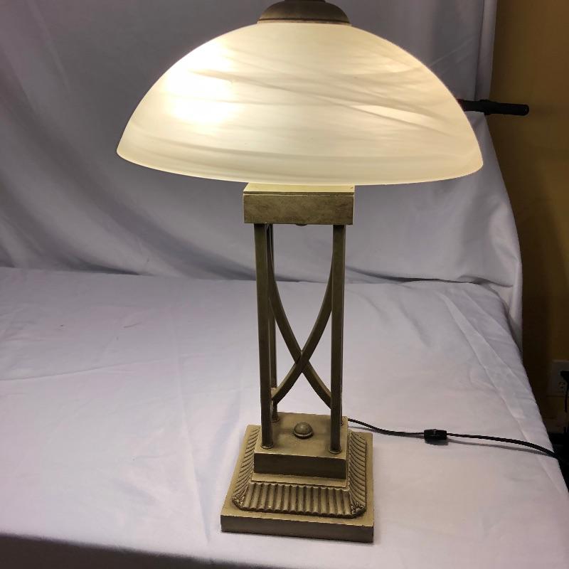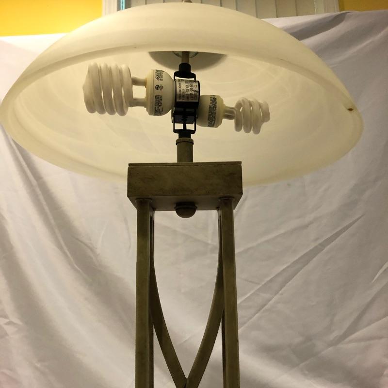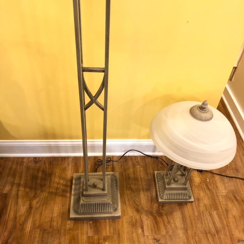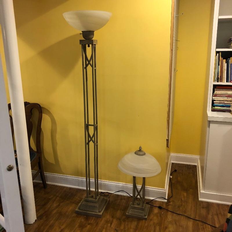This attractive duo of matching lamps have frosted white shades and very solid, heavy metal bases. The floor lamp with its upturned shade casts no shadows and the smaller lamp gives off great light with dual bulbs and an in-line switch for easy on and off.