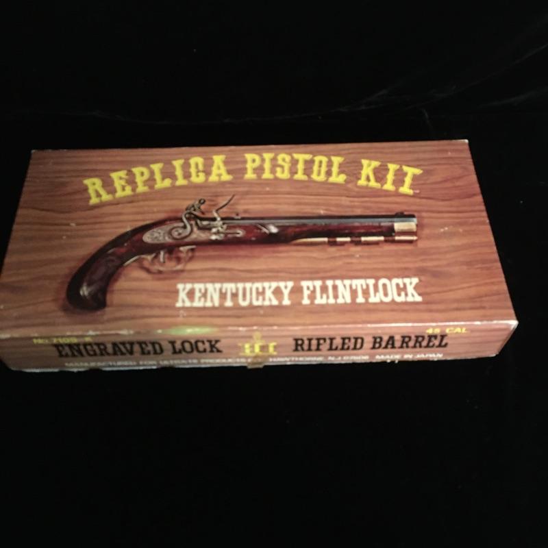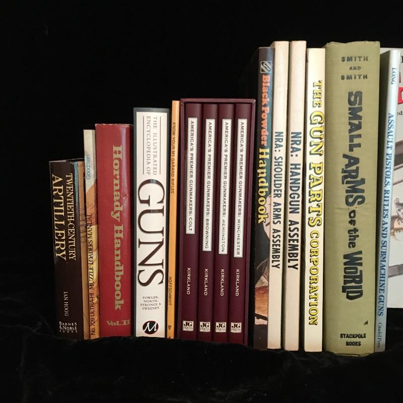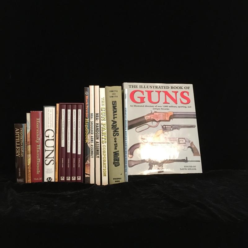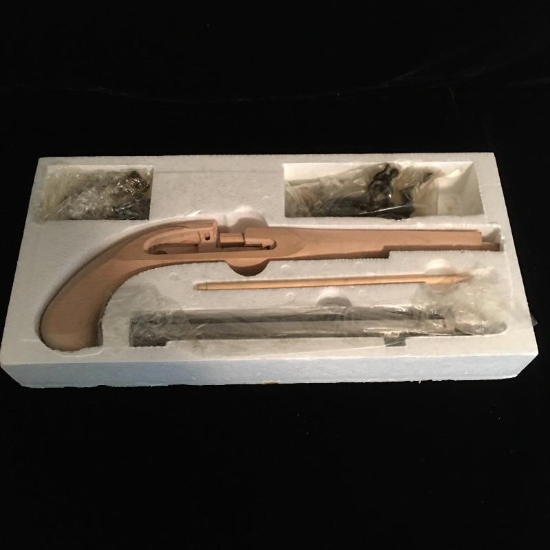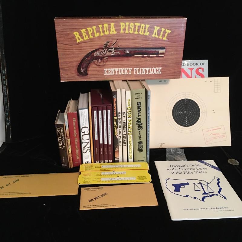 Replica pistol kit and gun books. Lot includes Kentucky flintlock replica pistol kit, array of books on guns, official 1984 Olympics shooting target, NRA bolo tie and more. A great lot for the gun enthusiast.