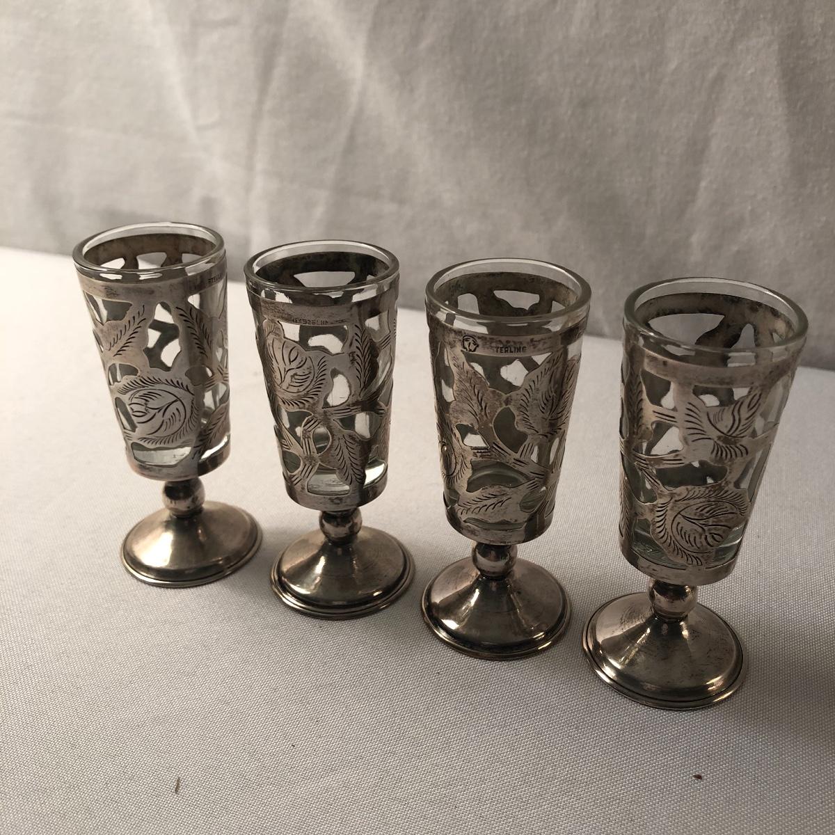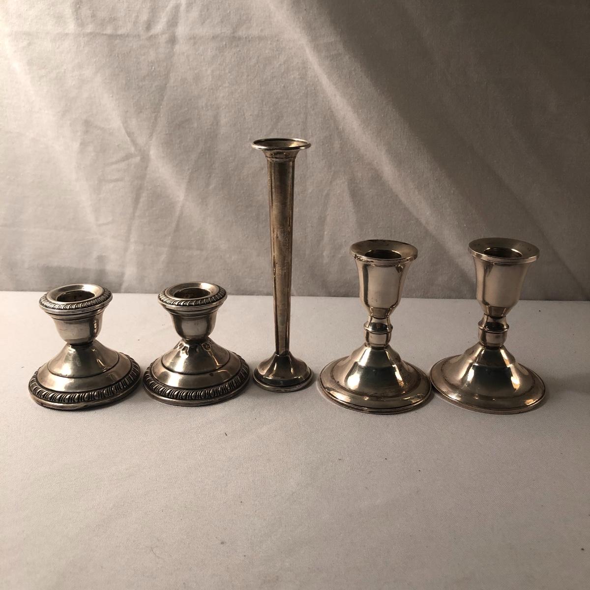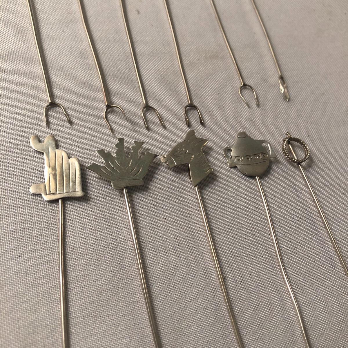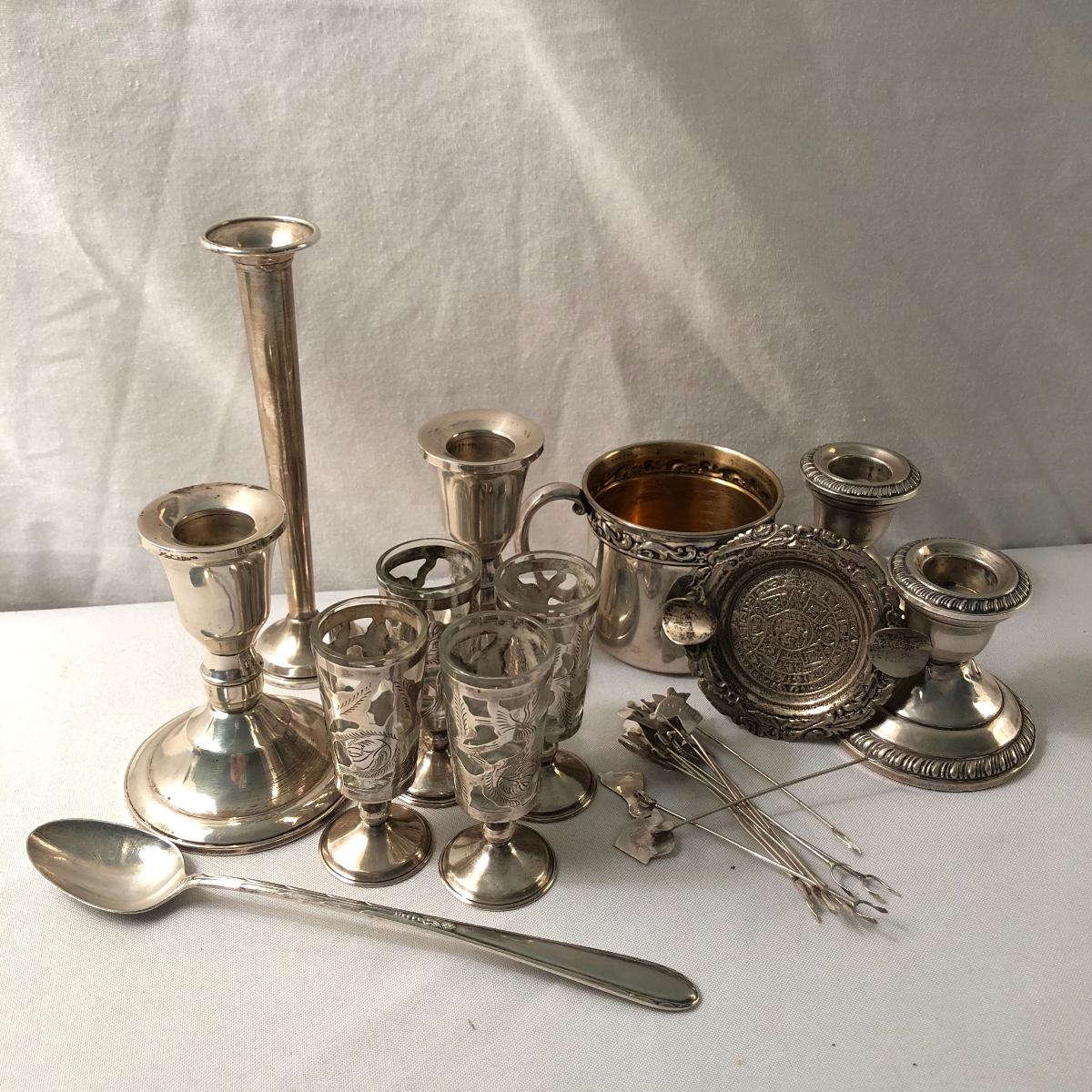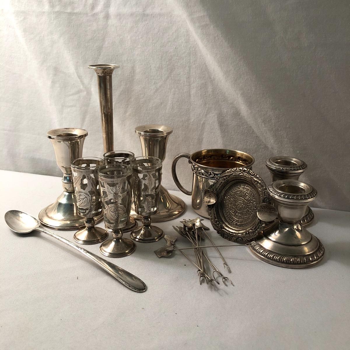 In this collection of Sterling silver, there are candlestick holders, a small teacup, an ashtray, small sampling glasses, a spoon, and appetizer forks. Two of the candle holders match and say “Home Decorations Inc., Sterling, Weighted” on the bottom and one of the holders has some denting around the center. Another pair of candlestick holders are a bit taller and say “Duchin Creation, Sterling, Weighted” on the bottom. The last candlestick holder has a bottom inscription of “Wallace Sterling, Weighted, Reinforced, 6524” and is the tallest. The small teacup says “Reed and Barton Sterling, X827” on the bottom and has the initials “B.L.H.” on one of it’s sides. Four small sampling glasses are glassware fitted into Sterling stems. They say “Sterling, EX925LHN”. The small Aztec-style ashtray has “925, I.M.P.” and measures approximately 3.5” x 3” on its underside. Last in this collection is an Heirloom Sterling, Heiress spoon and eleven small appetizer forks. Each fork has flattened Sterling with different imagery on their ends.