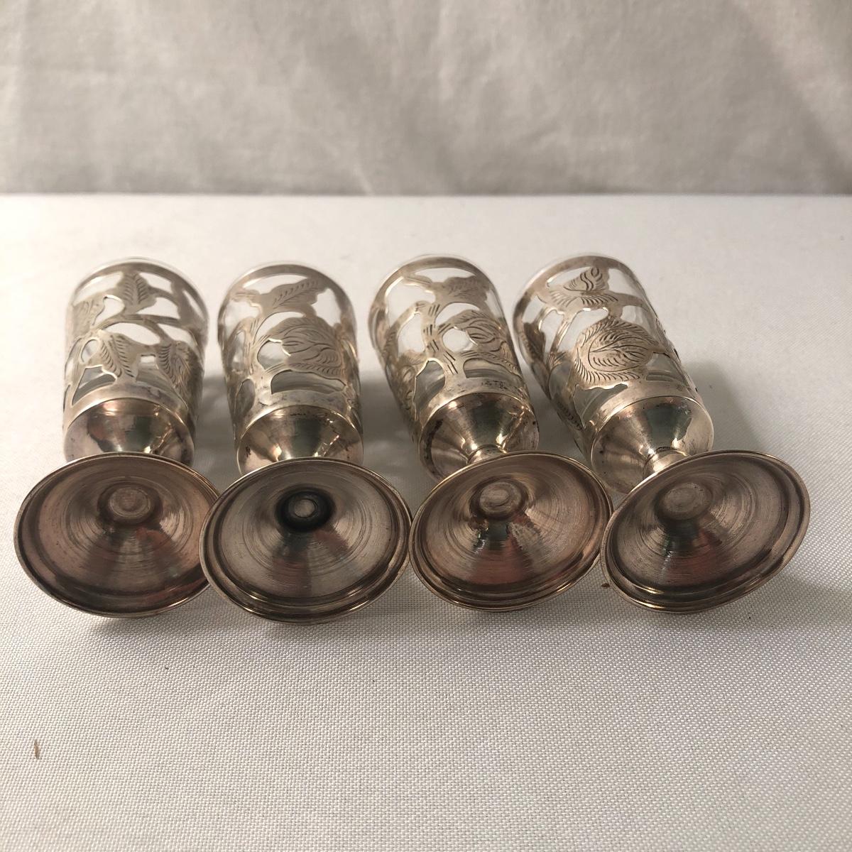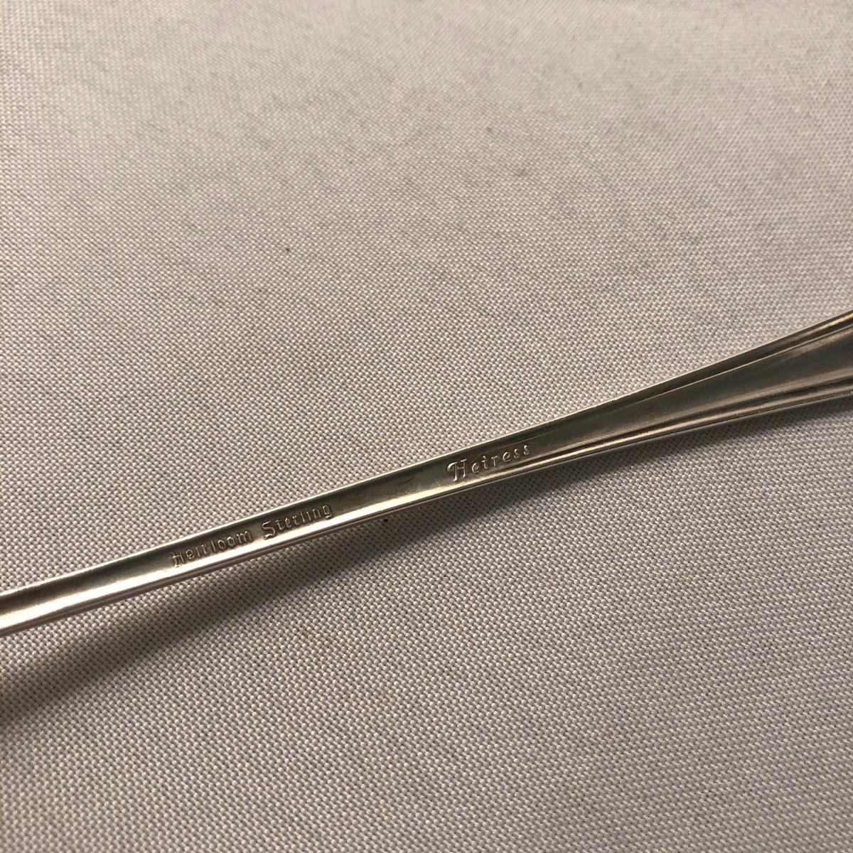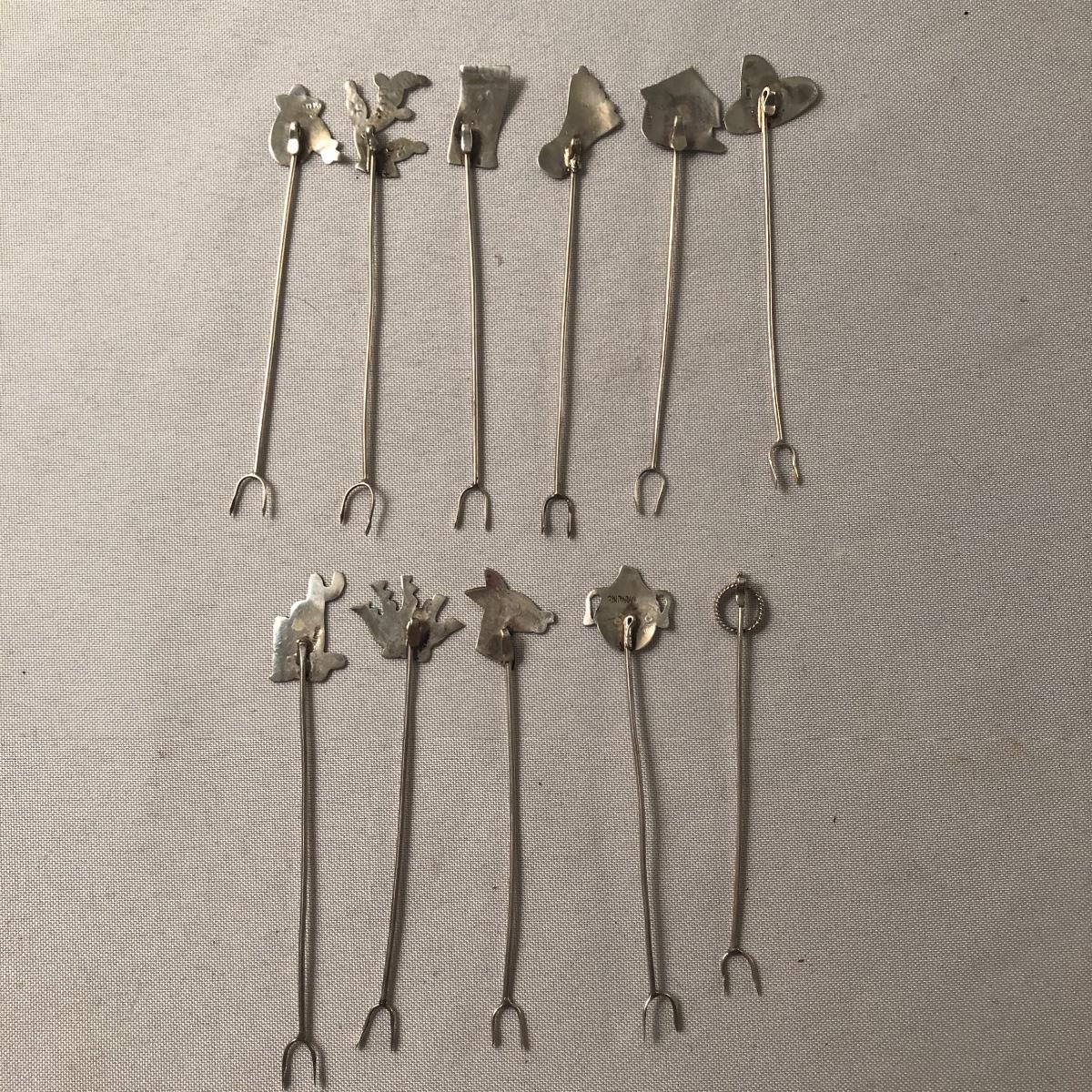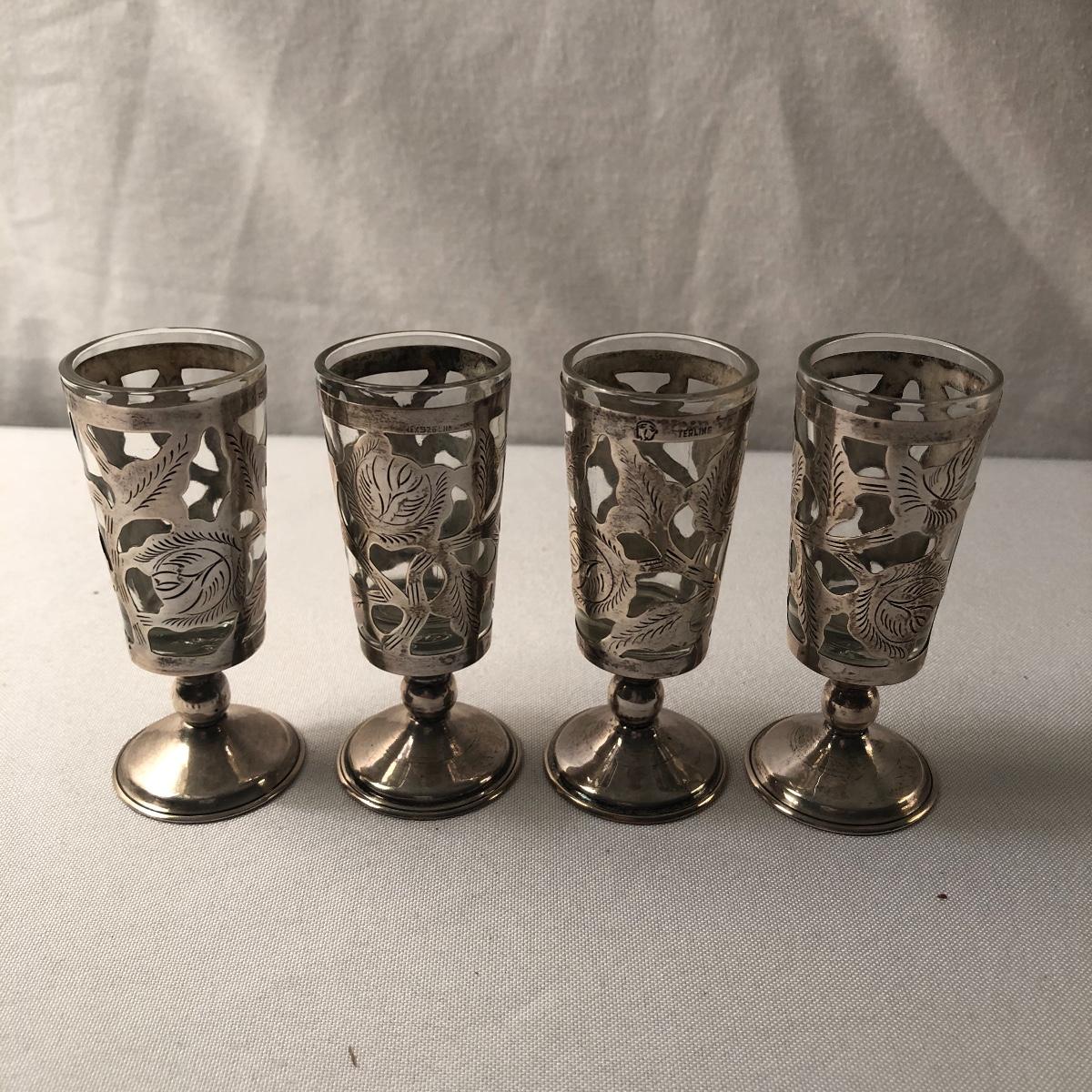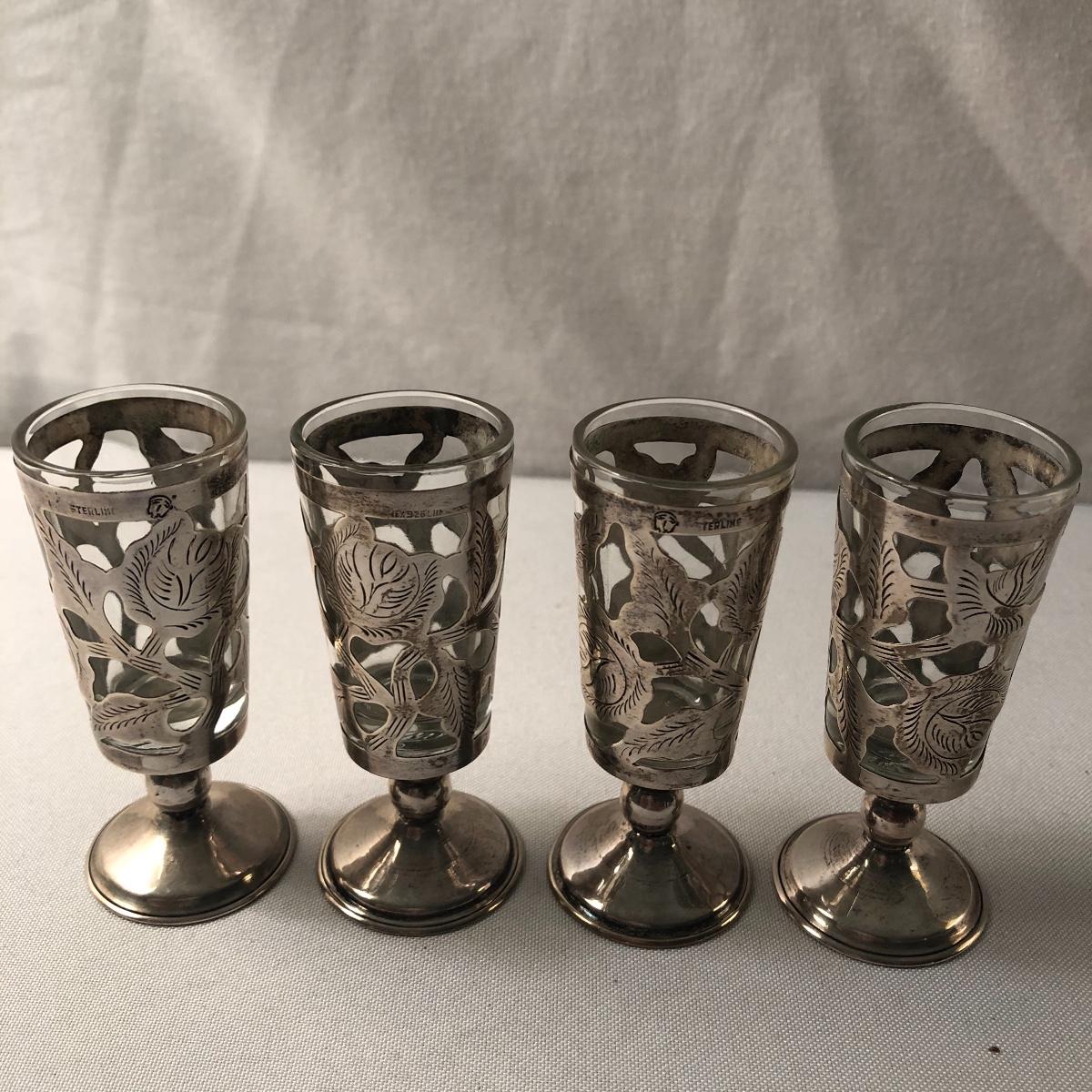 In this collection of Sterling silver, there are candlestick holders, a small teacup, an ashtray, small sampling glasses, a spoon, and appetizer forks. Two of the candle holders match and say “Home Decorations Inc., Sterling, Weighted” on the bottom and one of the holders has some denting around the center. Another pair of candlestick holders are a bit taller and say “Duchin Creation, Sterling, Weighted” on the bottom. The last candlestick holder has a bottom inscription of “Wallace Sterling, Weighted, Reinforced, 6524” and is the tallest. The small teacup says “Reed and Barton Sterling, X827” on the bottom and has the initials “B.L.H.” on one of it’s sides. Four small sampling glasses are glassware fitted into Sterling stems. They say “Sterling, EX925LHN”. The small Aztec-style ashtray has “925, I.M.P.” and measures approximately 3.5” x 3” on its underside. Last in this collection is an Heirloom Sterling, Heiress spoon and eleven small appetizer forks. Each fork has flattened Sterling with different imagery on their ends.