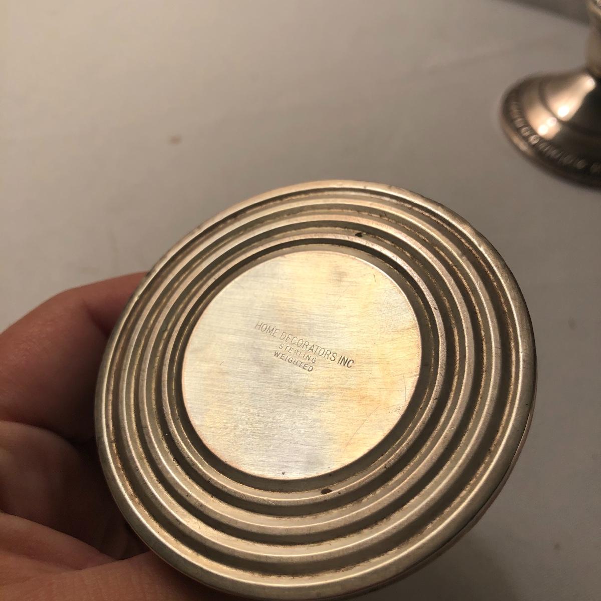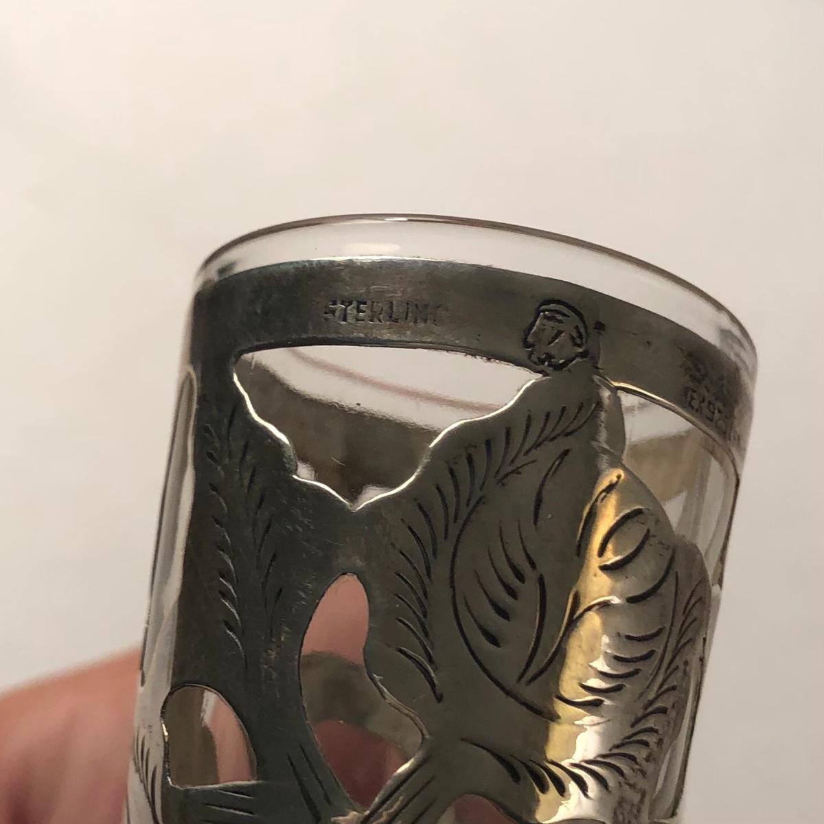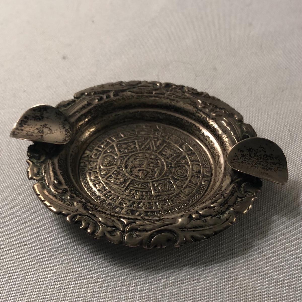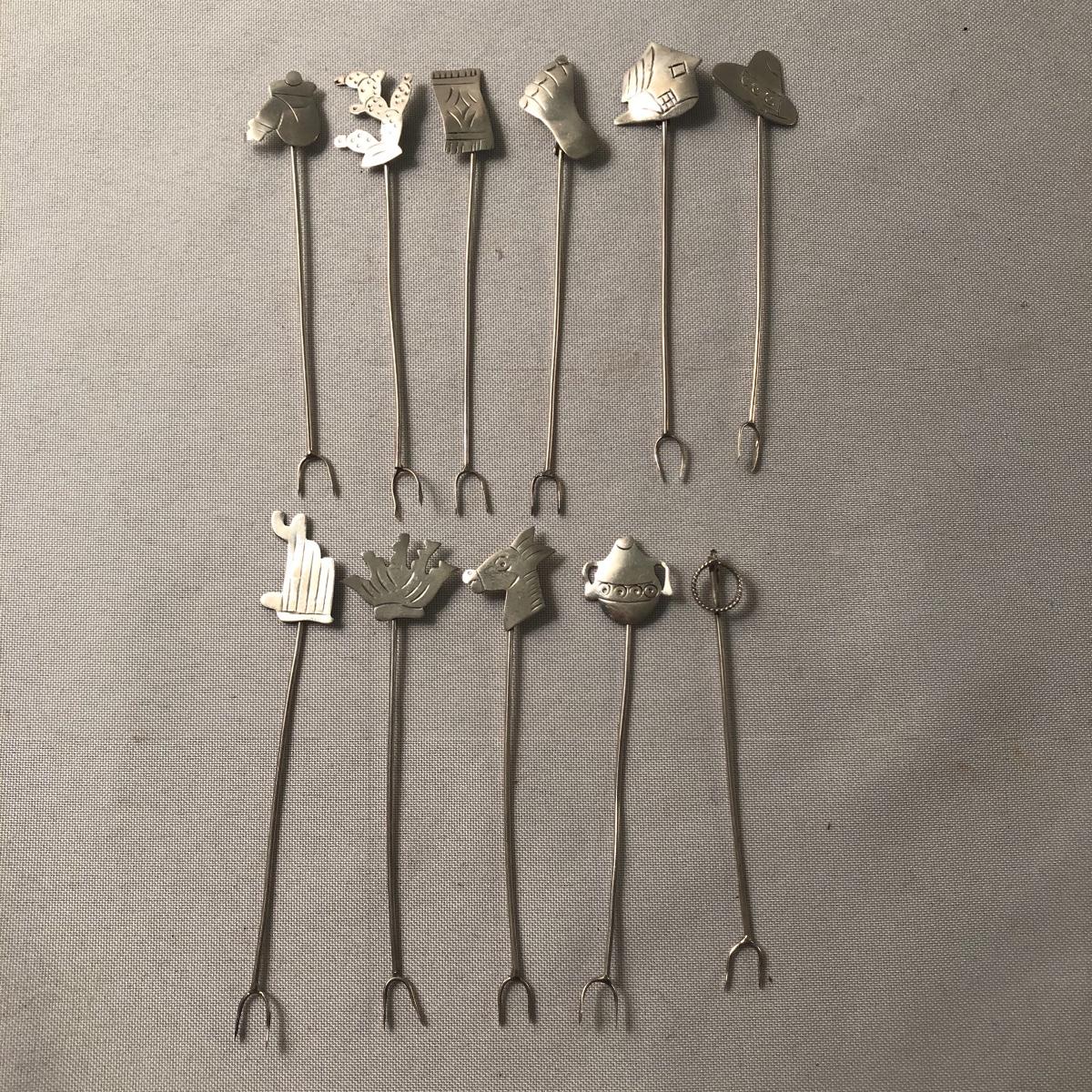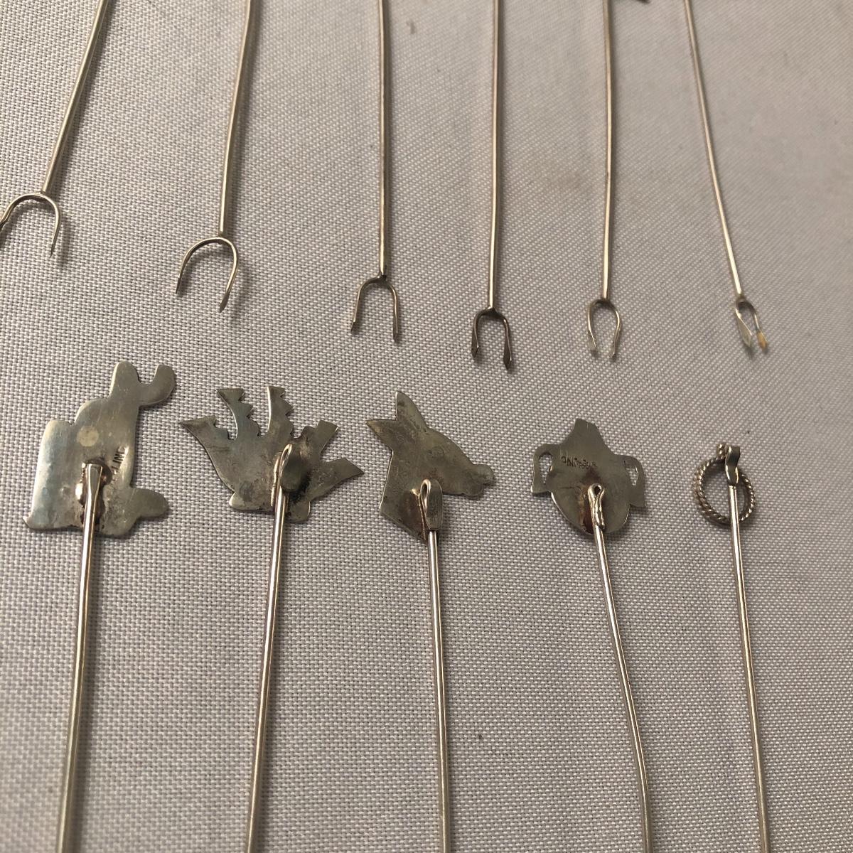 In this collection of Sterling silver, there are candlestick holders, a small teacup, an ashtray, small sampling glasses, a spoon, and appetizer forks. Two of the candle holders match and say “Home Decorations Inc., Sterling, Weighted” on the bottom and one of the holders has some denting around the center. Another pair of candlestick holders are a bit taller and say “Duchin Creation, Sterling, Weighted” on the bottom. The last candlestick holder has a bottom inscription of “Wallace Sterling, Weighted, Reinforced, 6524” and is the tallest. The small teacup says “Reed and Barton Sterling, X827” on the bottom and has the initials “B.L.H.” on one of it’s sides. Four small sampling glasses are glassware fitted into Sterling stems. They say “Sterling, EX925LHN”. The small Aztec-style ashtray has “925, I.M.P.” and measures approximately 3.5” x 3” on its underside. Last in this collection is an Heirloom Sterling, Heiress spoon and eleven small appetizer forks. Each fork has flattened Sterling with different imagery on their ends.