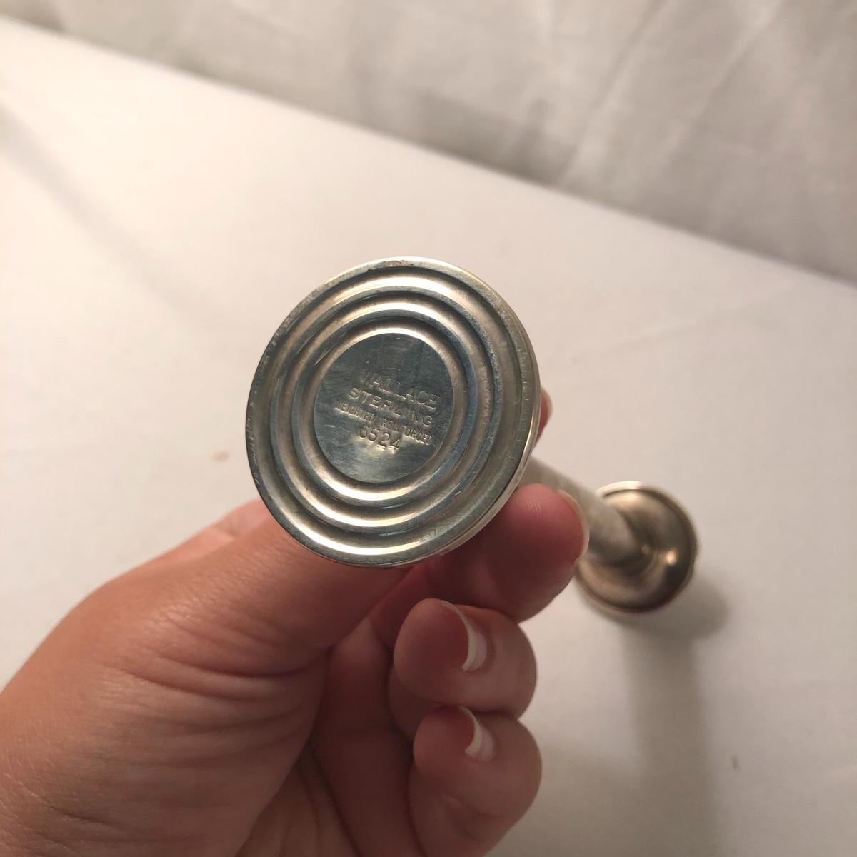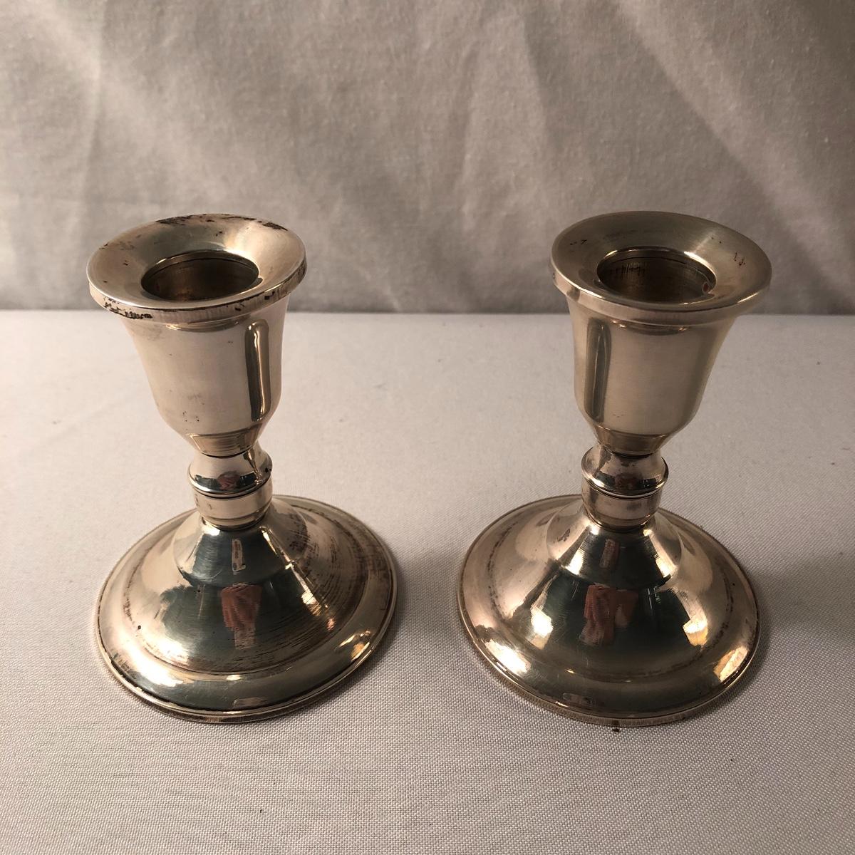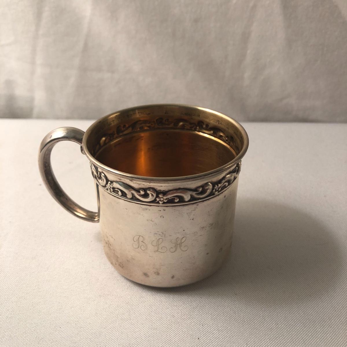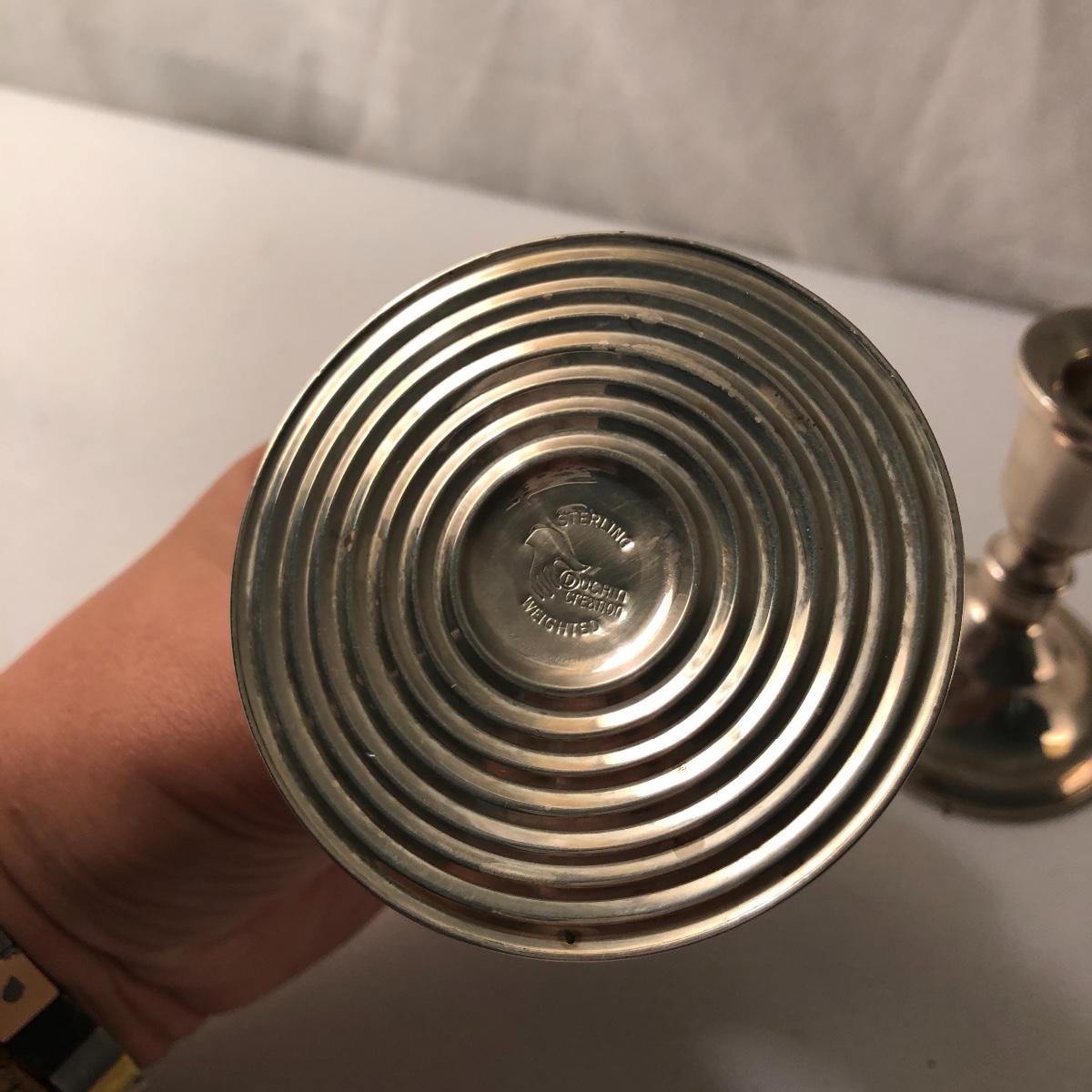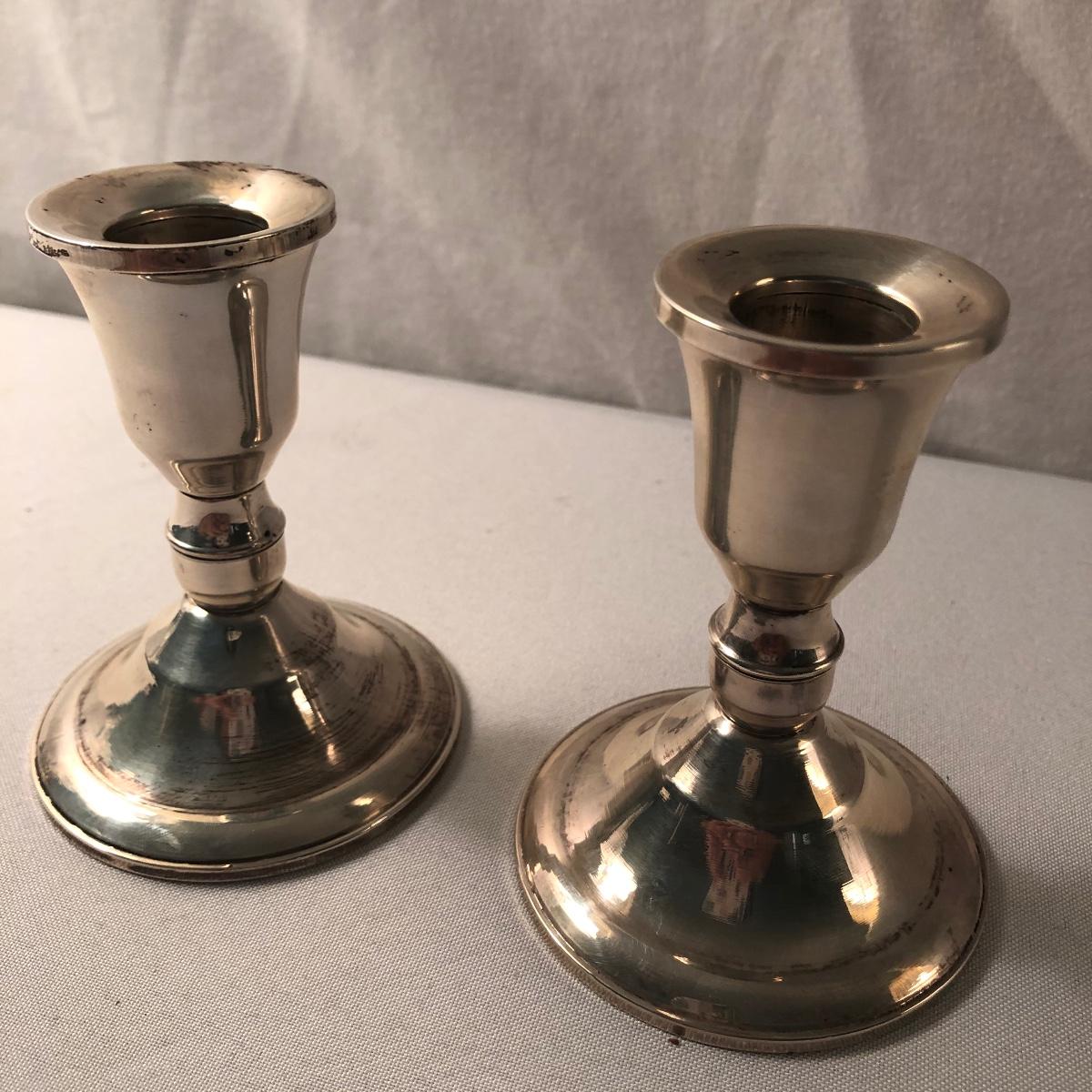 In this collection of Sterling silver, there are candlestick holders, a small teacup, an ashtray, small sampling glasses, a spoon, and appetizer forks. Two of the candle holders match and say “Home Decorations Inc., Sterling, Weighted” on the bottom and one of the holders has some denting around the center. Another pair of candlestick holders are a bit taller and say “Duchin Creation, Sterling, Weighted” on the bottom. The last candlestick holder has a bottom inscription of “Wallace Sterling, Weighted, Reinforced, 6524” and is the tallest. The small teacup says “Reed and Barton Sterling, X827” on the bottom and has the initials “B.L.H.” on one of it’s sides. Four small sampling glasses are glassware fitted into Sterling stems. They say “Sterling, EX925LHN”. The small Aztec-style ashtray has “925, I.M.P.” and measures approximately 3.5” x 3” on its underside. Last in this collection is an Heirloom Sterling, Heiress spoon and eleven small appetizer forks. Each fork has flattened Sterling with different imagery on their ends.