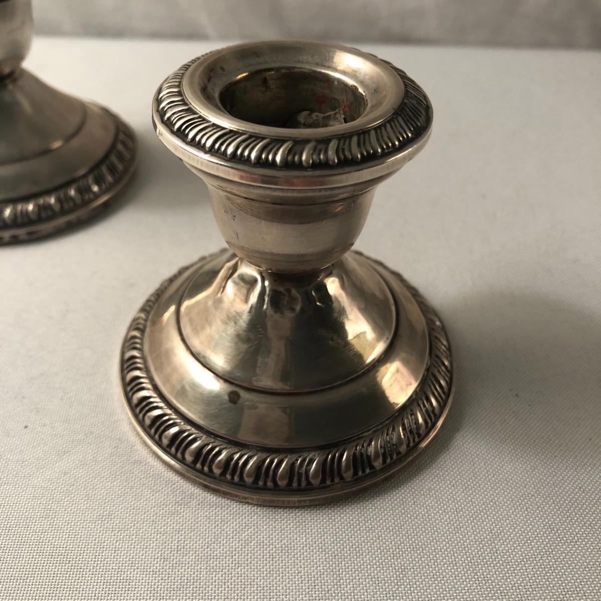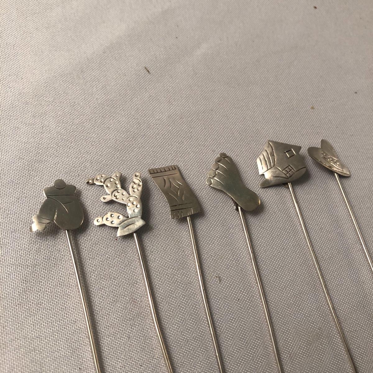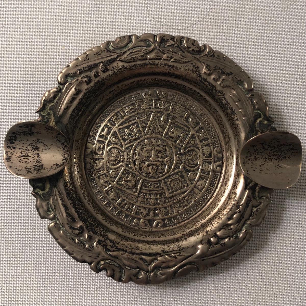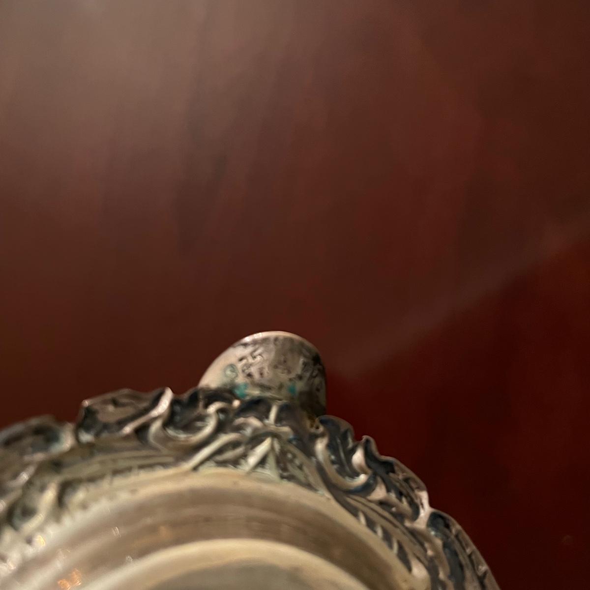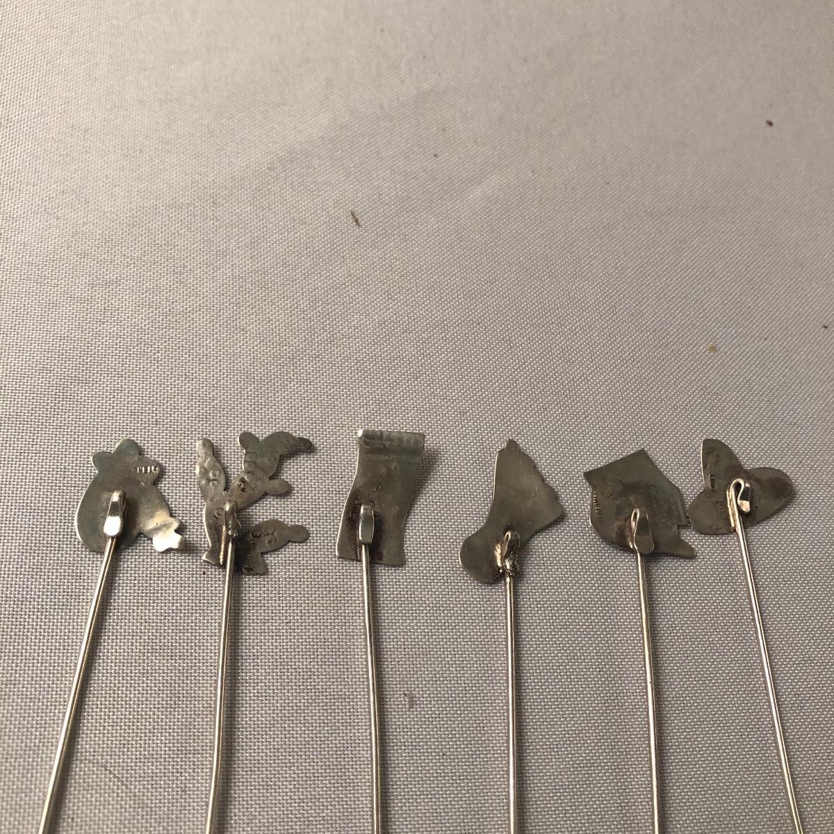 In this collection of Sterling silver, there are candlestick holders, a small teacup, an ashtray, small sampling glasses, a spoon, and appetizer forks. Two of the candle holders match and say “Home Decorations Inc., Sterling, Weighted” on the bottom and one of the holders has some denting around the center. Another pair of candlestick holders are a bit taller and say “Duchin Creation, Sterling, Weighted” on the bottom. The last candlestick holder has a bottom inscription of “Wallace Sterling, Weighted, Reinforced, 6524” and is the tallest. The small teacup says “Reed and Barton Sterling, X827” on the bottom and has the initials “B.L.H.” on one of it’s sides. Four small sampling glasses are glassware fitted into Sterling stems. They say “Sterling, EX925LHN”. The small Aztec-style ashtray has “925, I.M.P.” and measures approximately 3.5” x 3” on its underside. Last in this collection is an Heirloom Sterling, Heiress spoon and eleven small appetizer forks. Each fork has flattened Sterling with different imagery on their ends.