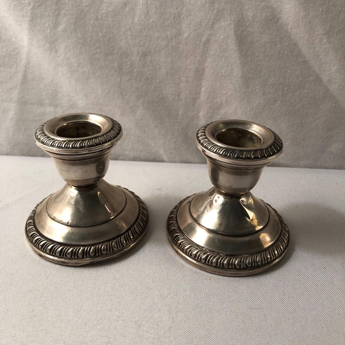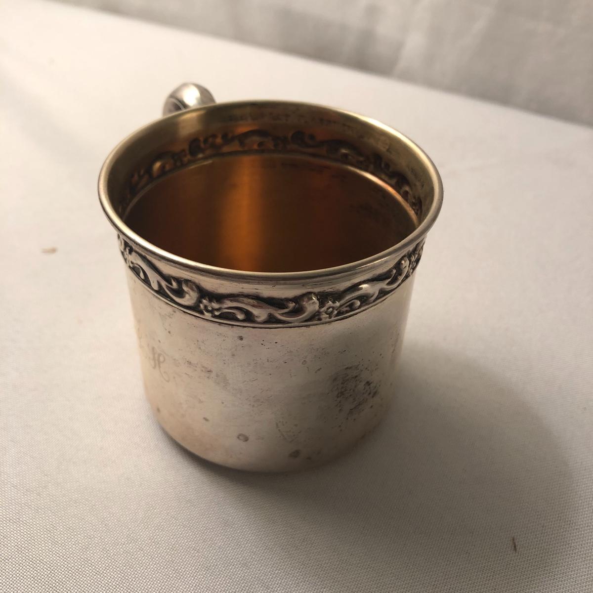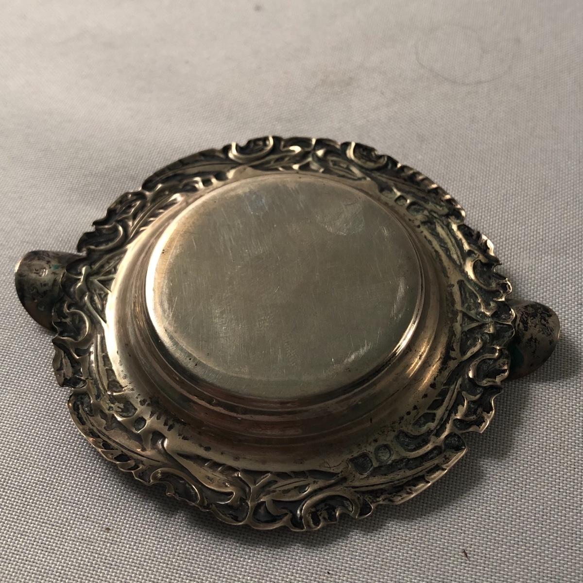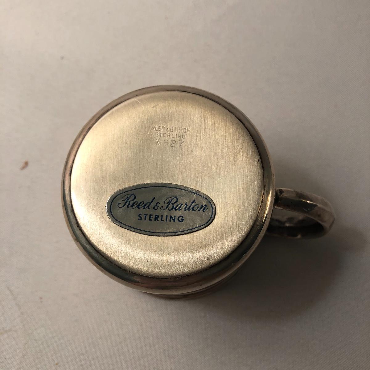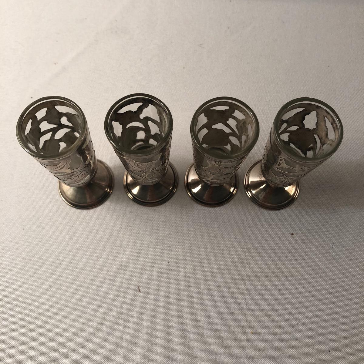 In this collection of Sterling silver, there are candlestick holders, a small teacup, an ashtray, small sampling glasses, a spoon, and appetizer forks. Two of the candle holders match and say “Home Decorations Inc., Sterling, Weighted” on the bottom and one of the holders has some denting around the center. Another pair of candlestick holders are a bit taller and say “Duchin Creation, Sterling, Weighted” on the bottom. The last candlestick holder has a bottom inscription of “Wallace Sterling, Weighted, Reinforced, 6524” and is the tallest. The small teacup says “Reed and Barton Sterling, X827” on the bottom and has the initials “B.L.H.” on one of it’s sides. Four small sampling glasses are glassware fitted into Sterling stems. They say “Sterling, EX925LHN”. The small Aztec-style ashtray has “925, I.M.P.” and measures approximately 3.5” x 3” on its underside. Last in this collection is an Heirloom Sterling, Heiress spoon and eleven small appetizer forks. Each fork has flattened Sterling with different imagery on their ends.