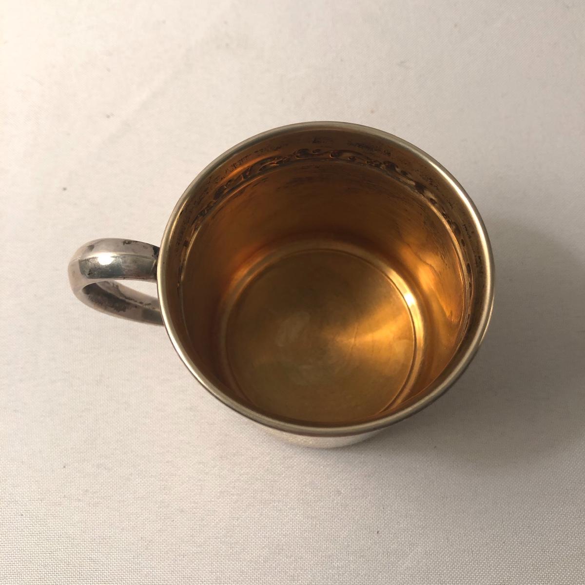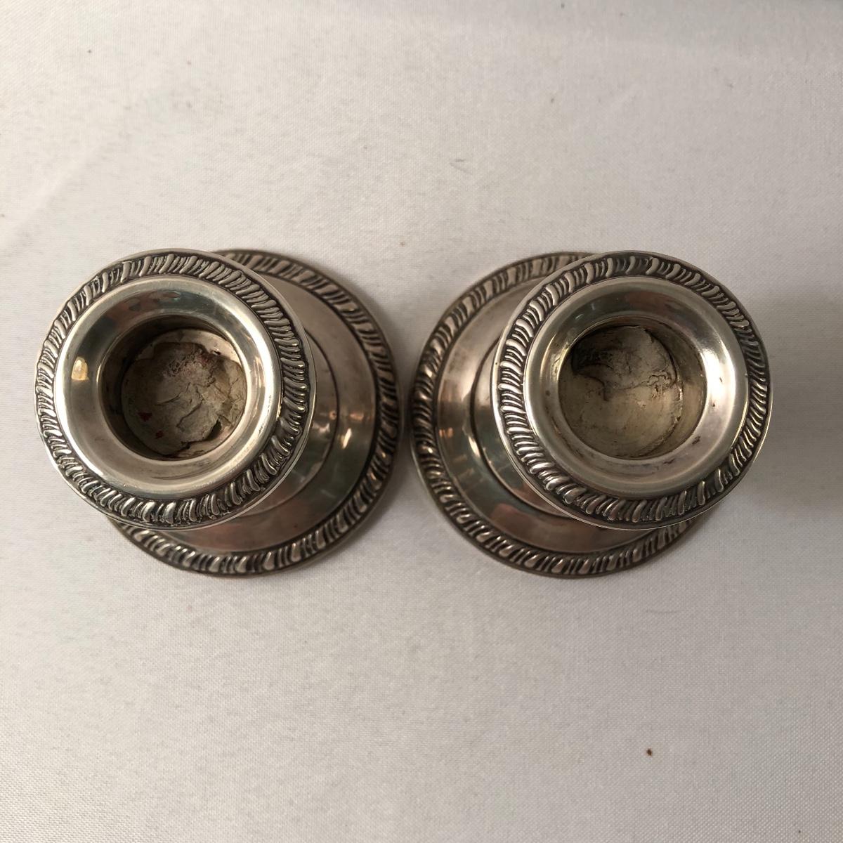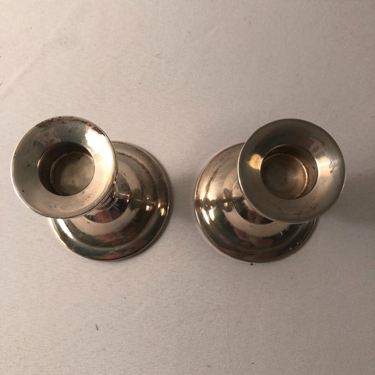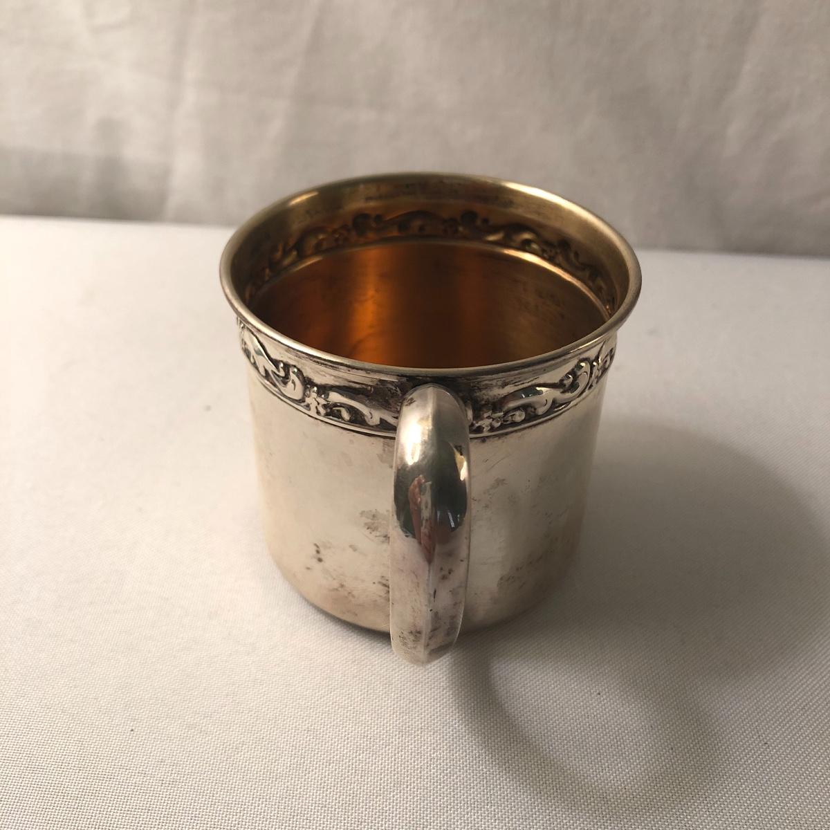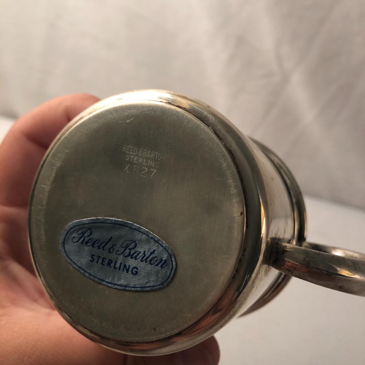 In this collection of Sterling silver, there are candlestick holders, a small teacup, an ashtray, small sampling glasses, a spoon, and appetizer forks. Two of the candle holders match and say “Home Decorations Inc., Sterling, Weighted” on the bottom and one of the holders has some denting around the center. Another pair of candlestick holders are a bit taller and say “Duchin Creation, Sterling, Weighted” on the bottom. The last candlestick holder has a bottom inscription of “Wallace Sterling, Weighted, Reinforced, 6524” and is the tallest. The small teacup says “Reed and Barton Sterling, X827” on the bottom and has the initials “B.L.H.” on one of it’s sides. Four small sampling glasses are glassware fitted into Sterling stems. They say “Sterling, EX925LHN”. The small Aztec-style ashtray has “925, I.M.P.” and measures approximately 3.5” x 3” on its underside. Last in this collection is an Heirloom Sterling, Heiress spoon and eleven small appetizer forks. Each fork has flattened Sterling with different imagery on their ends.
