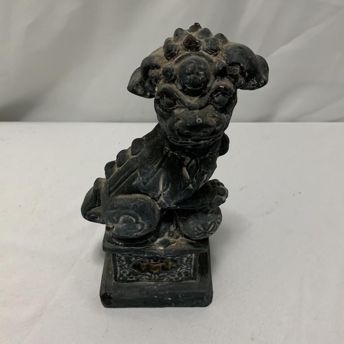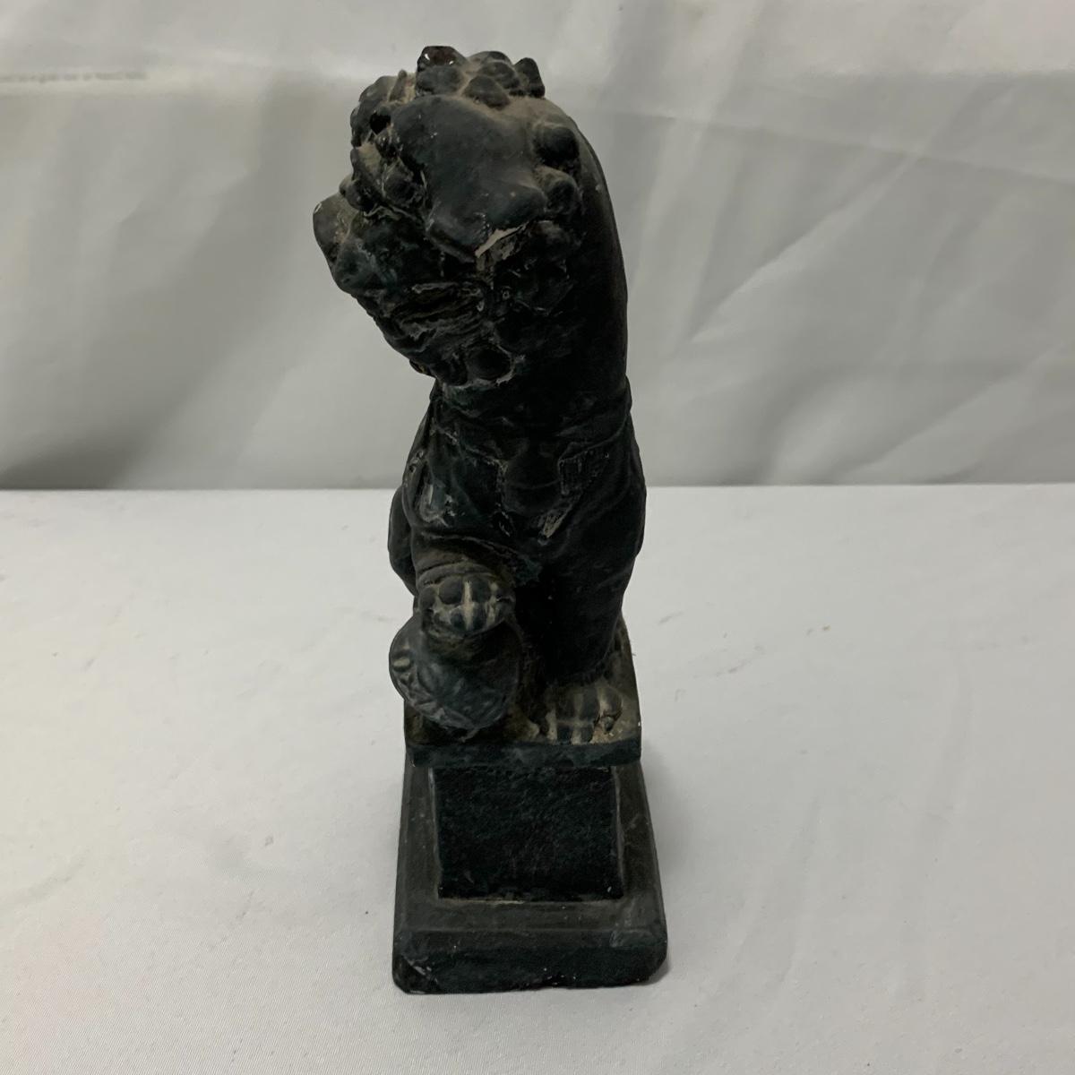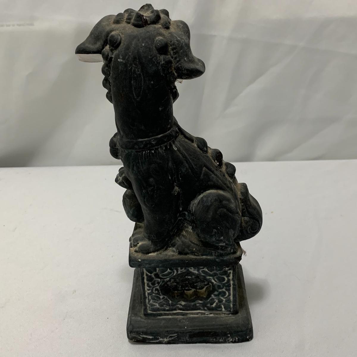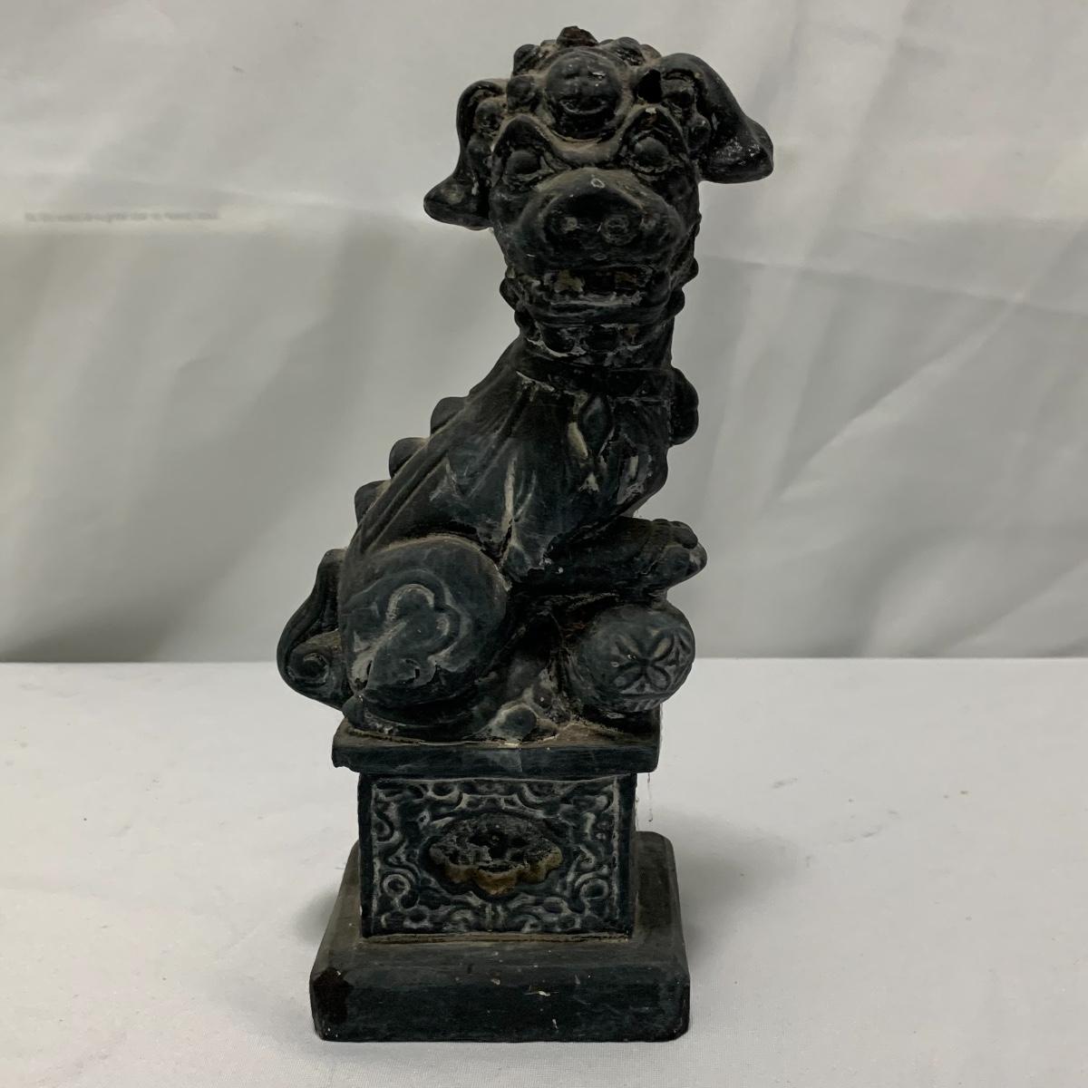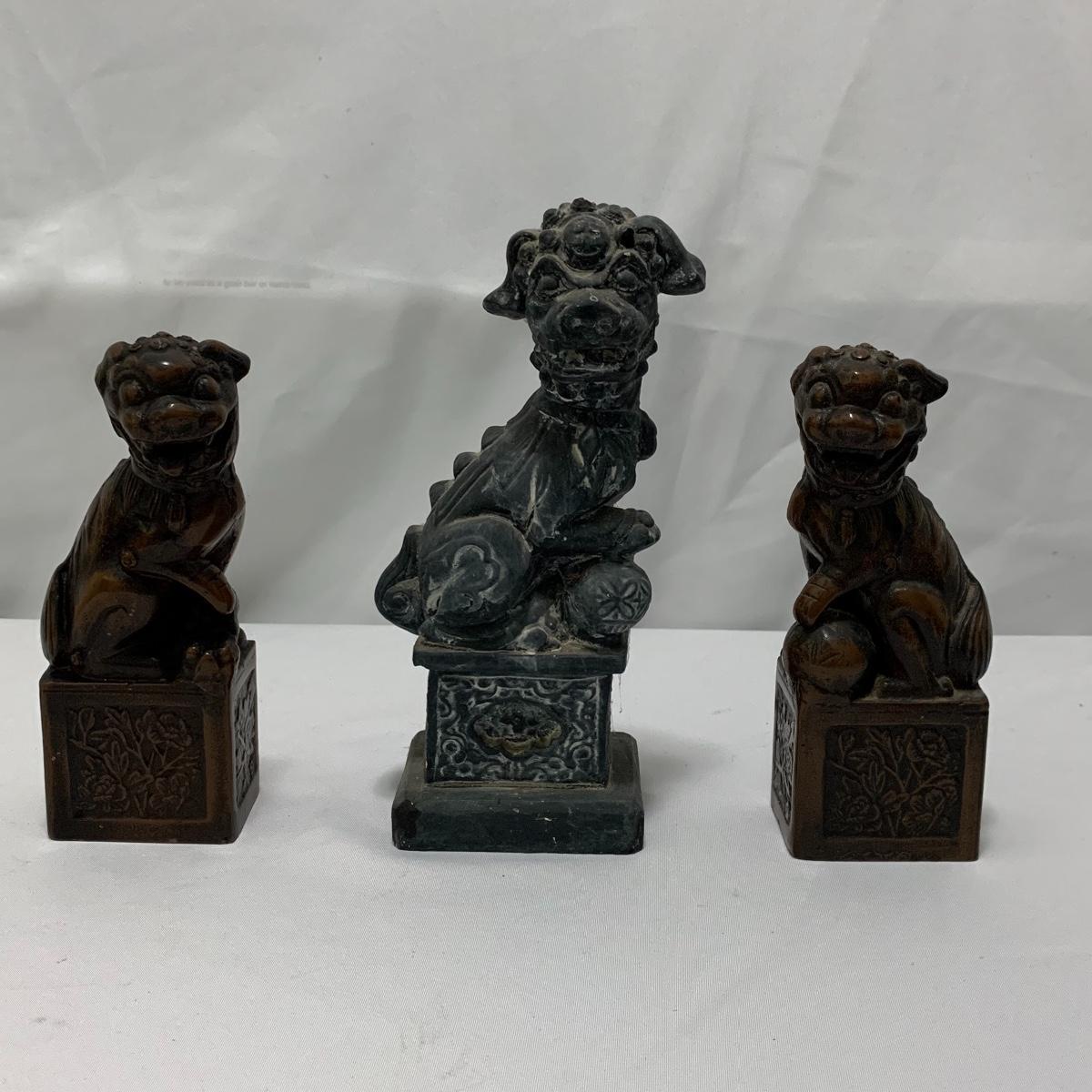 This lot has three unique and ornate foo dog statues. One is gray ceramic, with the foo dog sitting on a pedestal, looking straight at you. It has floppy ears and a spiny back. One of the ears is chipped, which you can only see from the back. The ceramic dog measures about 11” tall. The other two foo dogs are a matching set of heavy iron bookends. One is resting it’s paw on a ball, the other on a puppy. They stand at about 9” tall. Shipping available.