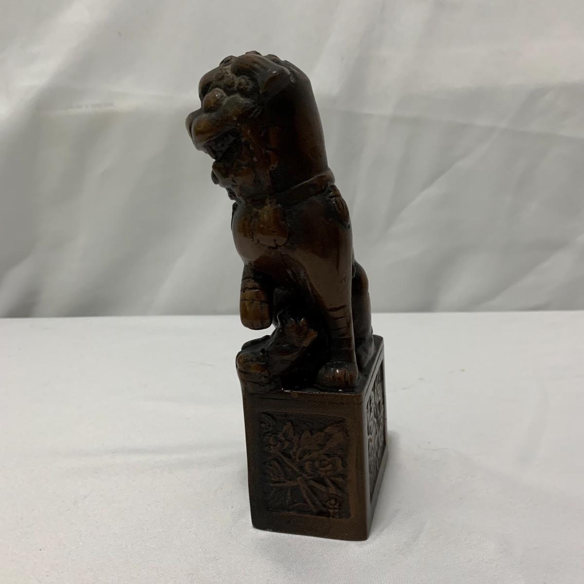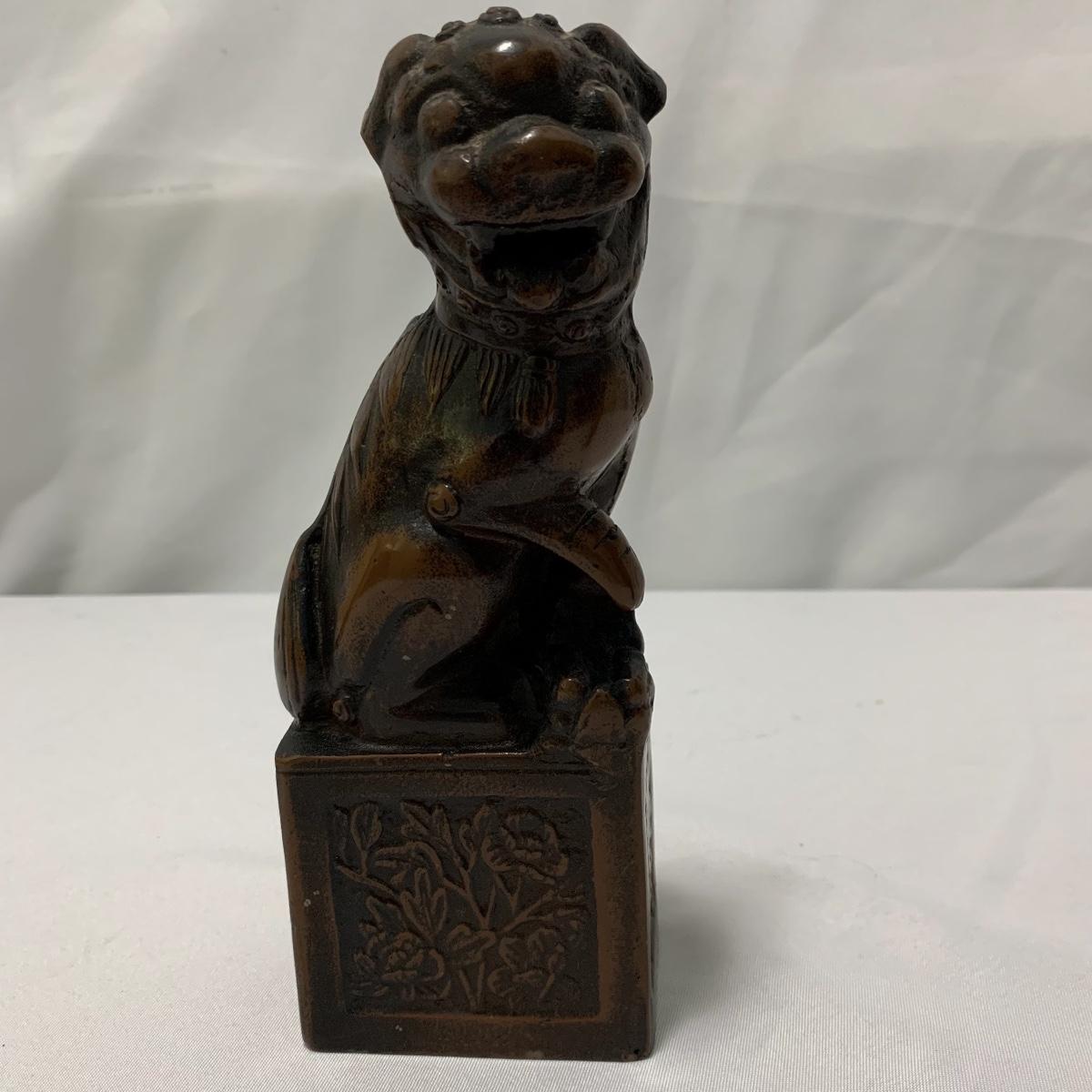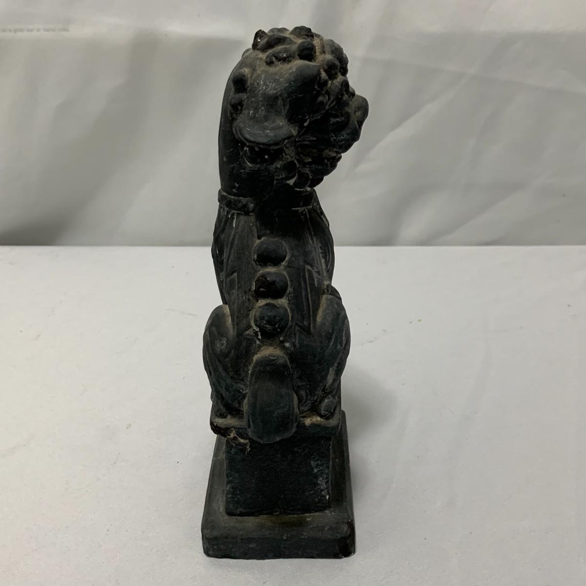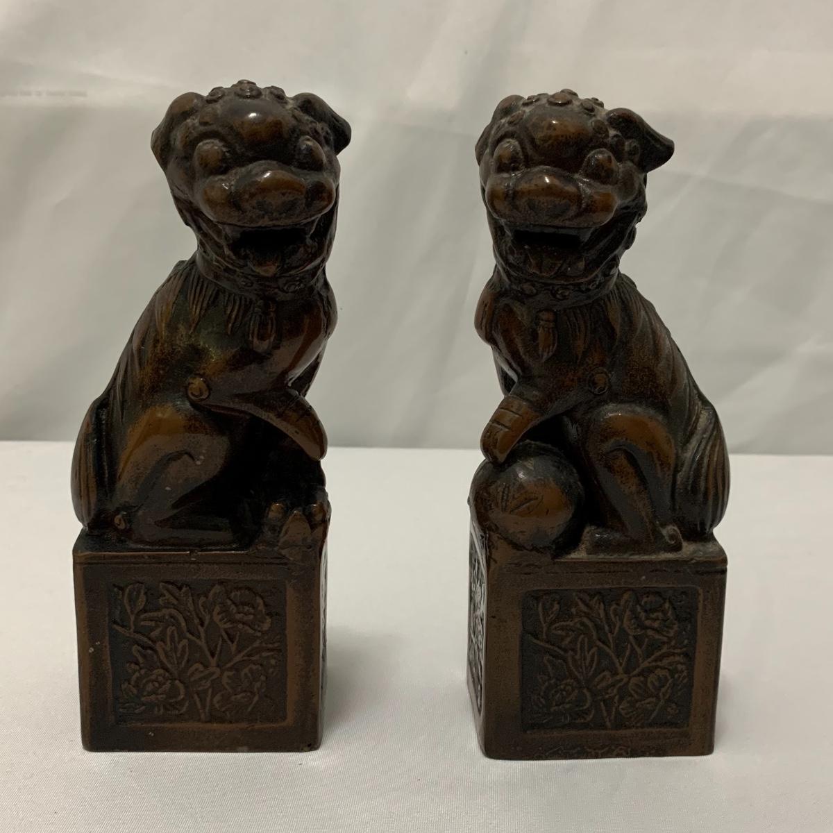 This lot has three unique and ornate foo dog statues. One is gray ceramic, with the foo dog sitting on a pedestal, looking straight at you. It has floppy ears and a spiny back. One of the ears is chipped, which you can only see from the back. The ceramic dog measures about 11” tall. The other two foo dogs are a matching set of heavy iron bookends. One is resting it’s paw on a ball, the other on a puppy. They stand at about 9” tall. Shipping available.