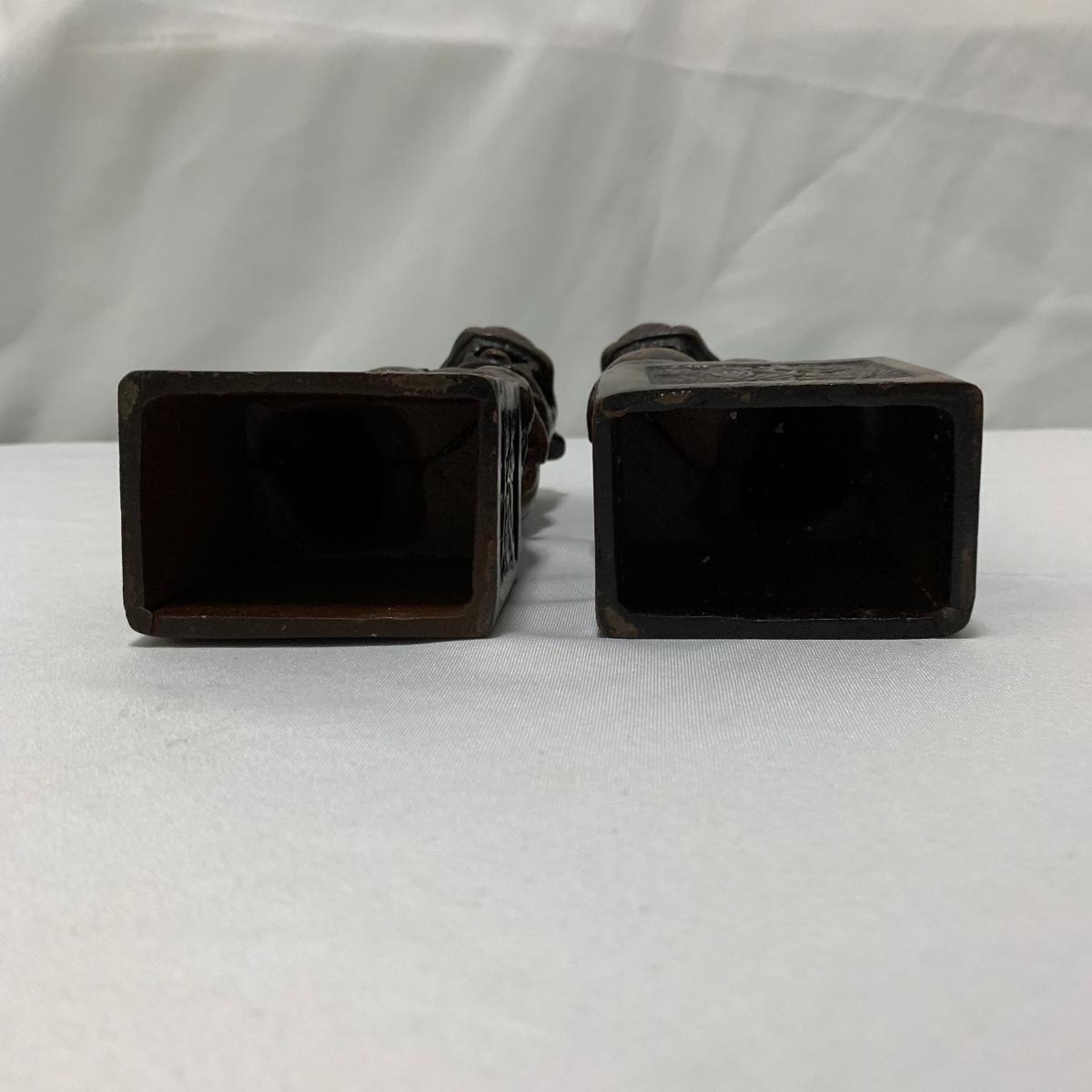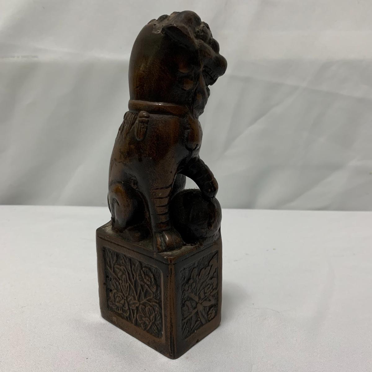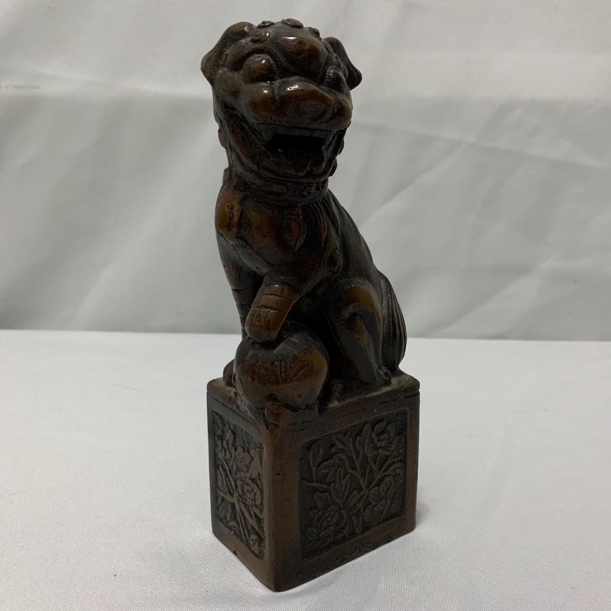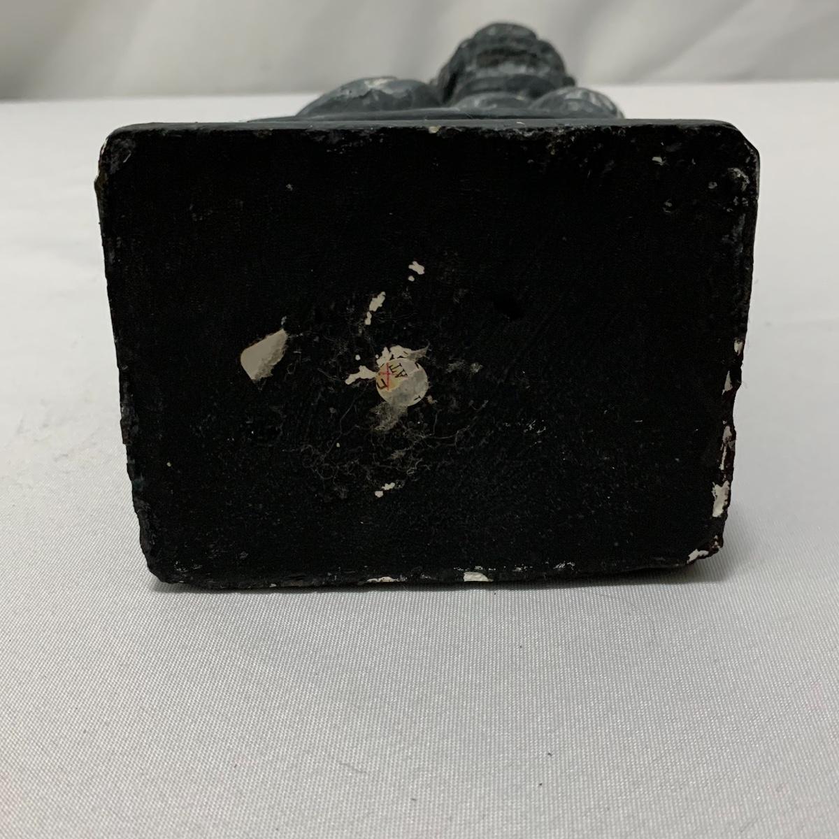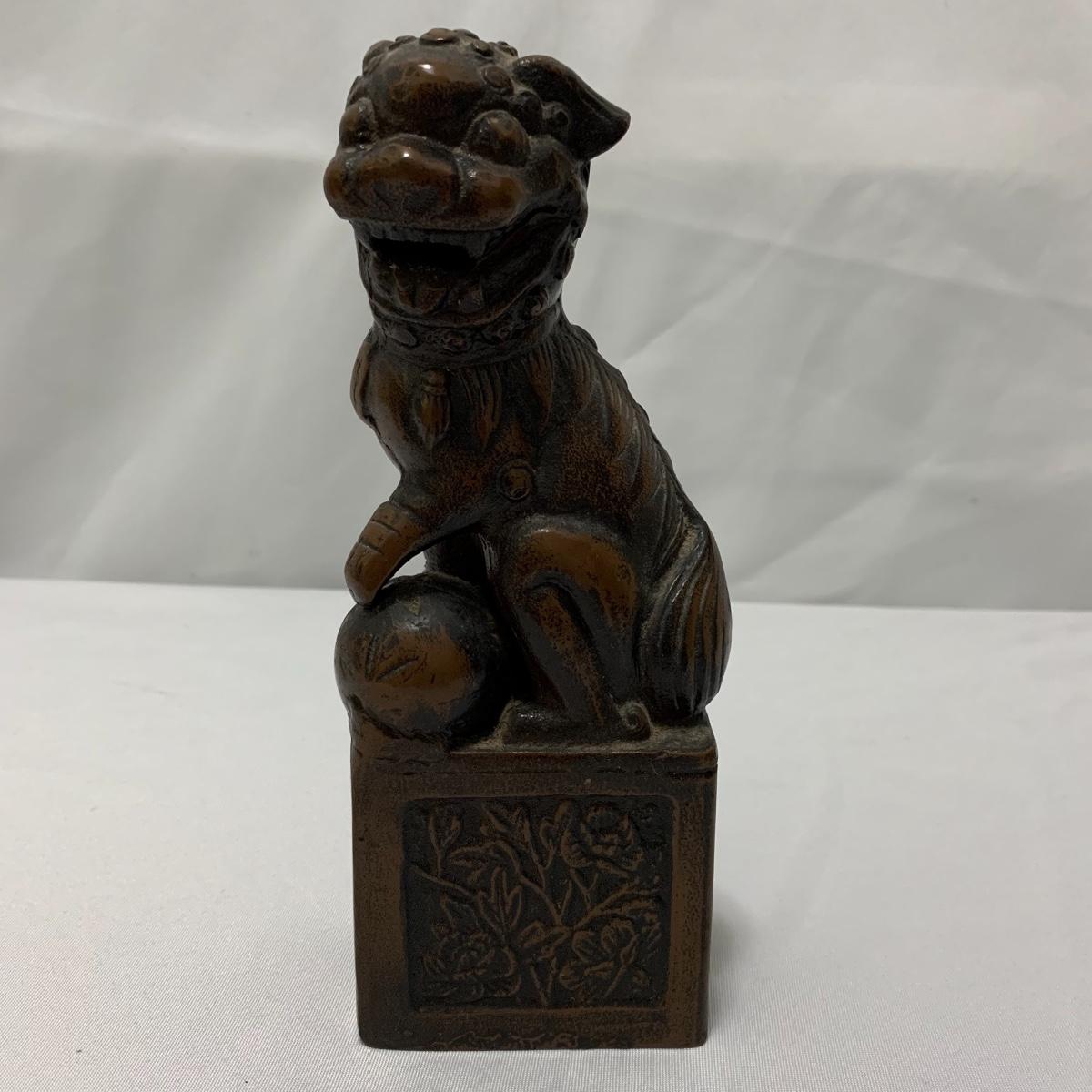 This lot has three unique and ornate foo dog statues. One is gray ceramic, with the foo dog sitting on a pedestal, looking straight at you. It has floppy ears and a spiny back. One of the ears is chipped, which you can only see from the back. The ceramic dog measures about 11” tall. The other two foo dogs are a matching set of heavy iron bookends. One is resting it’s paw on a ball, the other on a puppy. They stand at about 9” tall. Shipping available.