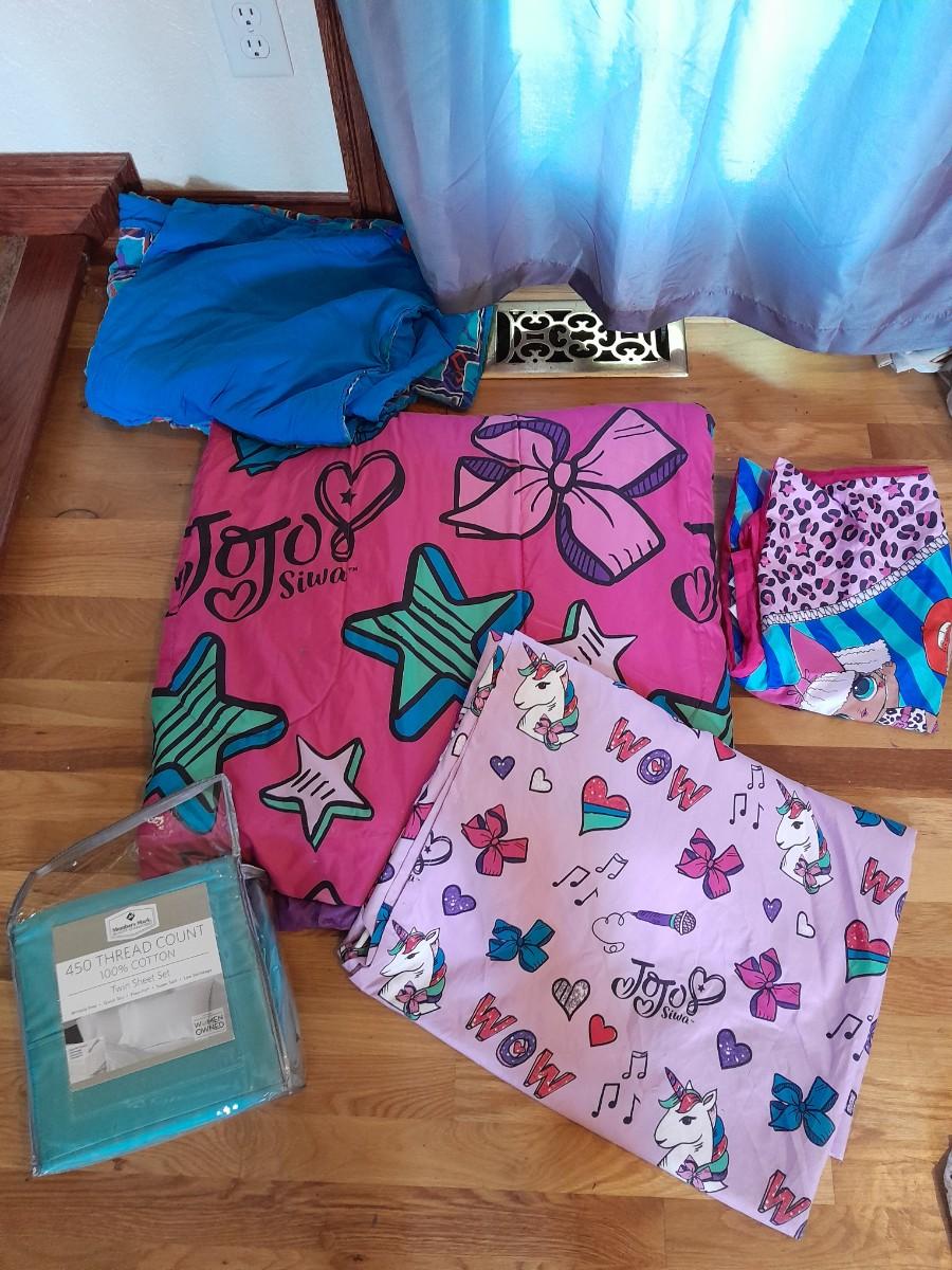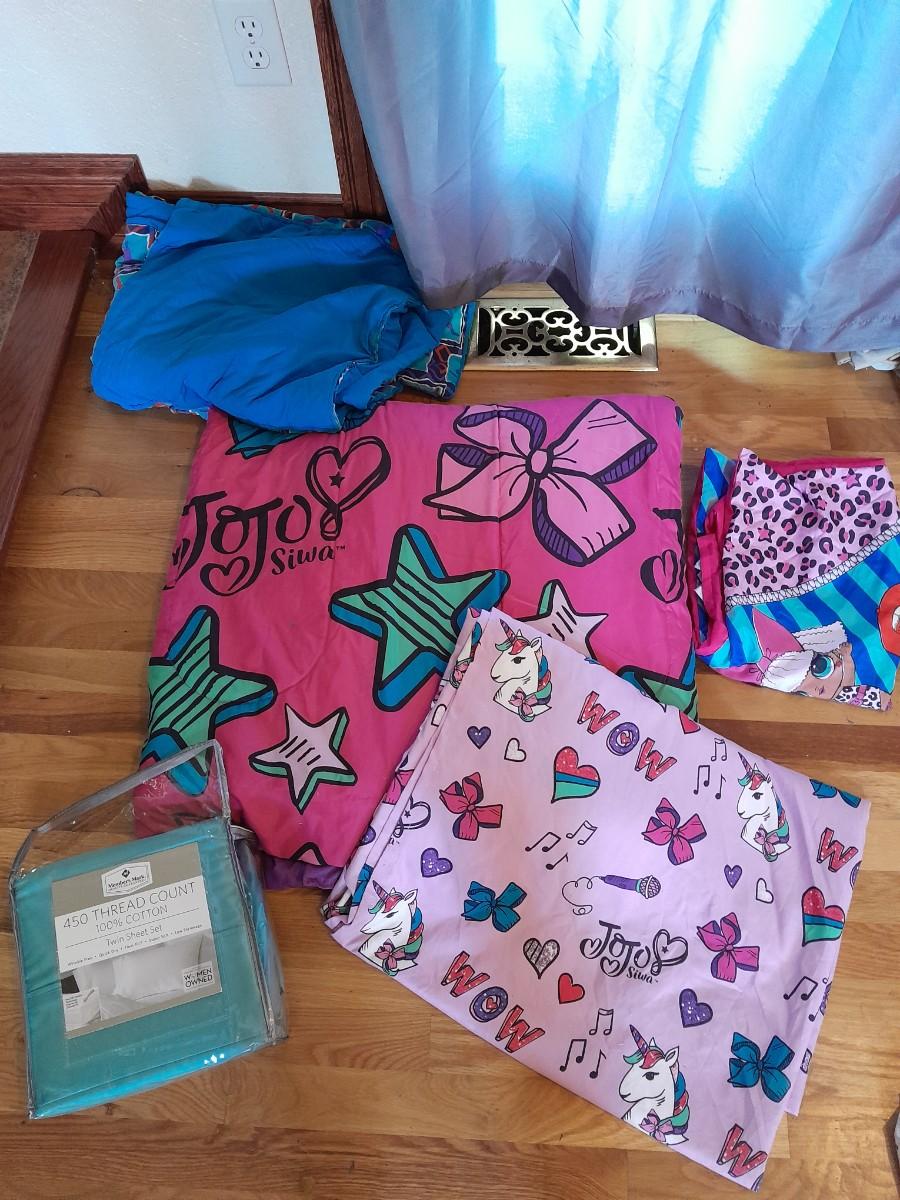 TWIN SIZED COMFORTER, BLANKET, AND SOME SHEETS (NOT SETS)