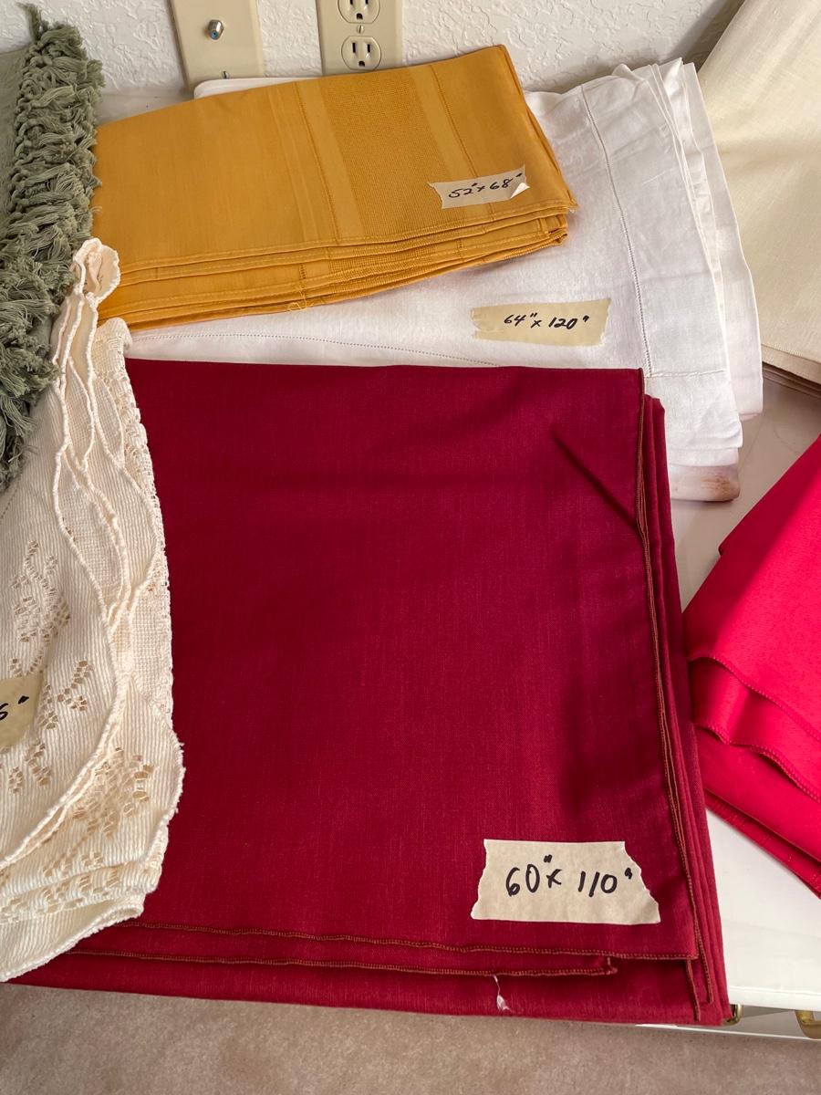 8 assorted tablecloths in various sizes--gold cotton, white linen, red cotton, burgundy, cream lace and olive green cotton with fringe