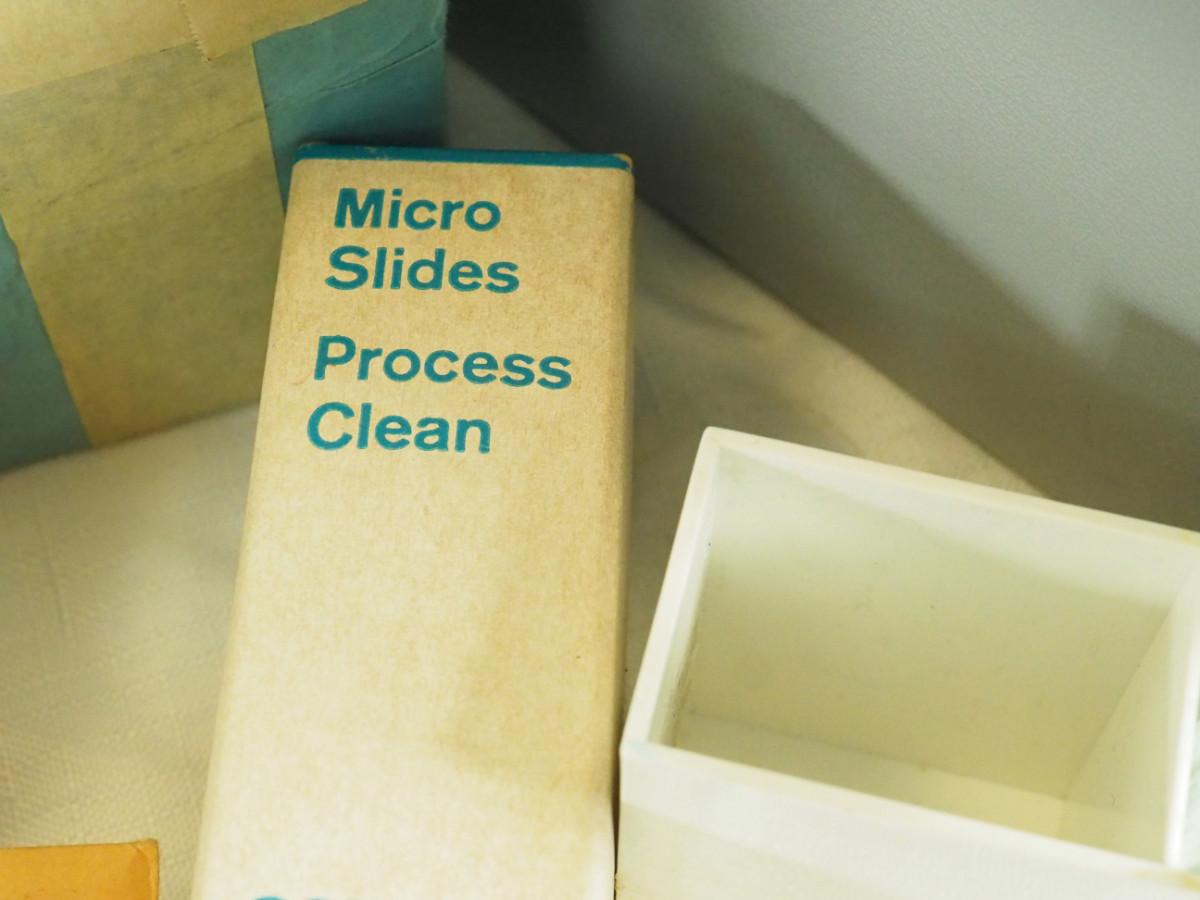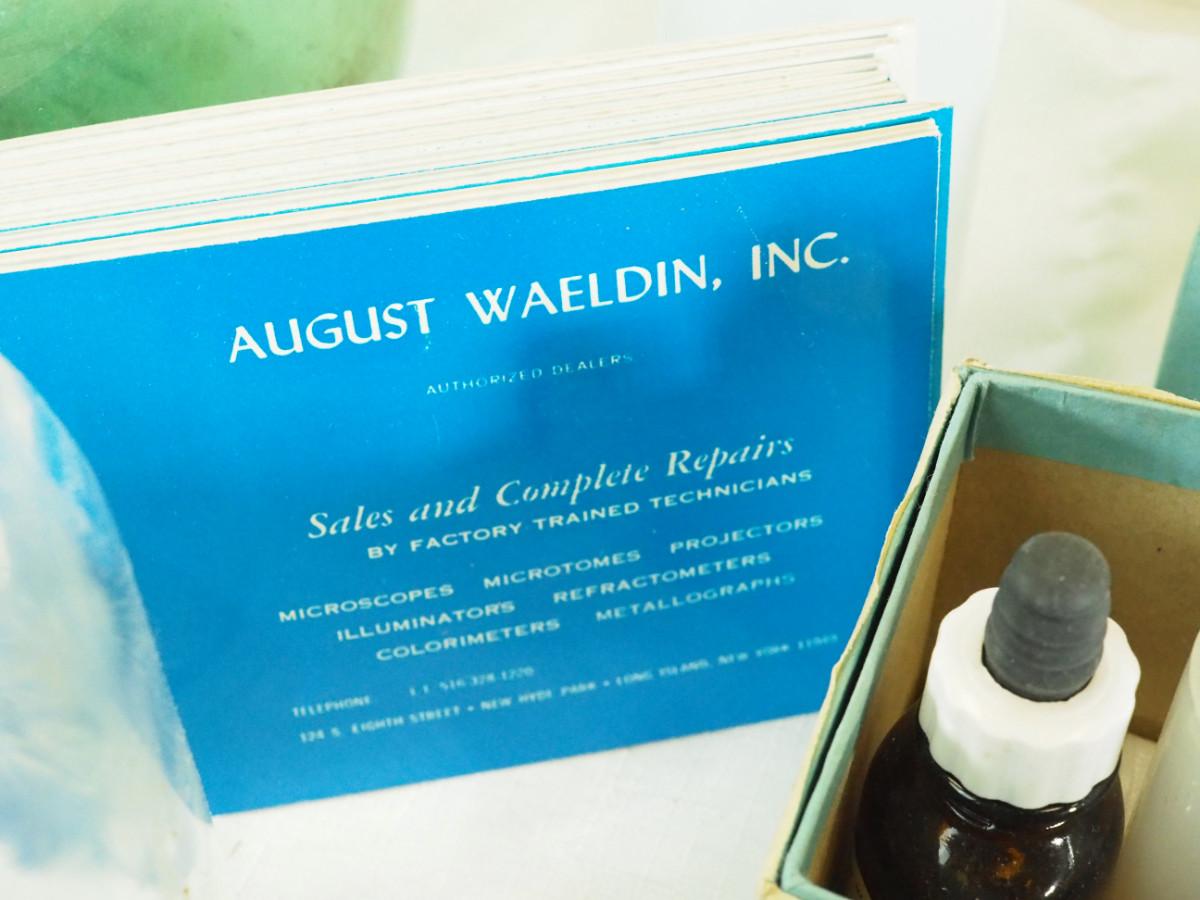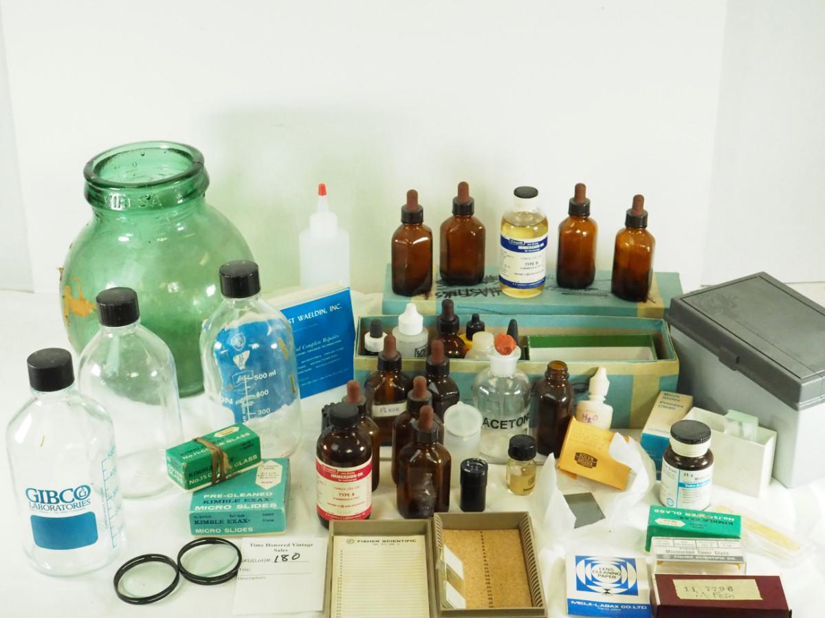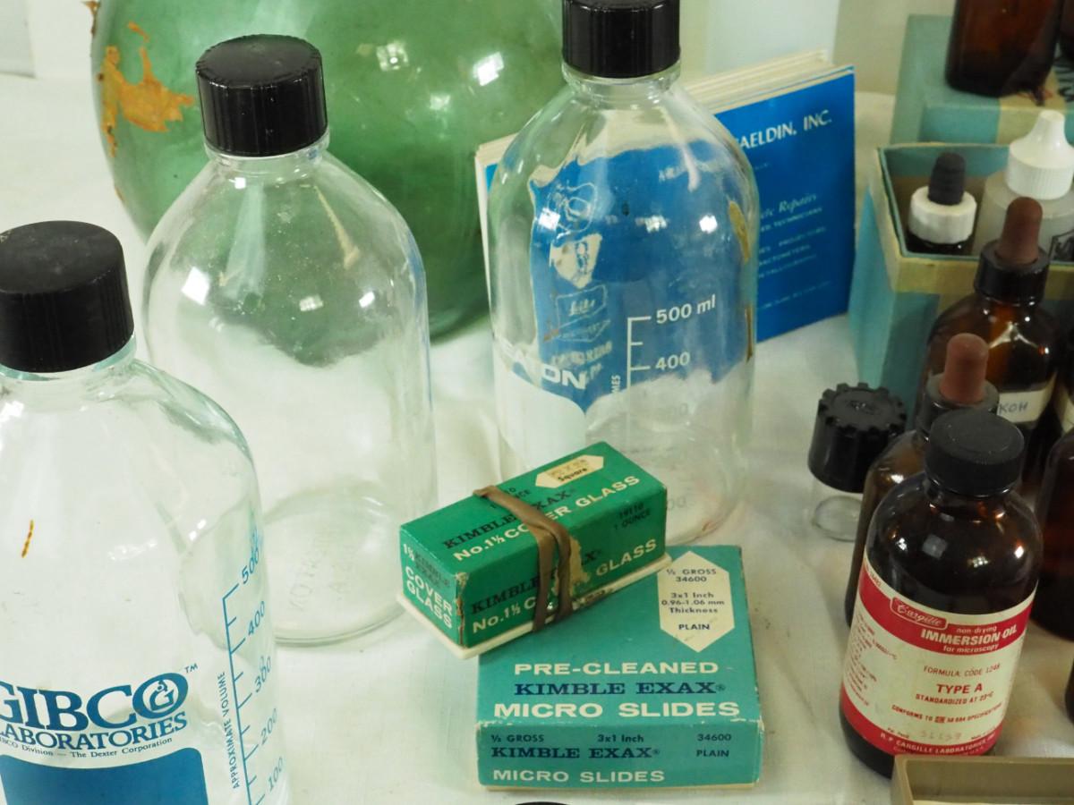 Lot 180 Veresa vintage green carboy glass Microscope slides, brown bottles, clear lab bottles, microscope lens, cleaning papers, solutions. Interesting vintage microscope items.