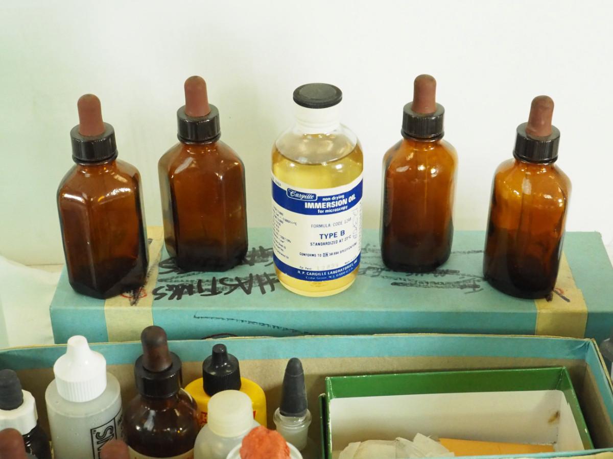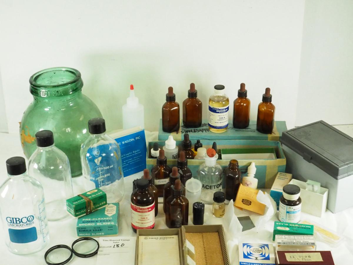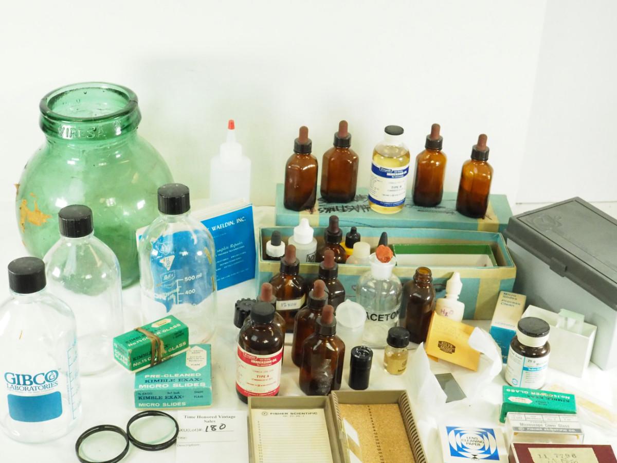 Lot 180 Veresa vintage green carboy glass Microscope slides, brown bottles, clear lab bottles, microscope lens, cleaning papers, solutions. Interesting vintage microscope items.