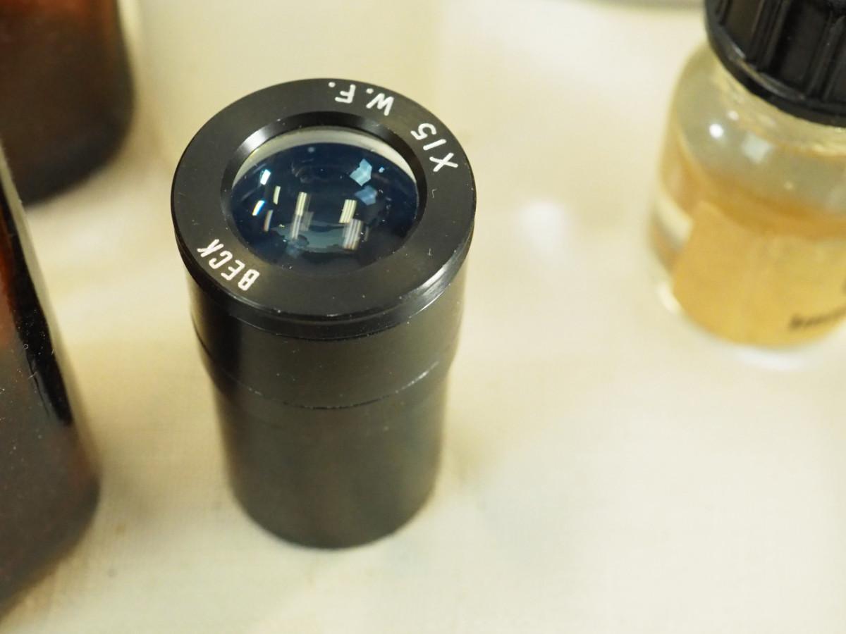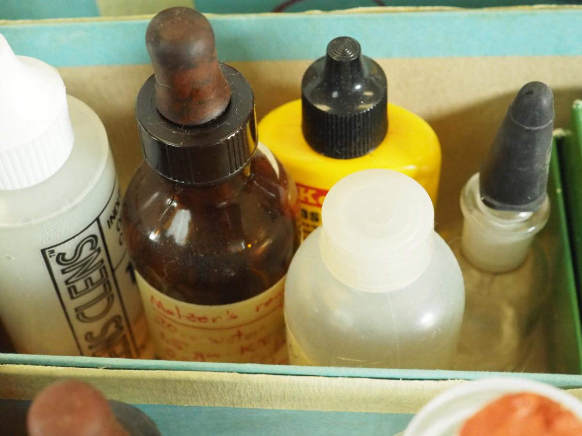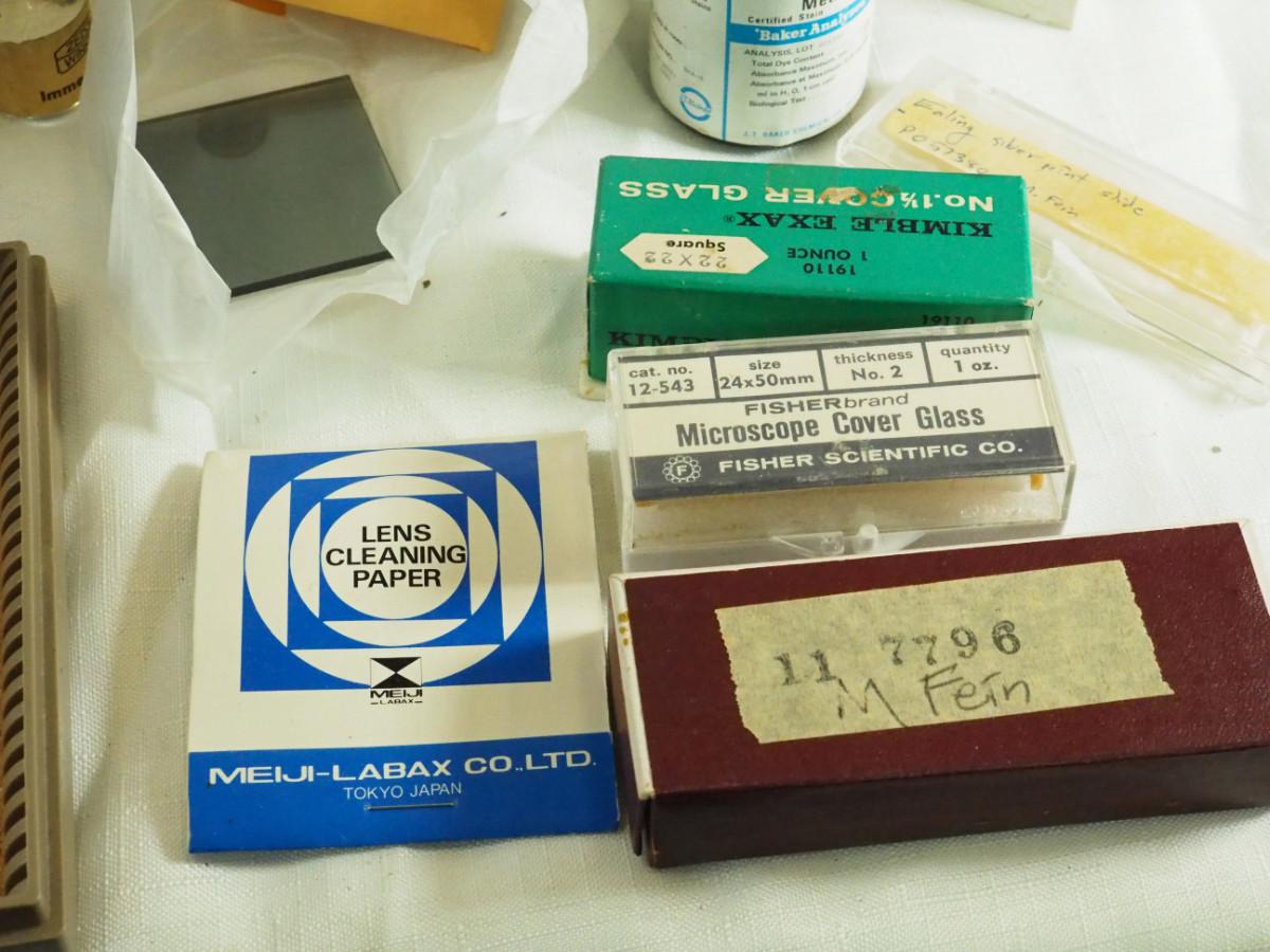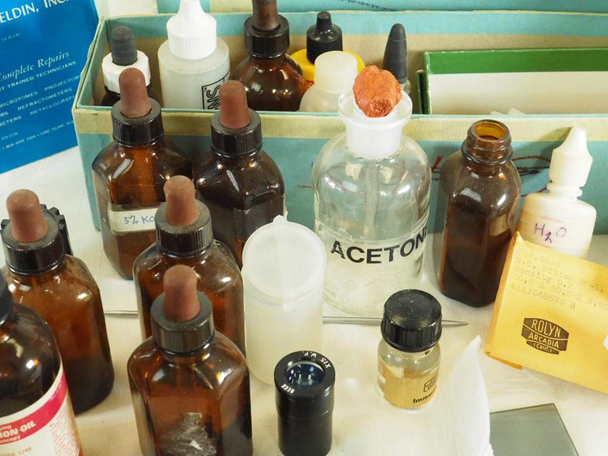 Lot 180 Veresa vintage green carboy glass Microscope slides, brown bottles, clear lab bottles, microscope lens, cleaning papers, solutions. Interesting vintage microscope items.