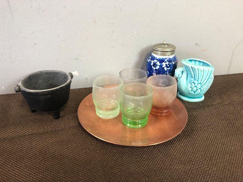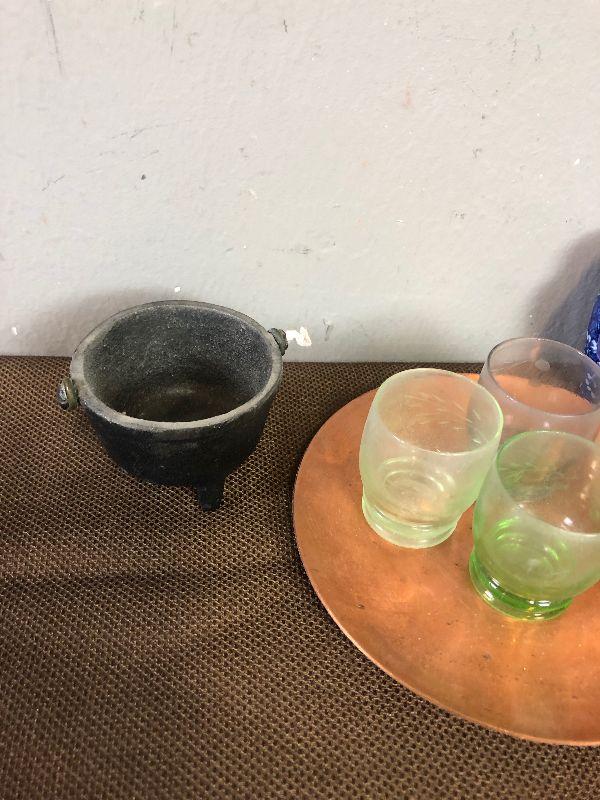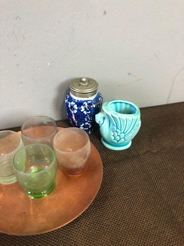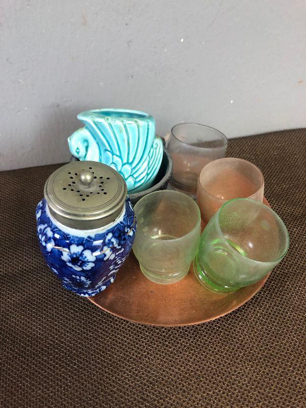 Lot # 180 Vintage Glass, Copper Tray, tooth pick holder