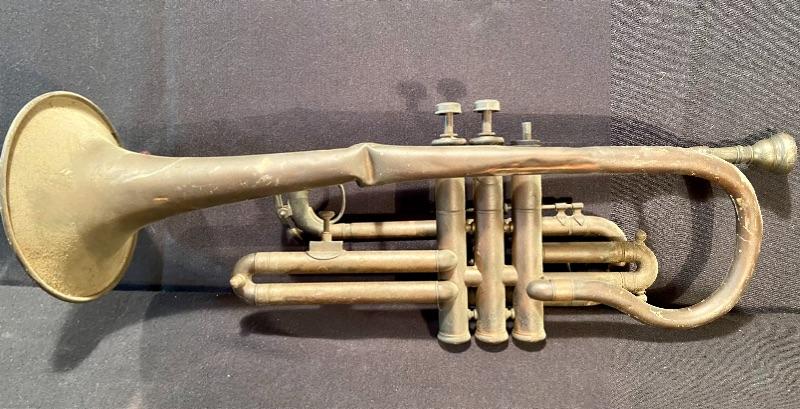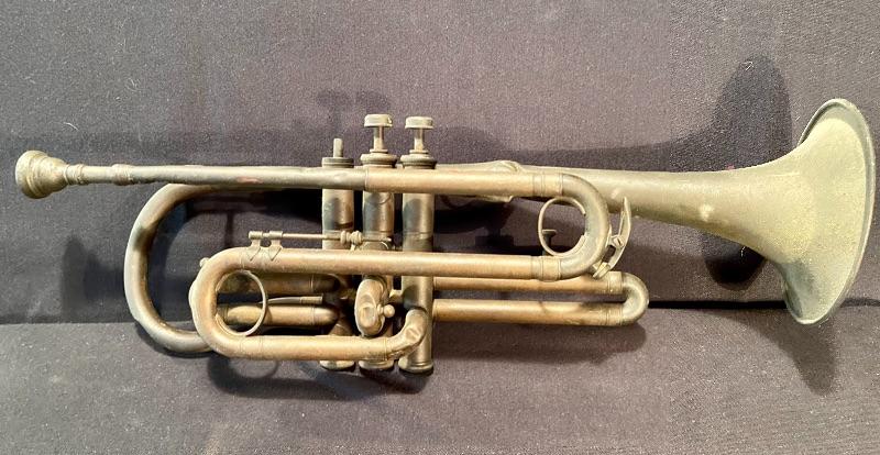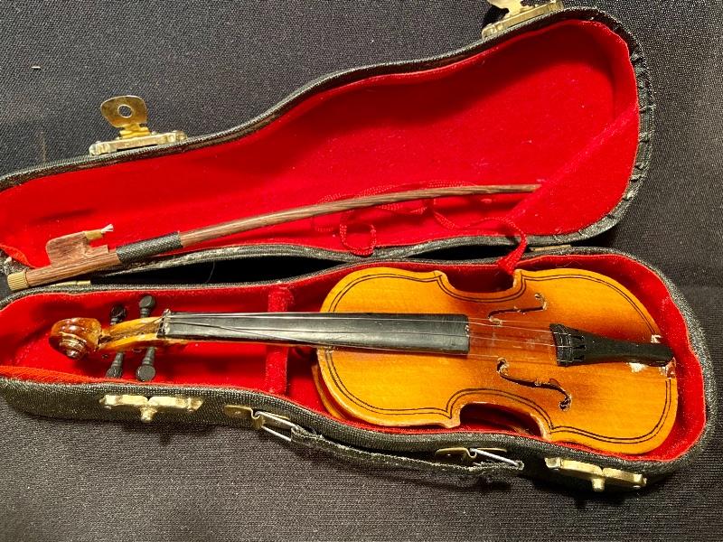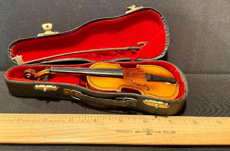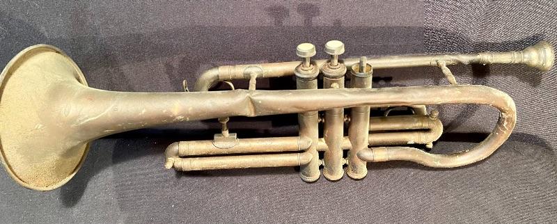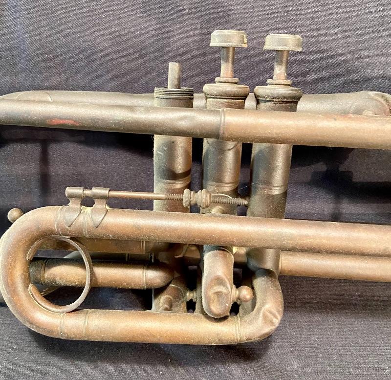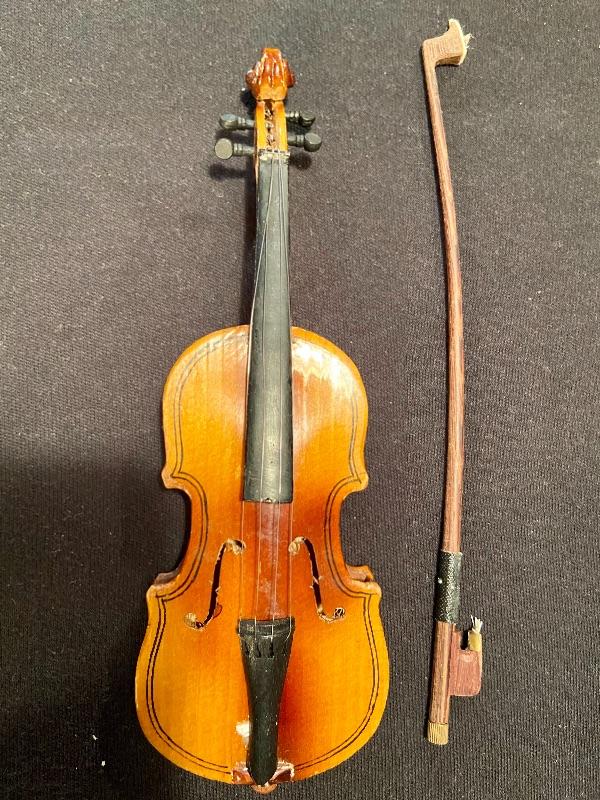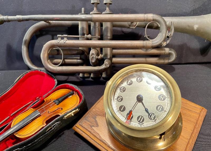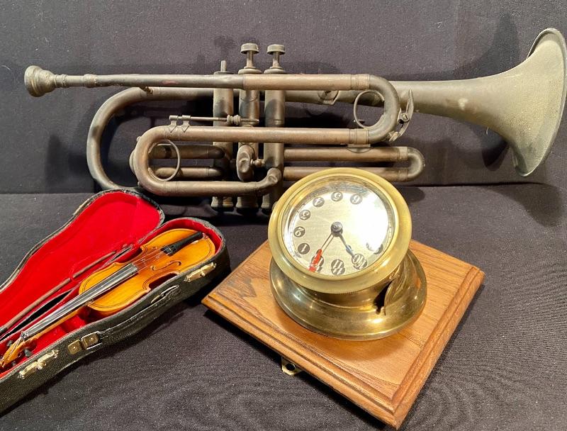 Unique brass vintage New Haven clock untested, (slanted for attaching to an instrument panel) mini violin, and vintage trombone with domaine denting. See pictures for sizing. MHW Please see all pictures for content of the lot, condition of the lot, and measurements if taken. Pictures are the best representation of the items listed and items are untested unless indicated in description. Thank you for looking and have fun bidding!