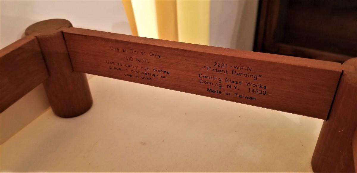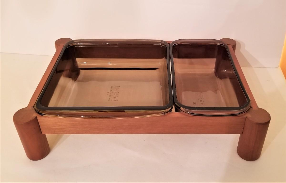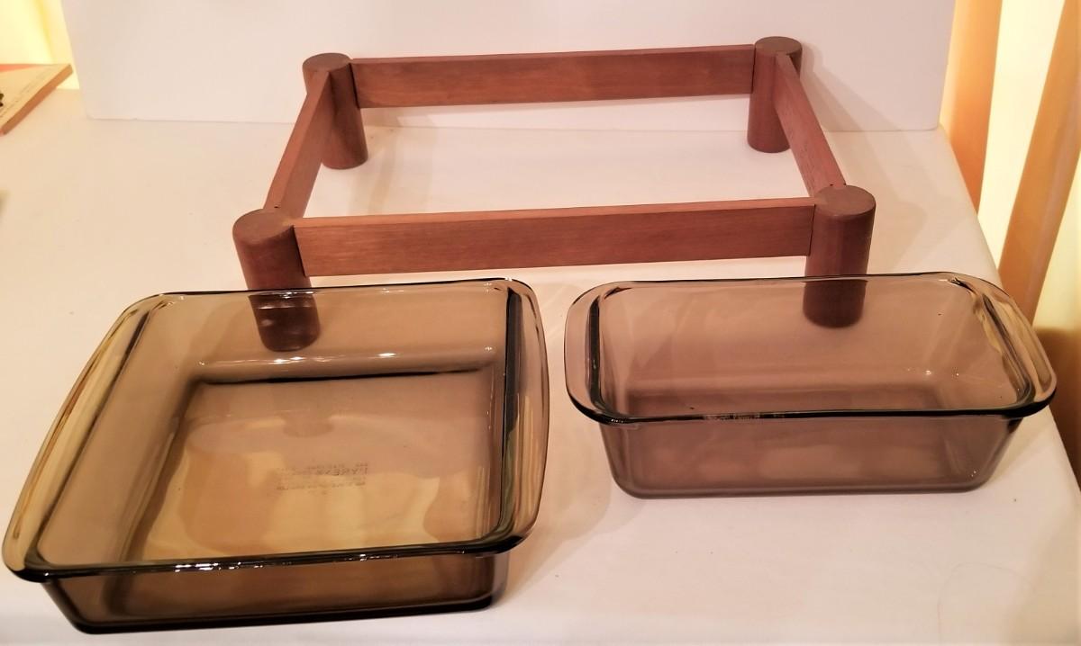 Pyrex casserole and loaf pan in stand - Stand is designed to hold two dishes like this or one larger casserole dish. Stand is marked on the inside and measures 15.5" x 11", 3.5" tall. Good condition.