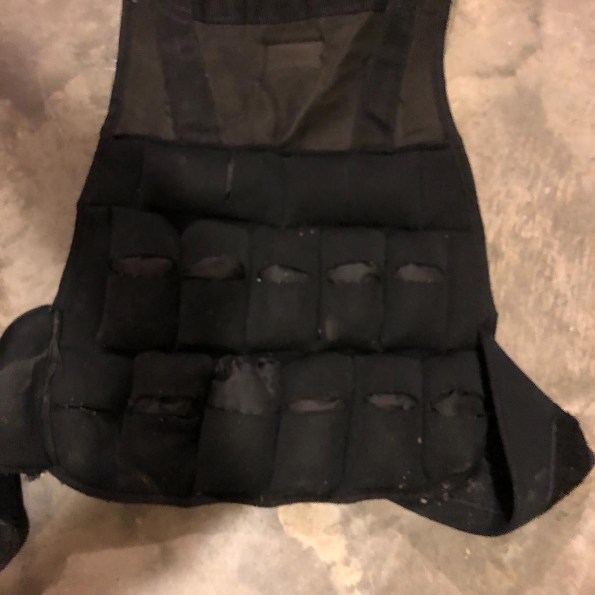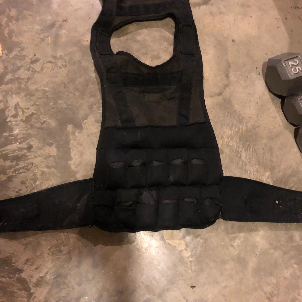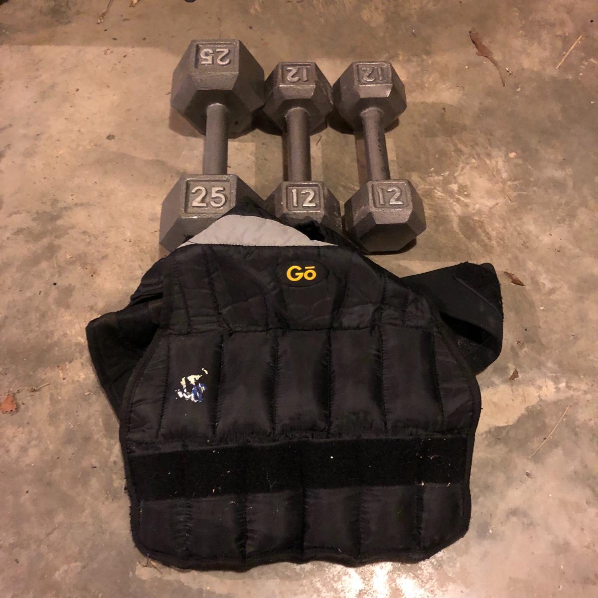 This Go Fit weighted vest has twenty three individual weights that can be removed or added individually. Also includes two 12 pound and one 25 pound metal dumbbells.