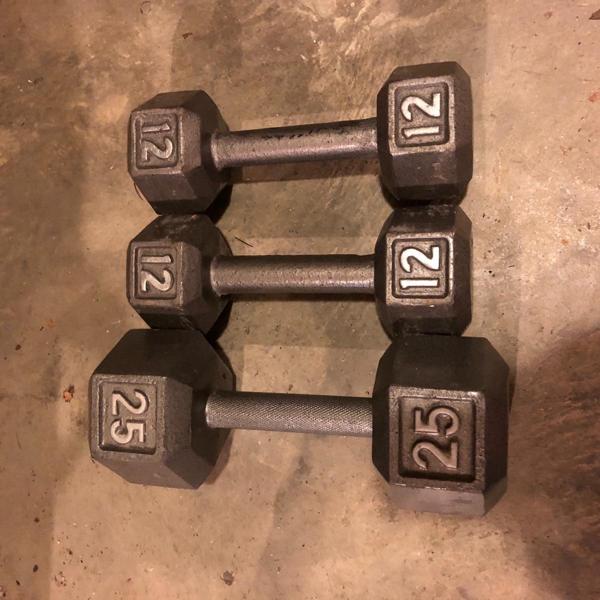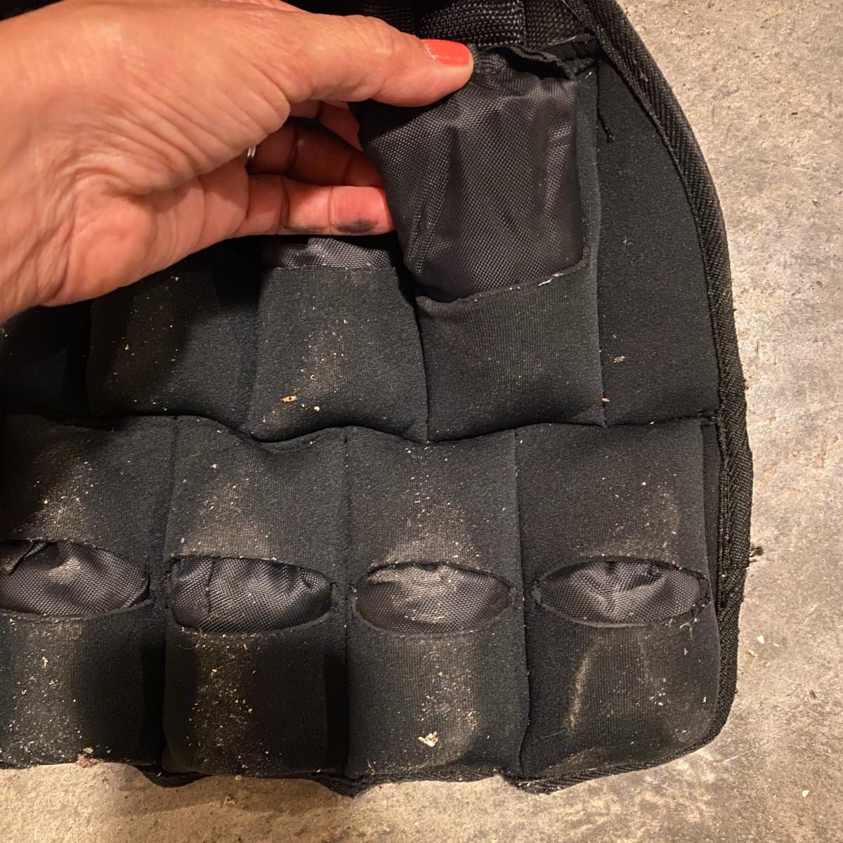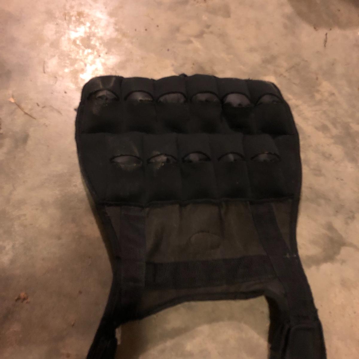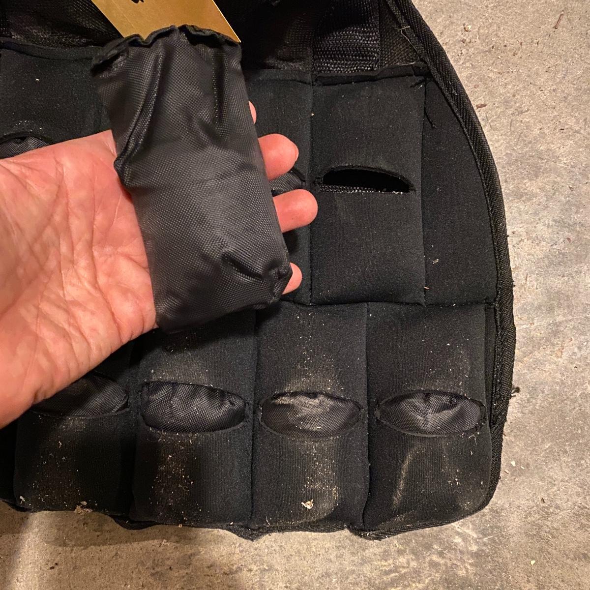 This Go Fit weighted vest has twenty three individual weights that can be removed or added individually. Also includes two 12 pound and one 25 pound metal dumbbells.