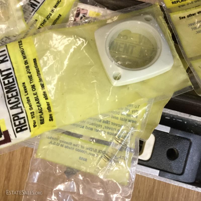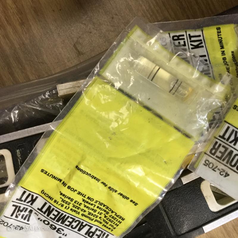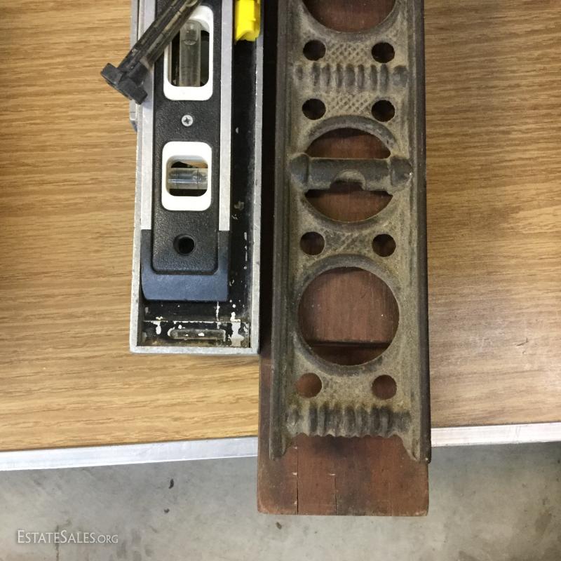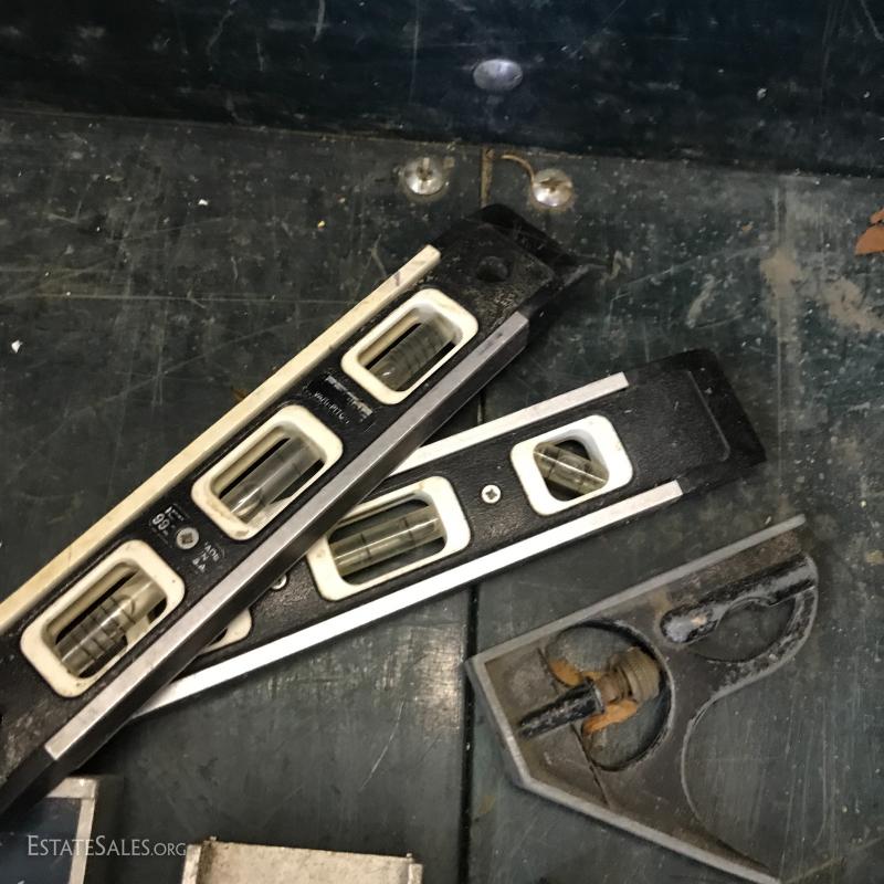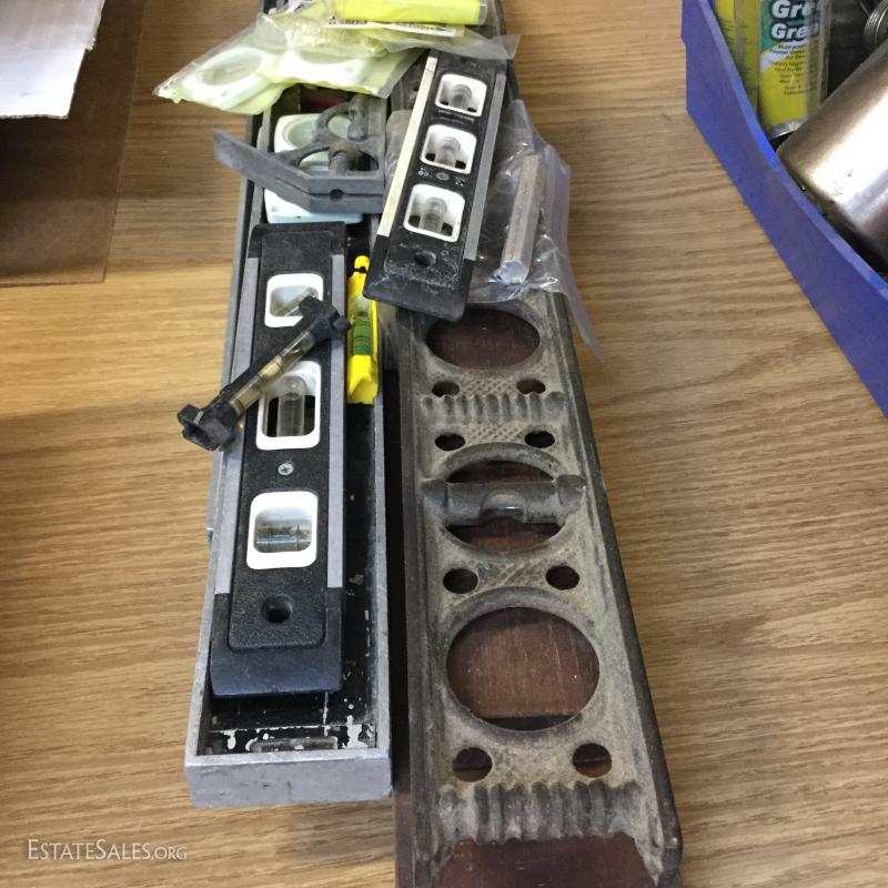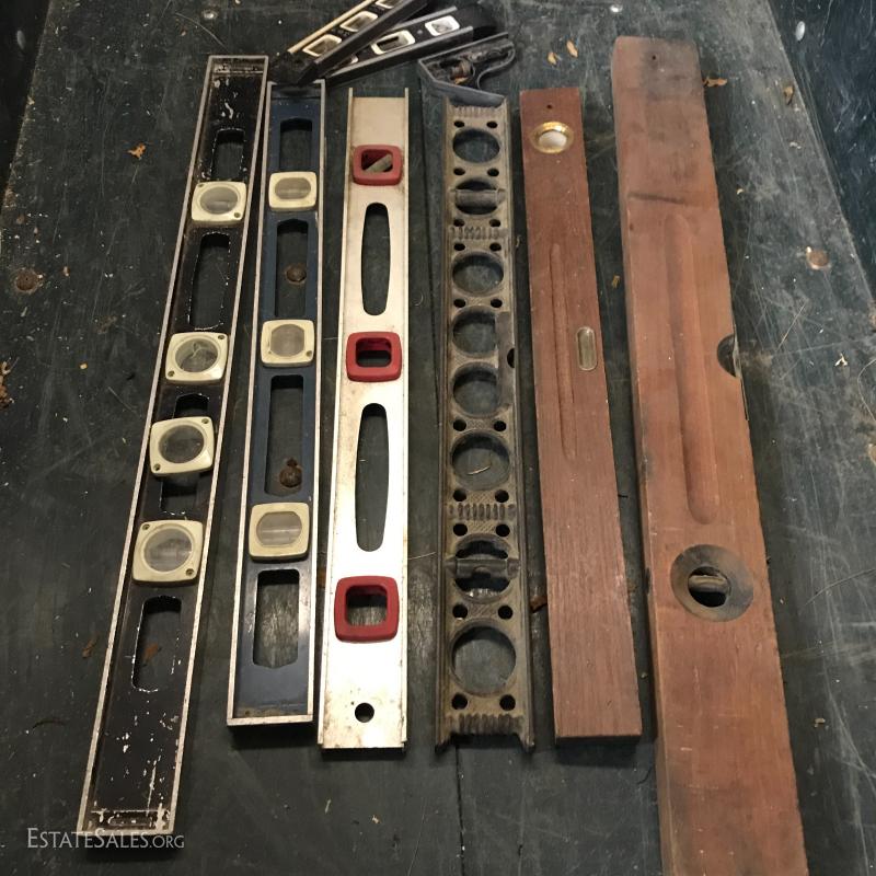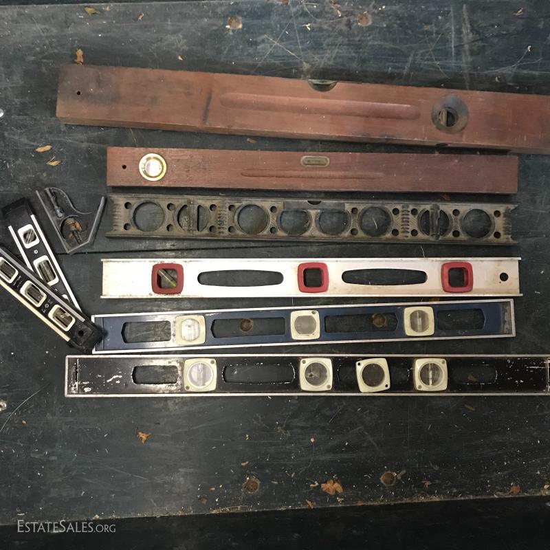 Various sized levels. Two are wood, the rest are metal. Includes replacement pieces.