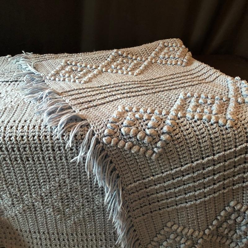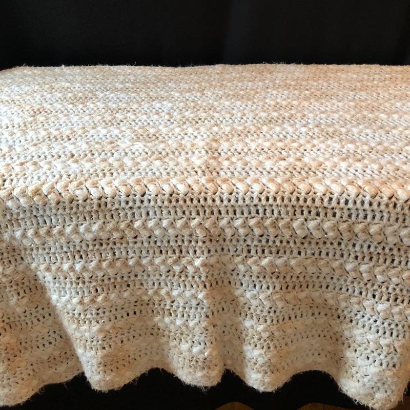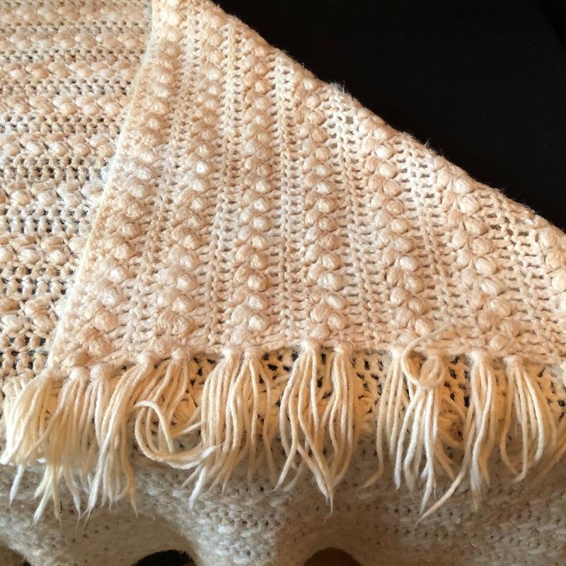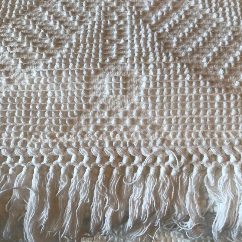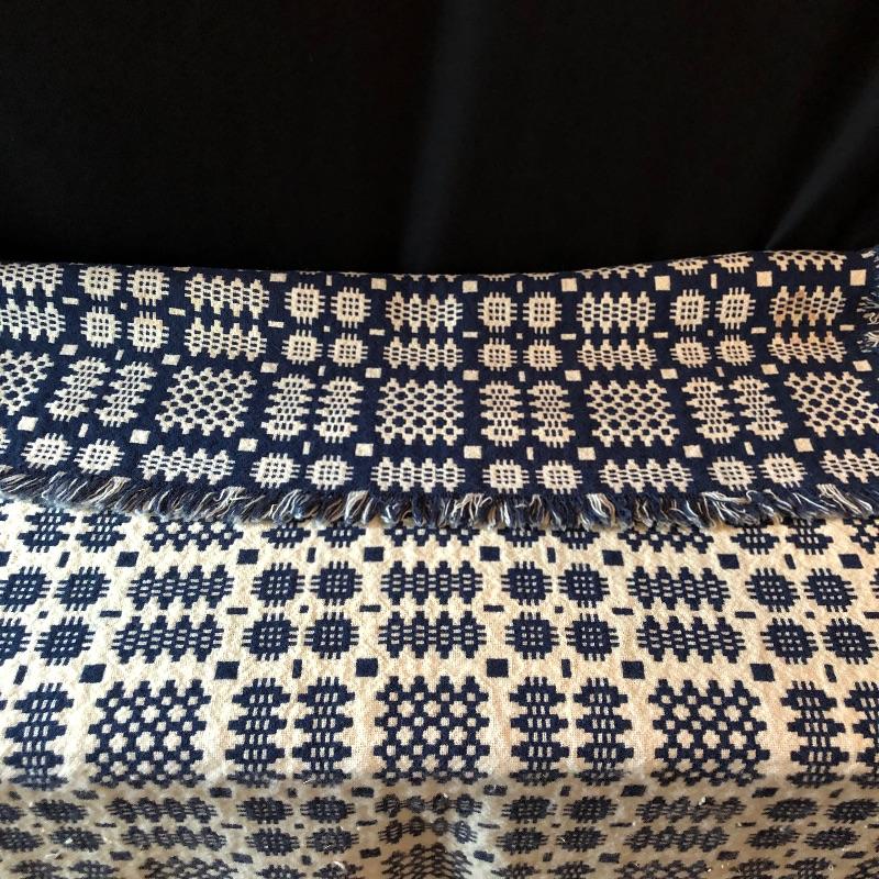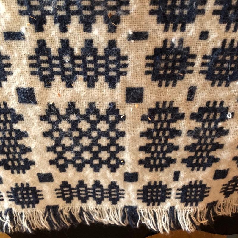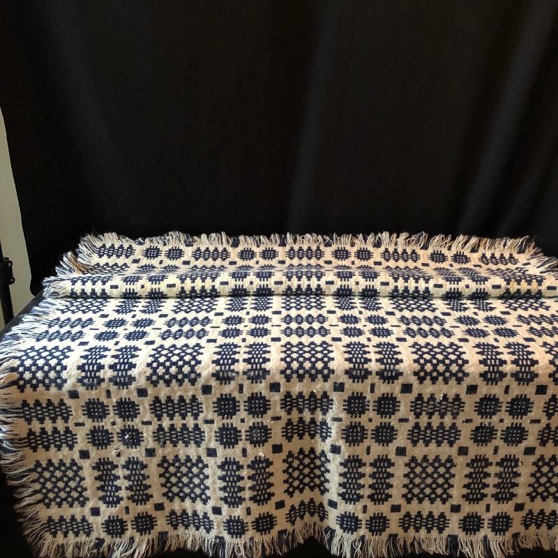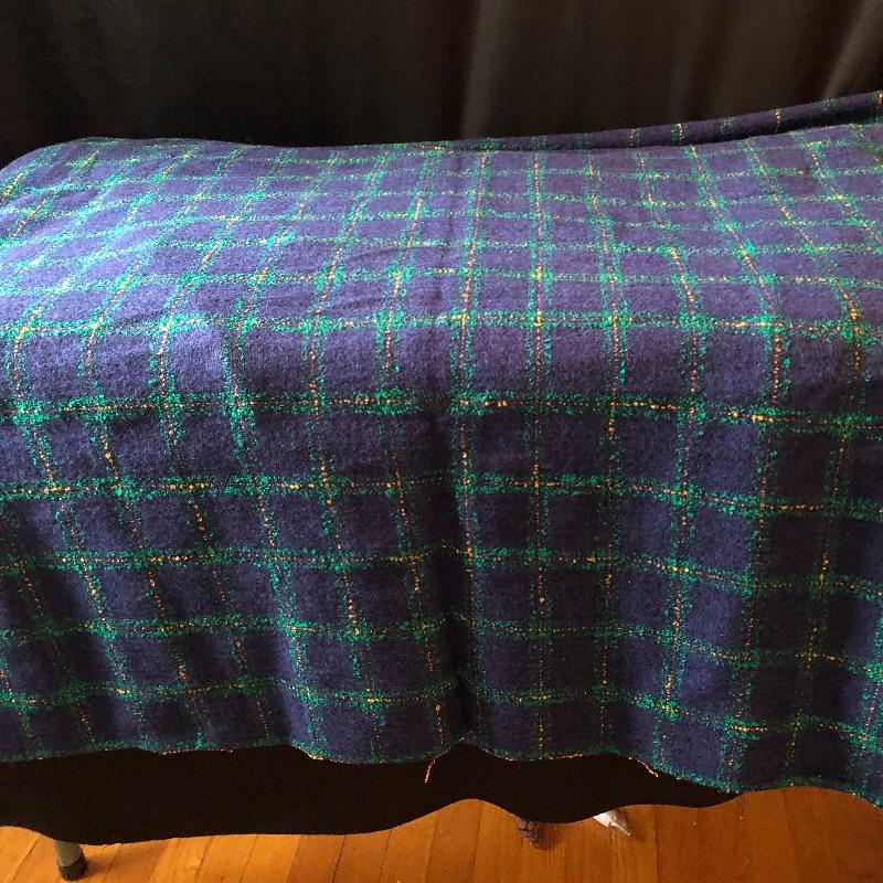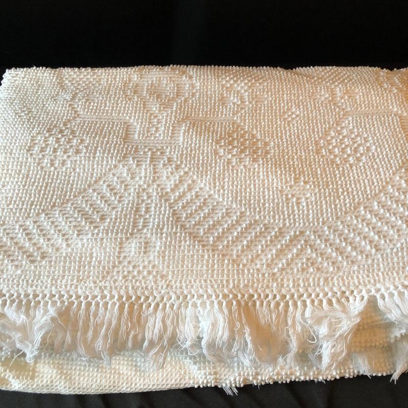 This versatile assortment of blankets, spreads and prayer shawl needs to find its forever home. The blue patterned , reversible wool blanket has a stain -see photos. The delicately patterned white bedspread is a bates George Washington's 50th anniversary Edition, numbered 011505, 100% cotton and crafted in the USA. The largest spread is the blue, green, gold plaid which measures 54" x 216". Zippered throw pillow cover measures approximately 12”sq when flat. Shipping available.