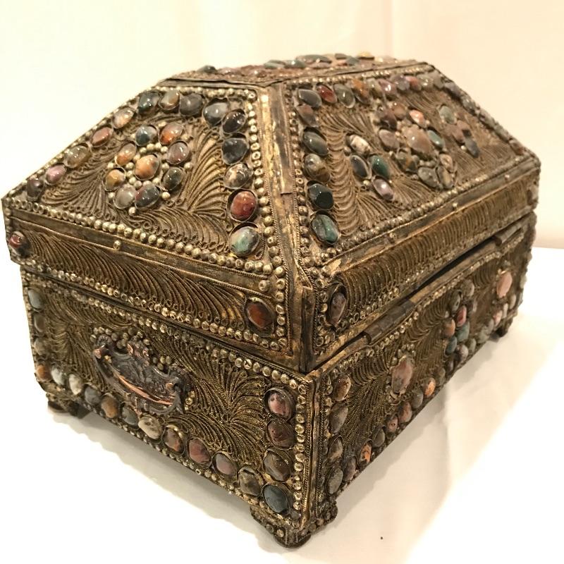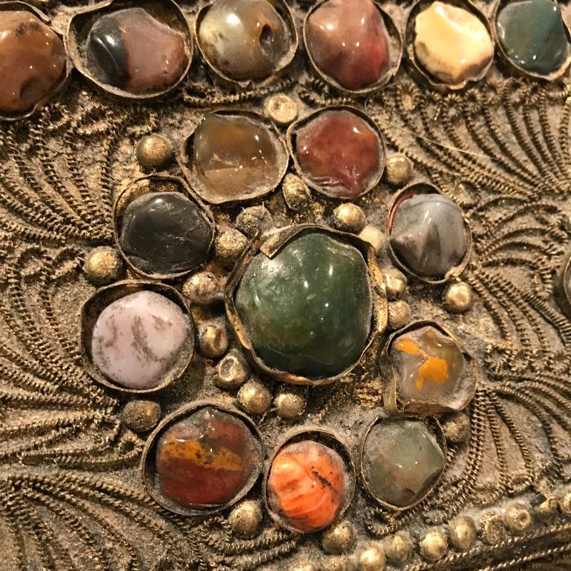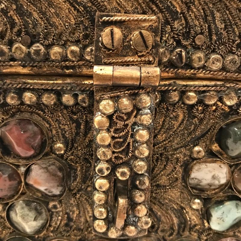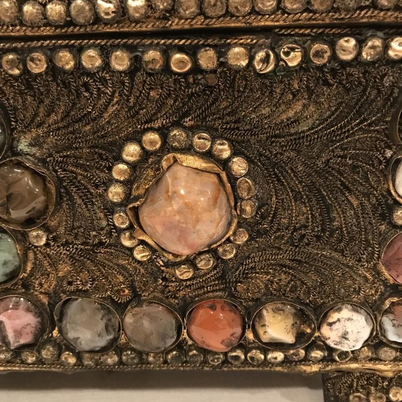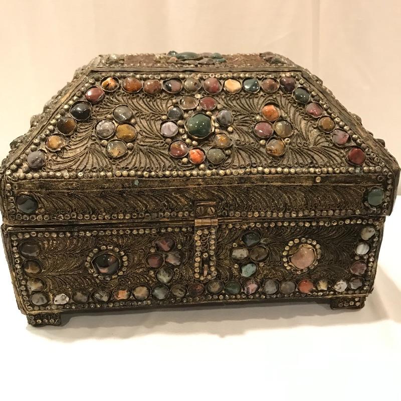 Two unique boxes made of metal, stone and wood. First, a small 4.75” x 3.75” x 3” brass cricket box currently used for potpourri. Next, a conversation starting box with brass or gold-like rope decor surrounding various types of polished stones. Box is lined with black material and decor on outer sides appears painstakingly hand made. This box is gorgeous, but needs a restorative cleaning to be pristine. It measures approximately 12.75” x 9” x 9”. Shipping available.