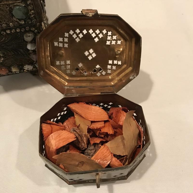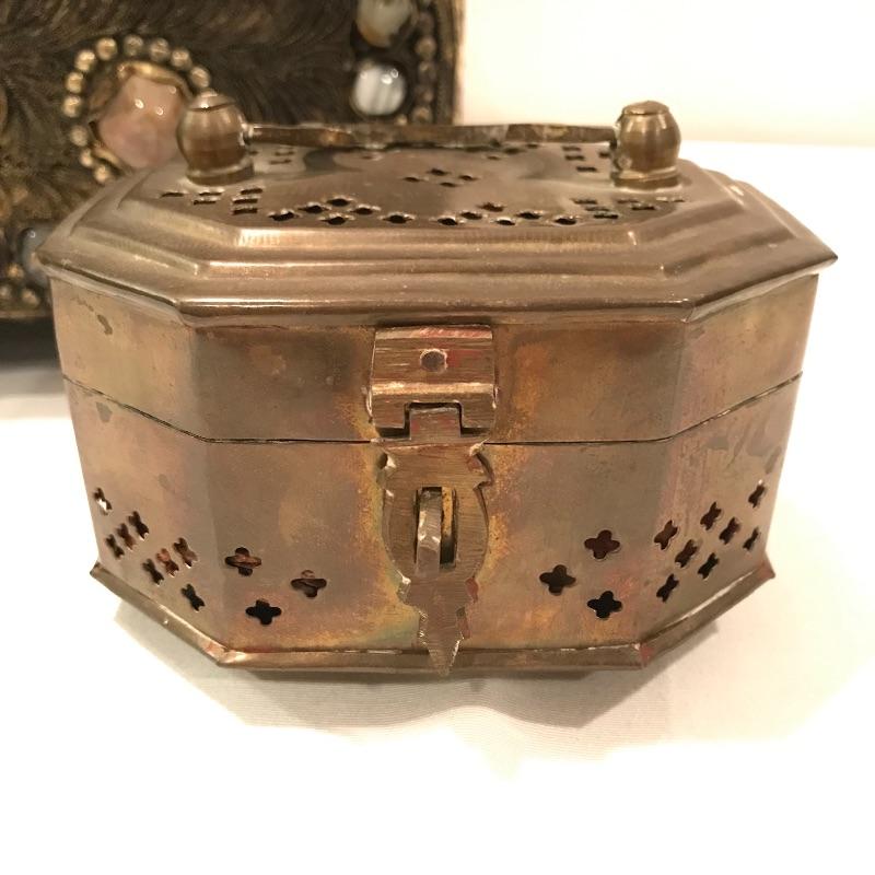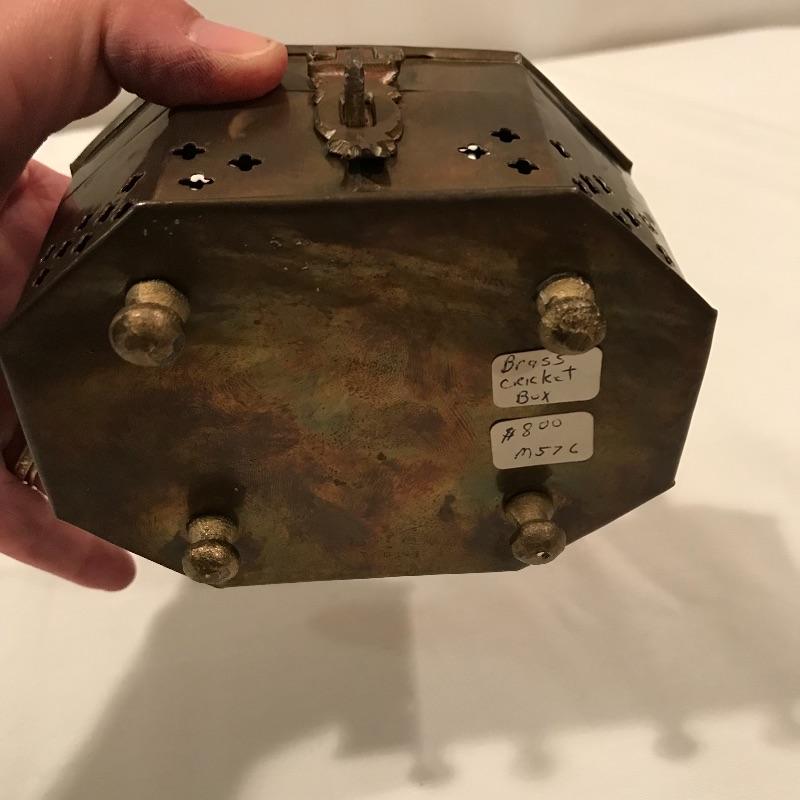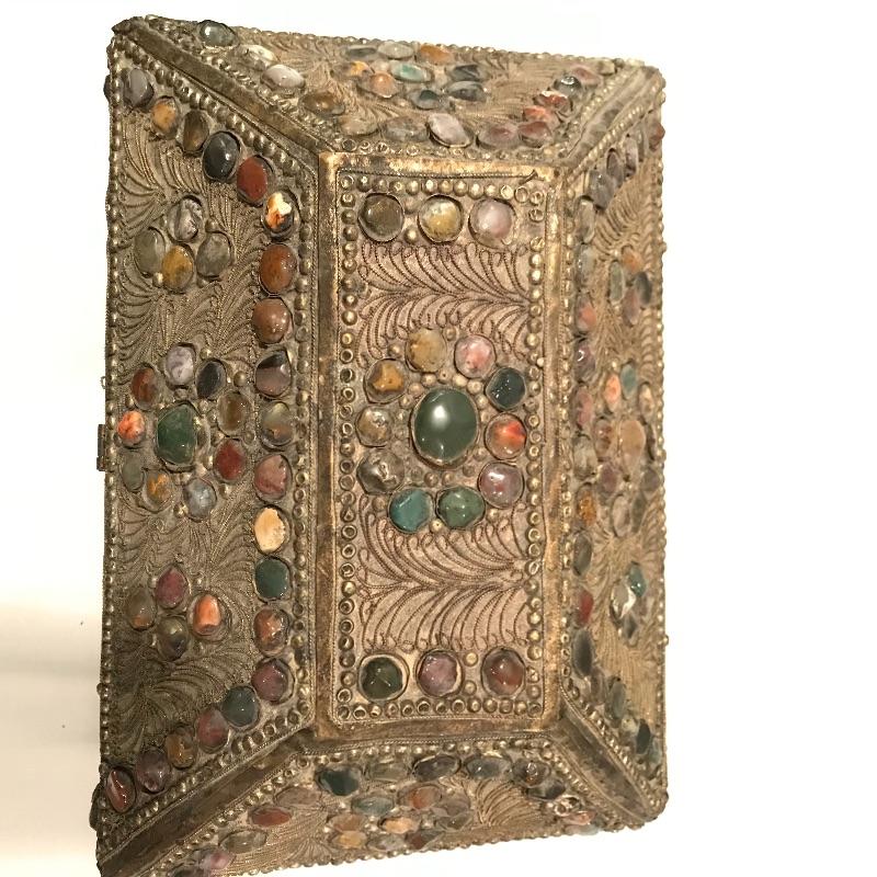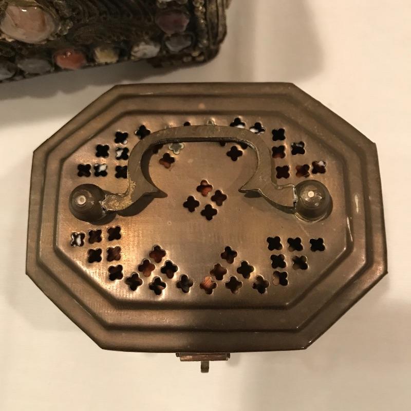 Two unique boxes made of metal, stone and wood. First, a small 4.75” x 3.75” x 3” brass cricket box currently used for potpourri. Next, a conversation starting box with brass or gold-like rope decor surrounding various types of polished stones. Box is lined with black material and decor on outer sides appears painstakingly hand made. This box is gorgeous, but needs a restorative cleaning to be pristine. It measures approximately 12.75” x 9” x 9”. Shipping available.
