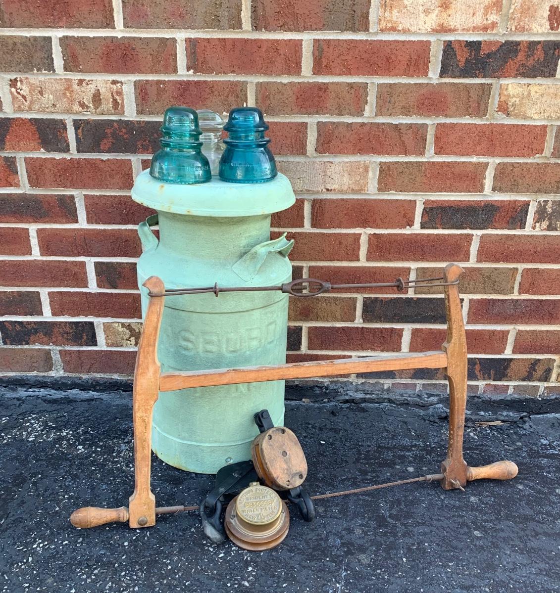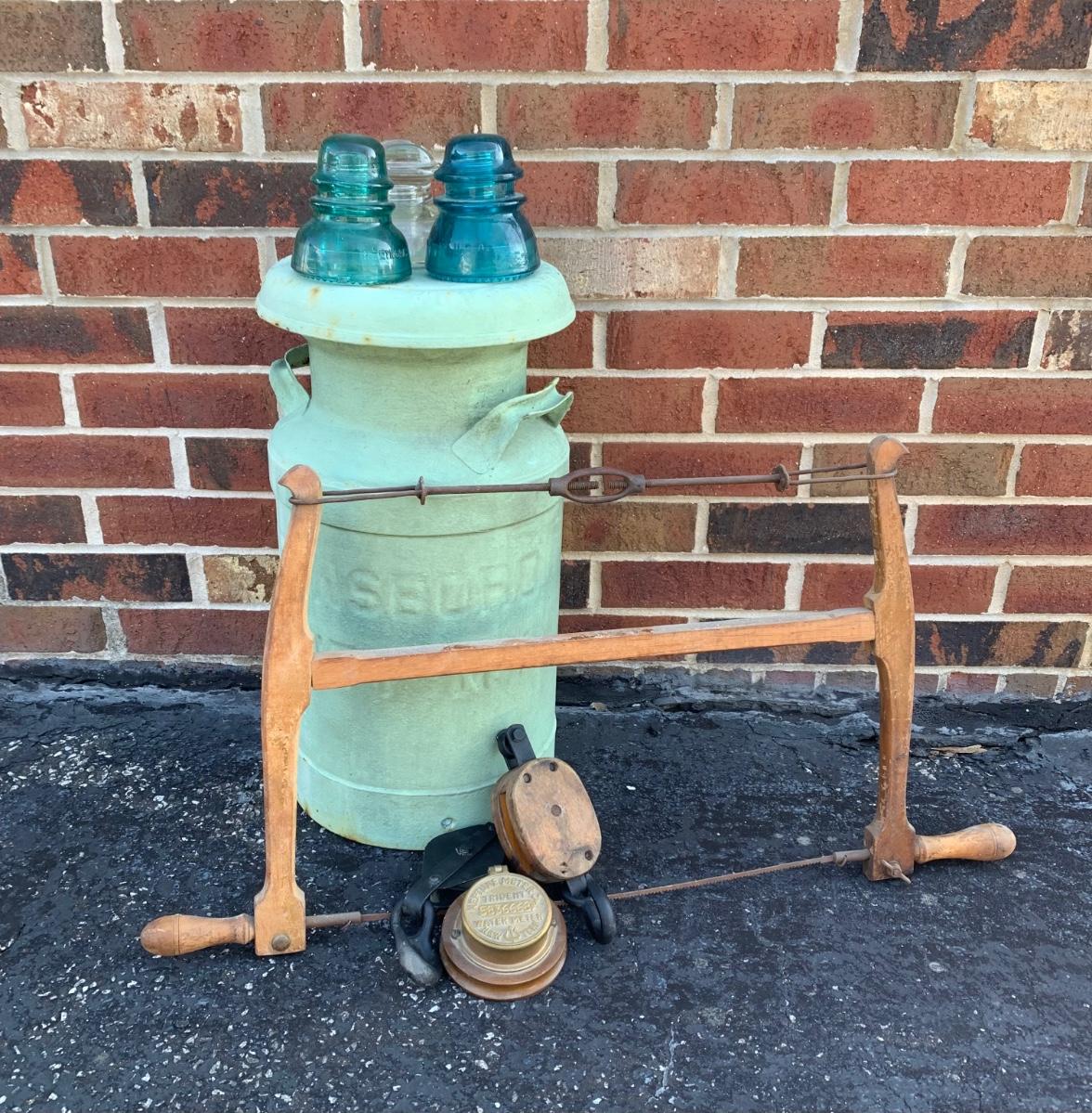 Lot 180R: Vintage Milk Can, Insulators, Pulleys, Hand Saw & More