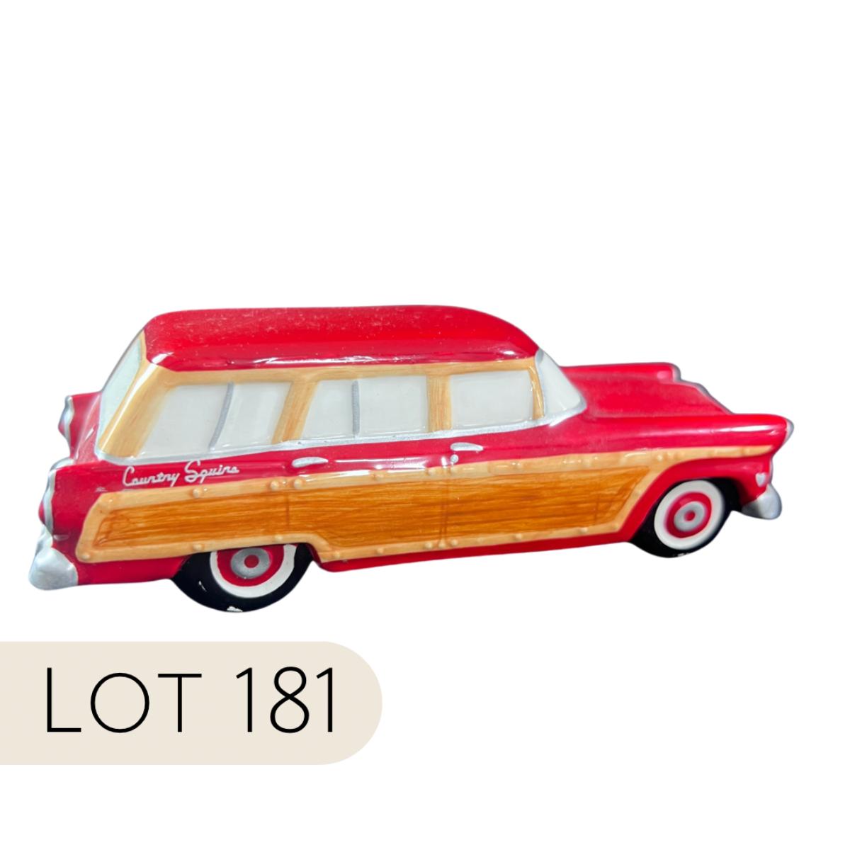 Look at that beaut’! A Classic car, the 1955 Ford Country Squire. Forever immortalized in ceramic. Car looks to be in great used condition. Please see photos for details and condition. ::: Shipping is available on this lot. If you require shipping you must let us know at the close of the auction. We will coordinate with you after the item has been won. Shipping fees will include insurance up to or exceeding the value of all items being mailed. If you have any questions regarding this lot please contact the auctioneer either via this website, by direct email or by phone. PICK UP TIMES and other important information can be found in the TERMS and DESCRIPTION of the auction. Please take a look for pertinent information. Thanks! Any condition statement is given as a courtesy to a client, is an opinion, and should not be treated as a statement of fact. Reference to condition written, oral or within a condition report shall not be regarded as a full account of condition and may not include all defects, alterations, or restorations. Absence of a condition report does not imply a lot is flawless or lacking imperfections or damage. Katherine’s Auction & Appraisal Service shall have no responsibility for any error or omission. Returns shall not be accepted on the basis of condition.
