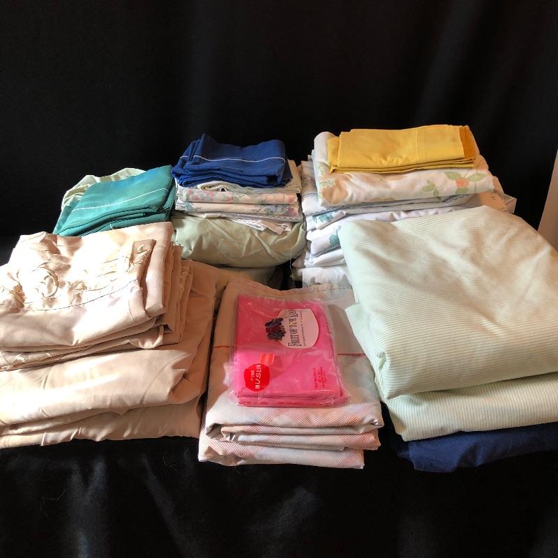 Two Ralph Loren twin fitted sheets, 2 other twin fitted sheets, a 2 pack of pink pillow cases still in package, 2 plaid twin flat sheets, 4 different floral patterned flat sheets, each with matching pillow case, and 4 yellow pillow cases. Local pick up only.