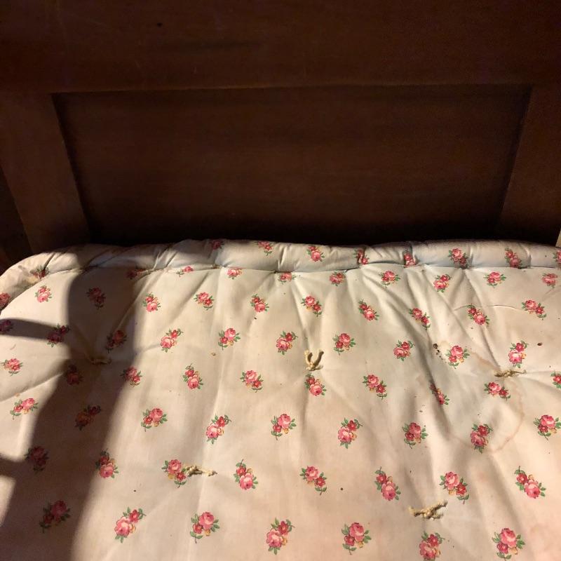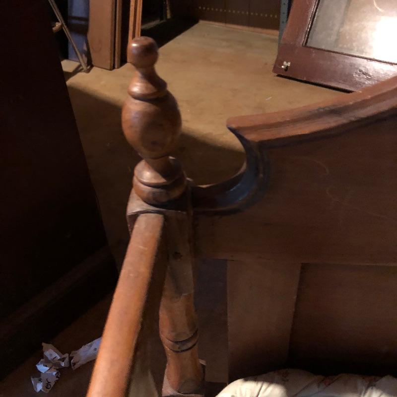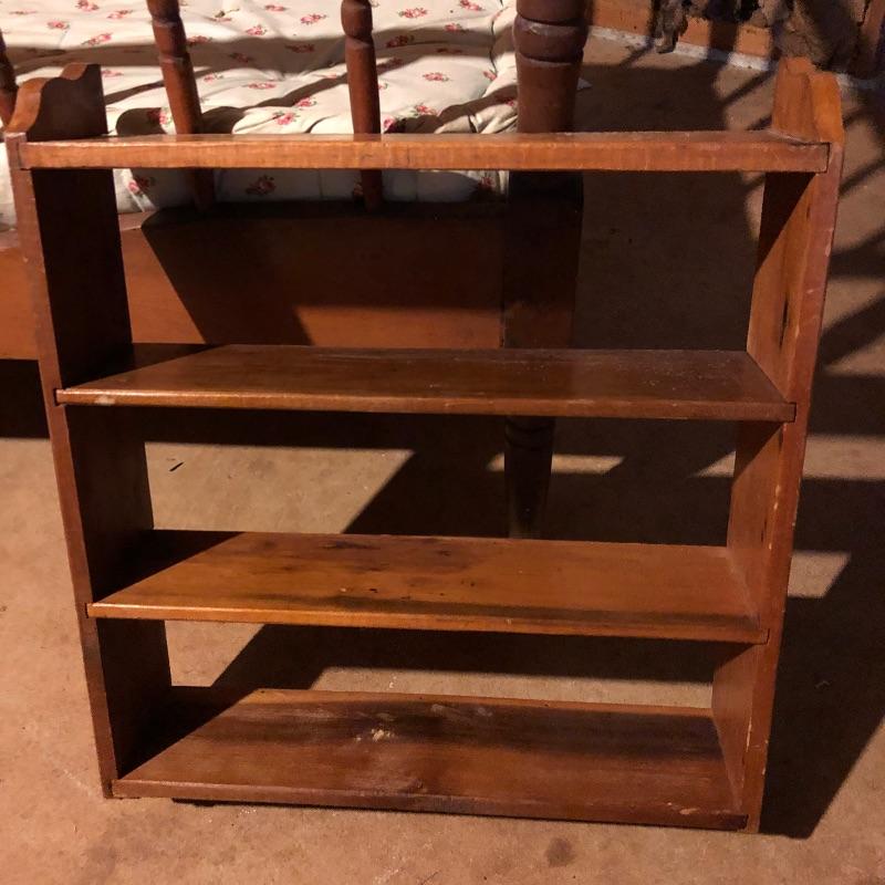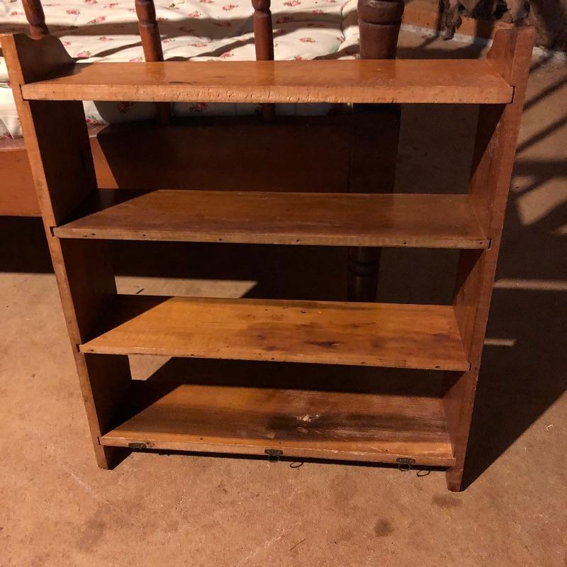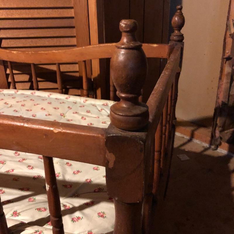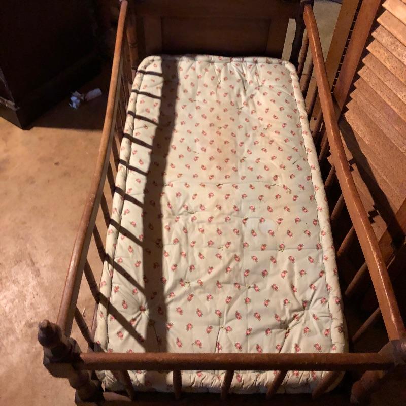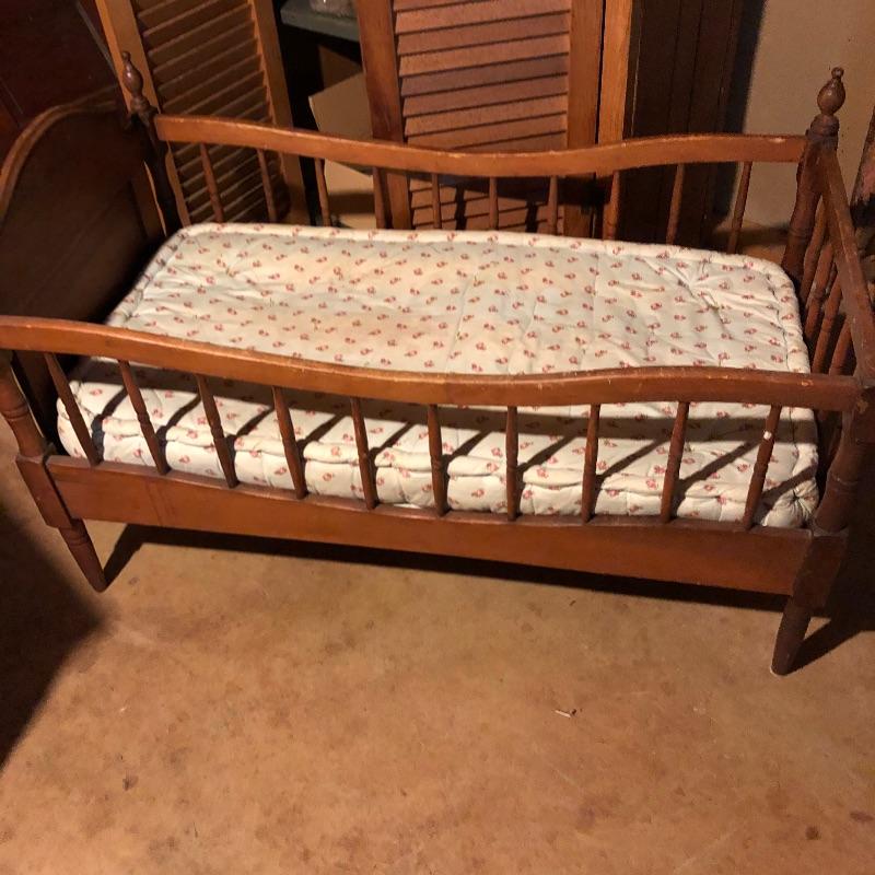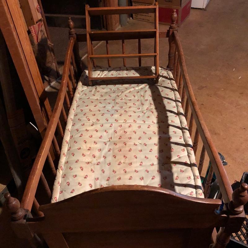 Have a little one on the way? This lot includes a large wooden crib and a small wooden shelf. Use it as decor or for dolls! The bed is about 24” x 46” x 28.75”. . The shelf is about 15.5” x 16” x 4”. Please understand that this is an antique and may not be suitable and safe for babies. No shipping