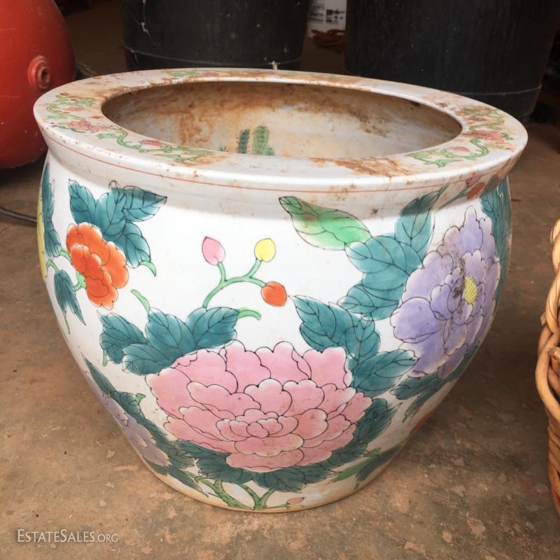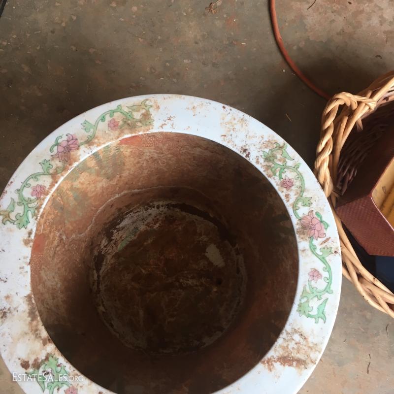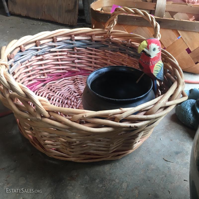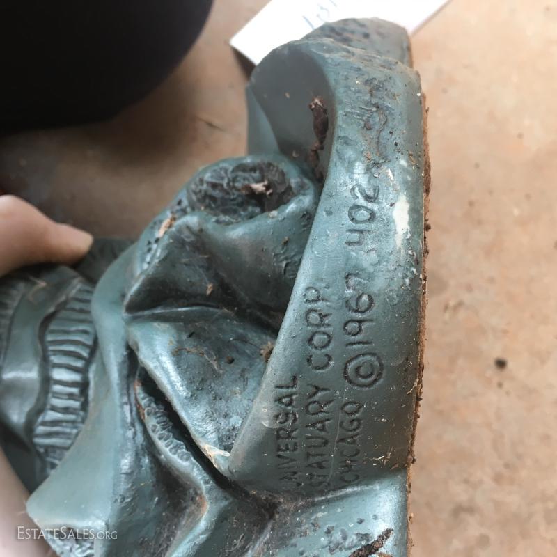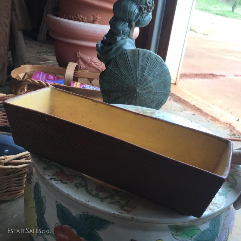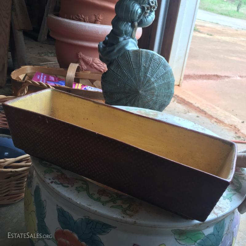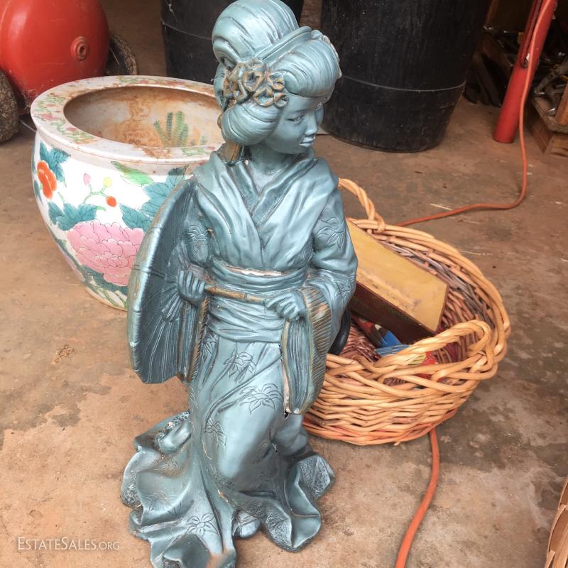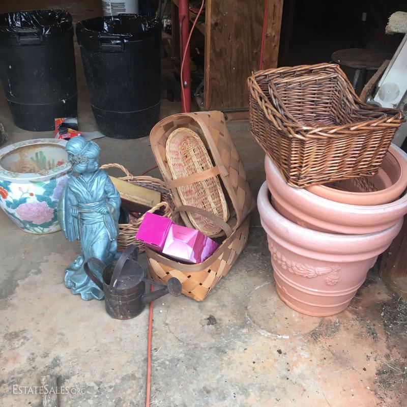 Four faux terra cotta pots, several baskets, Asian woman style statue by Universal Statuary Corp. Chicago 1967, 2 aqua globes (new in box) Pottery dish marked 1906. Statue stands 22” tall and Asian pot is 11’5” tall and 14” diameter. Items available for local pickup in Columbus, NC.