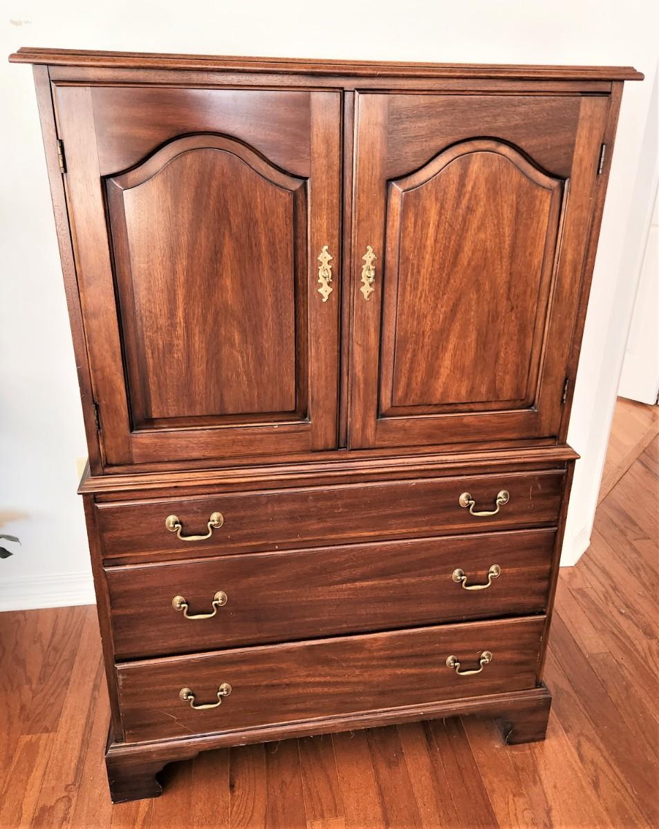 Quality piece of furniture from HENKEL - Gentleman's Chest, 36" across, 55" tall, 21" deep - 3 drawers. Mahogany. Note: back left foot - applied piece has come off - we have the piece, easy repair. Otherwise very good condition.