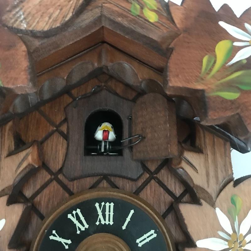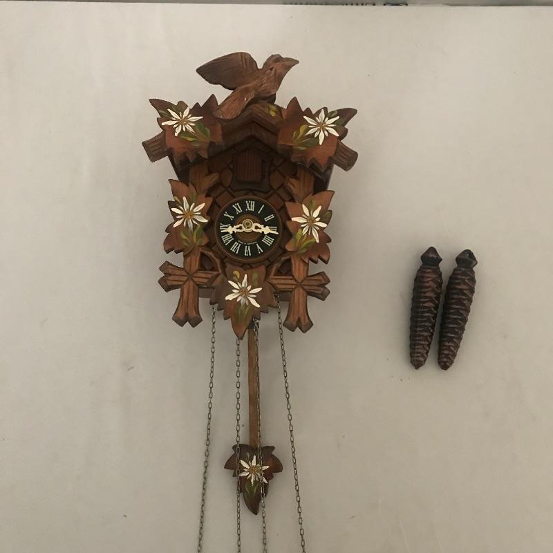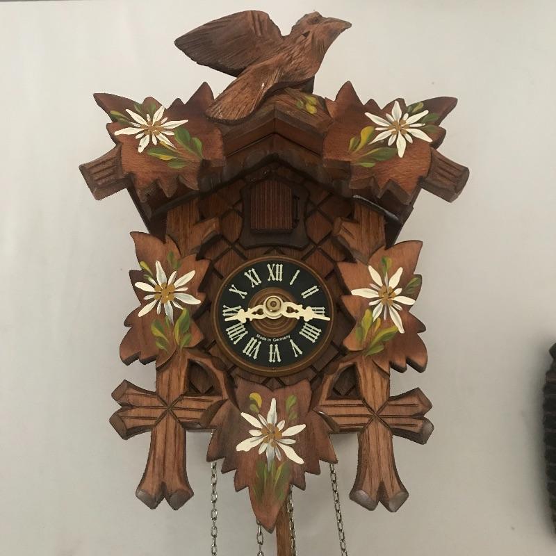 This sweet and cheerful cuckoo clock is in great condition and appears to be in great working order. Weights, pendulum and bird door all in tact. Shipping available.